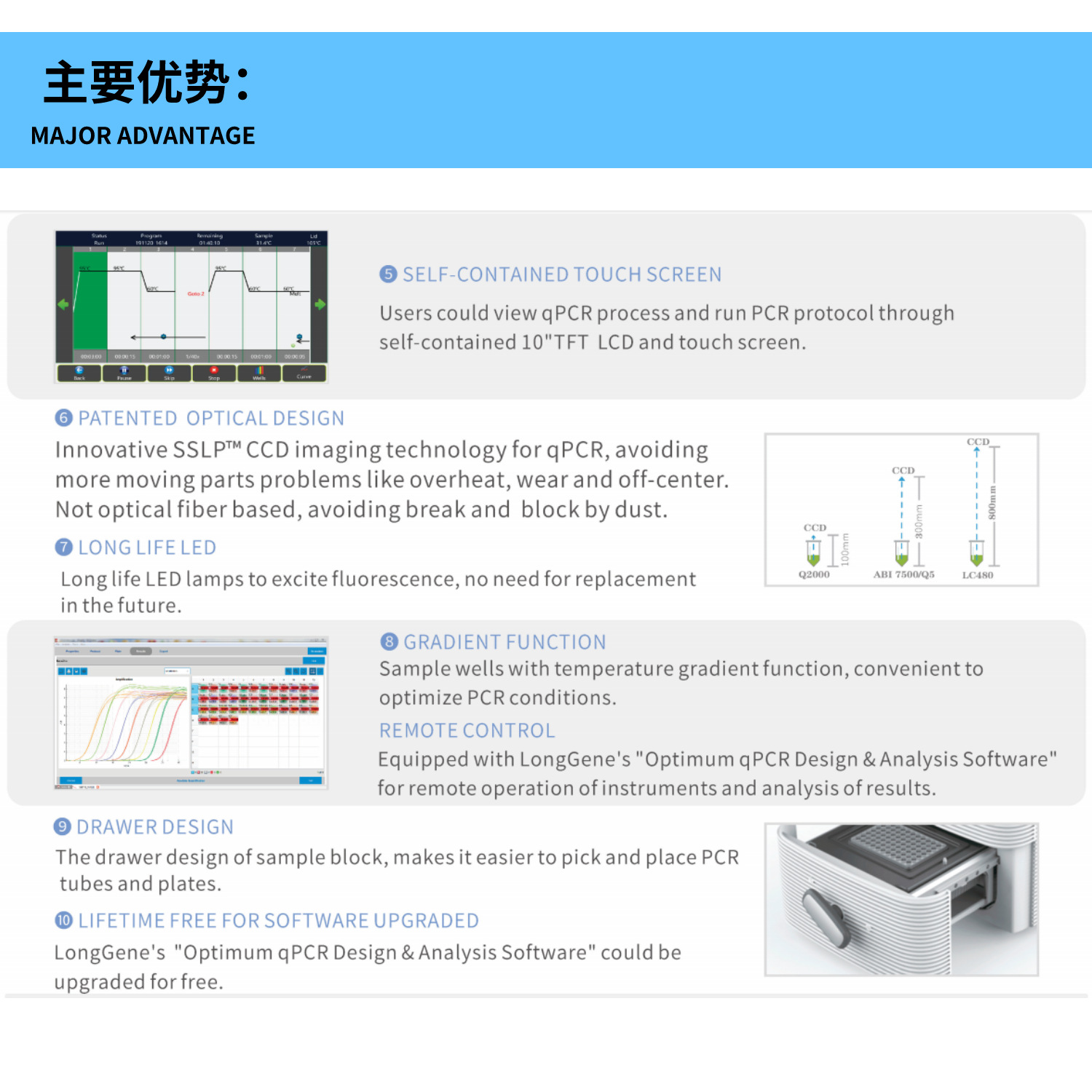 4.自带10“全真彩触控屏。无需电脑连接即可运行和查看实时定量PCR和普通PCR程序;