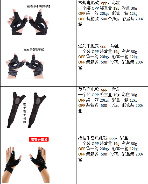 夜光手套,亮度好,在夜晚相当于一个手电,直接佩戴在手上,而不需要像传统手电一样拿着,内置聚合物锂电池,小巧轻便,使用简单,充分解放双手。是户外照明好帮手。