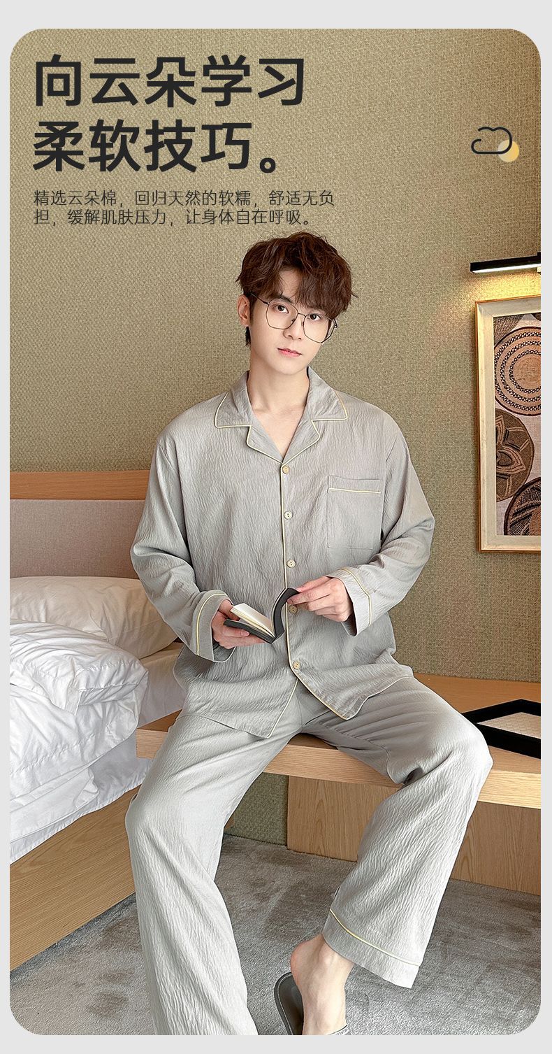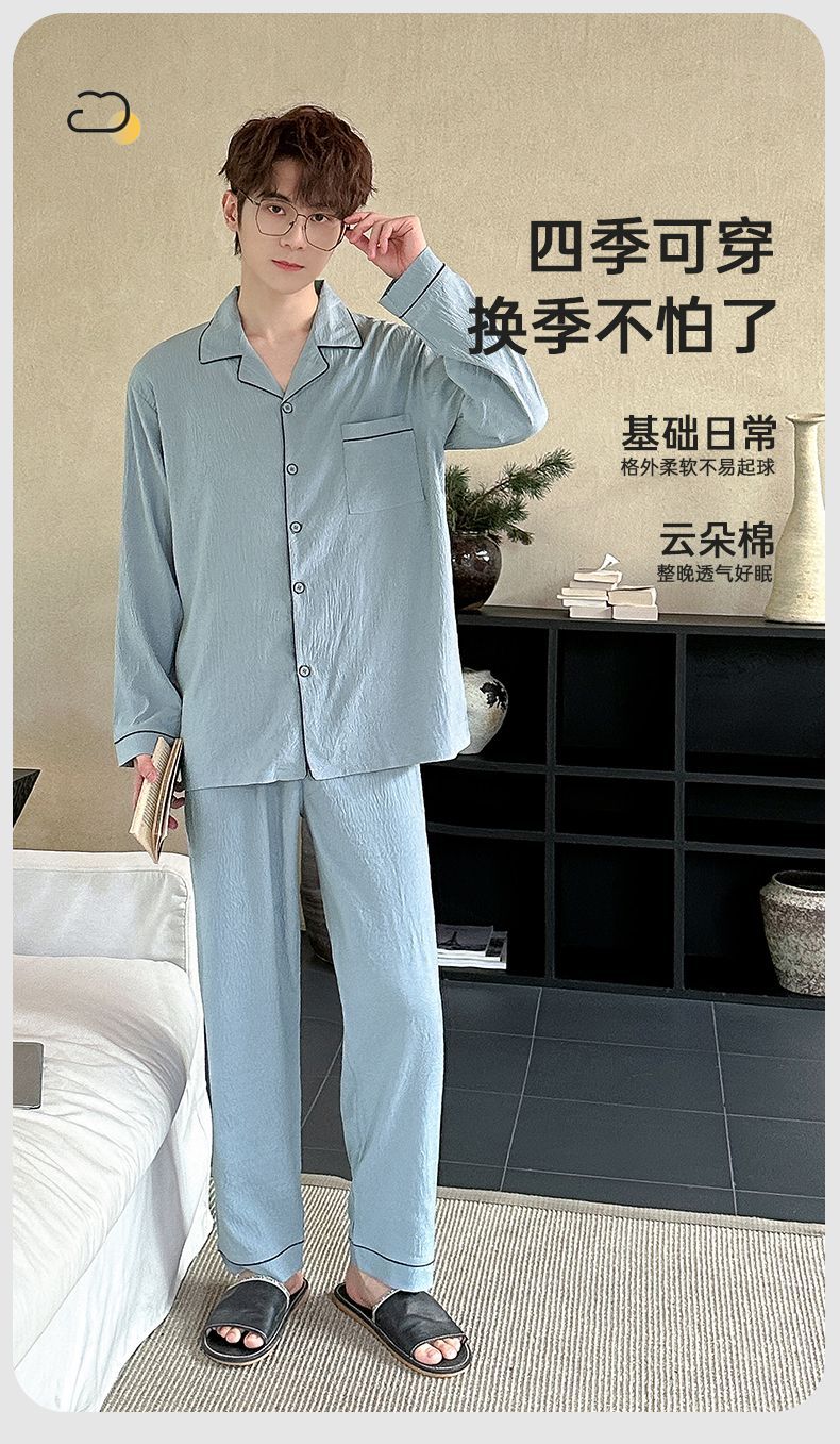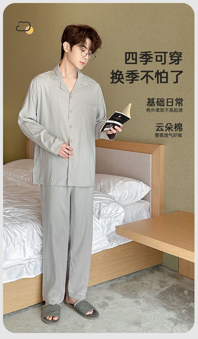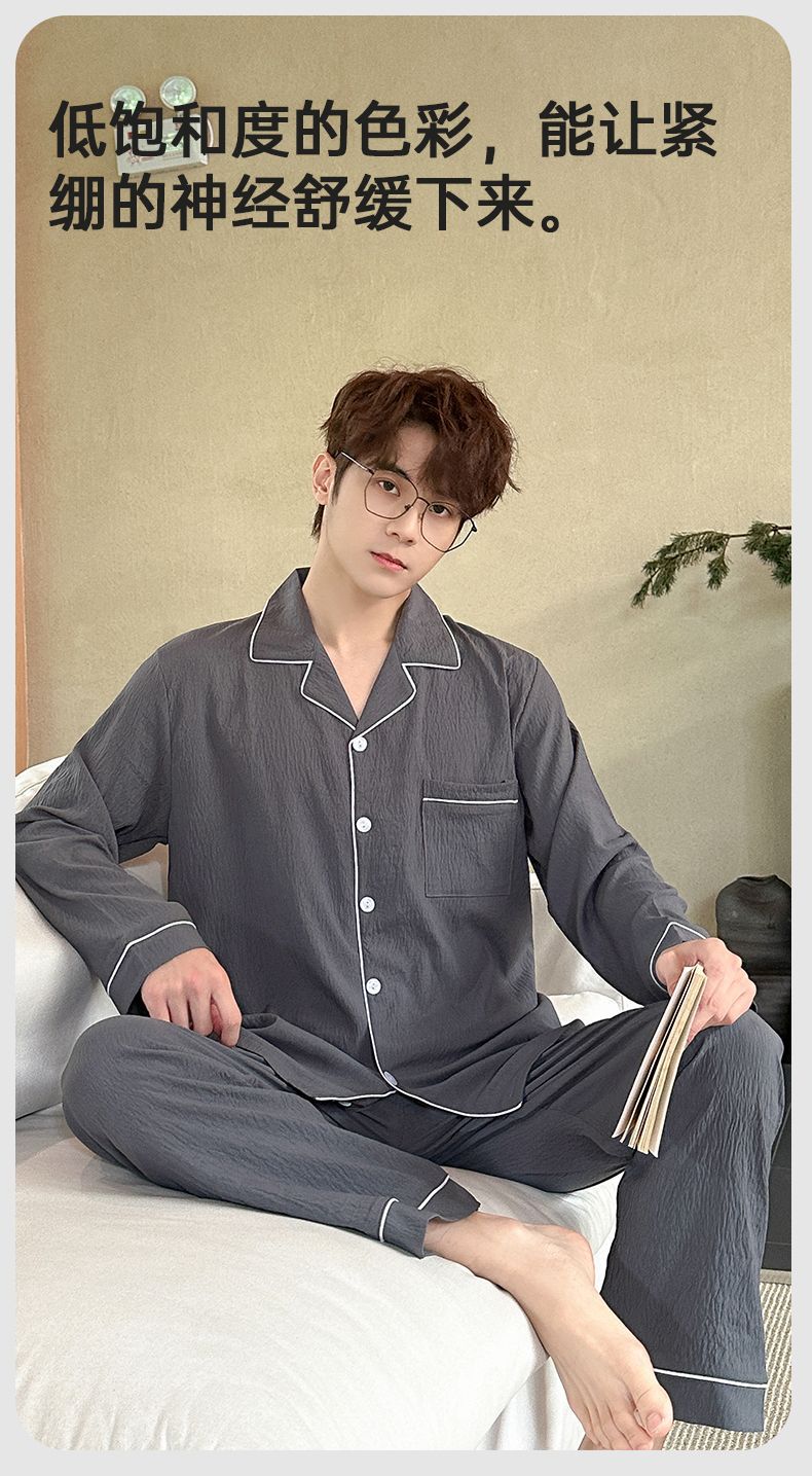 Мужские хлопковые брюки с длинными рукавами, пижамы из двух предметов, весенне-осенний простой однотонный кардиган с лацканами, можно носить вне домашней одежды
