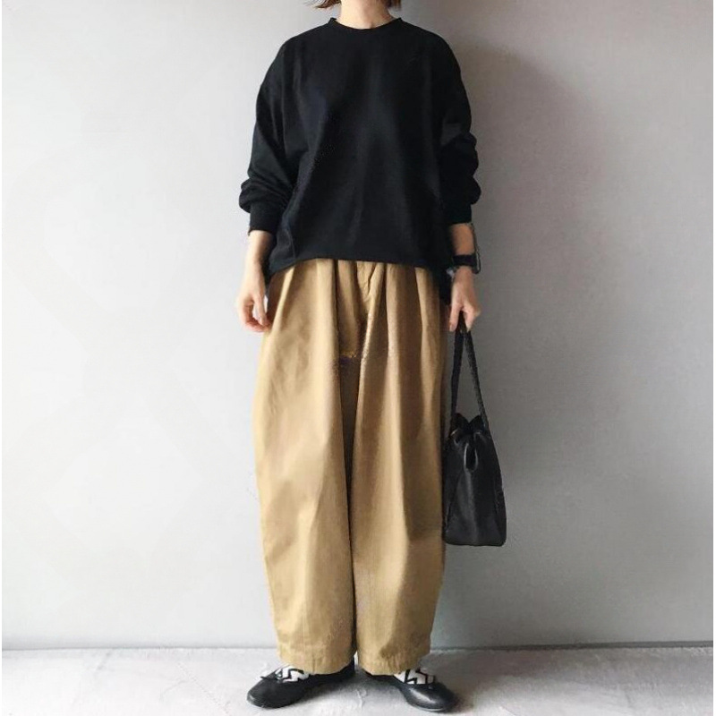 Трансграничный экспорт, весенний новый стиль, черная свободная толстовка с длинными рукавами и круглым вырезом + широкие брюки цвета хаки, комплект из двух предметов для женщин