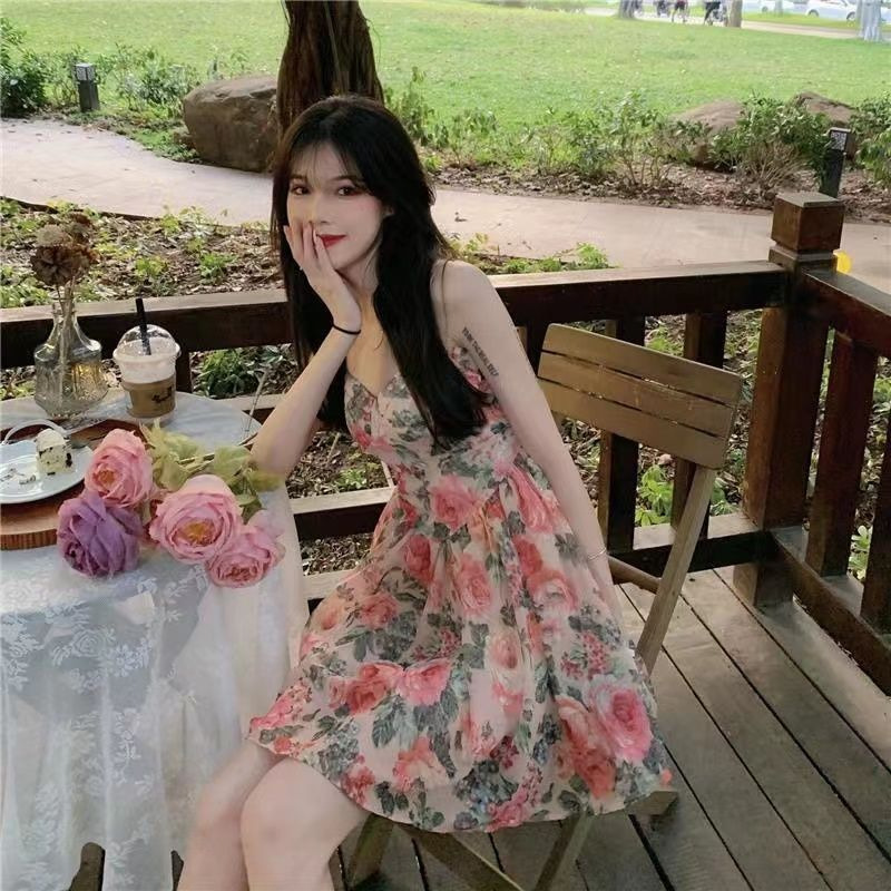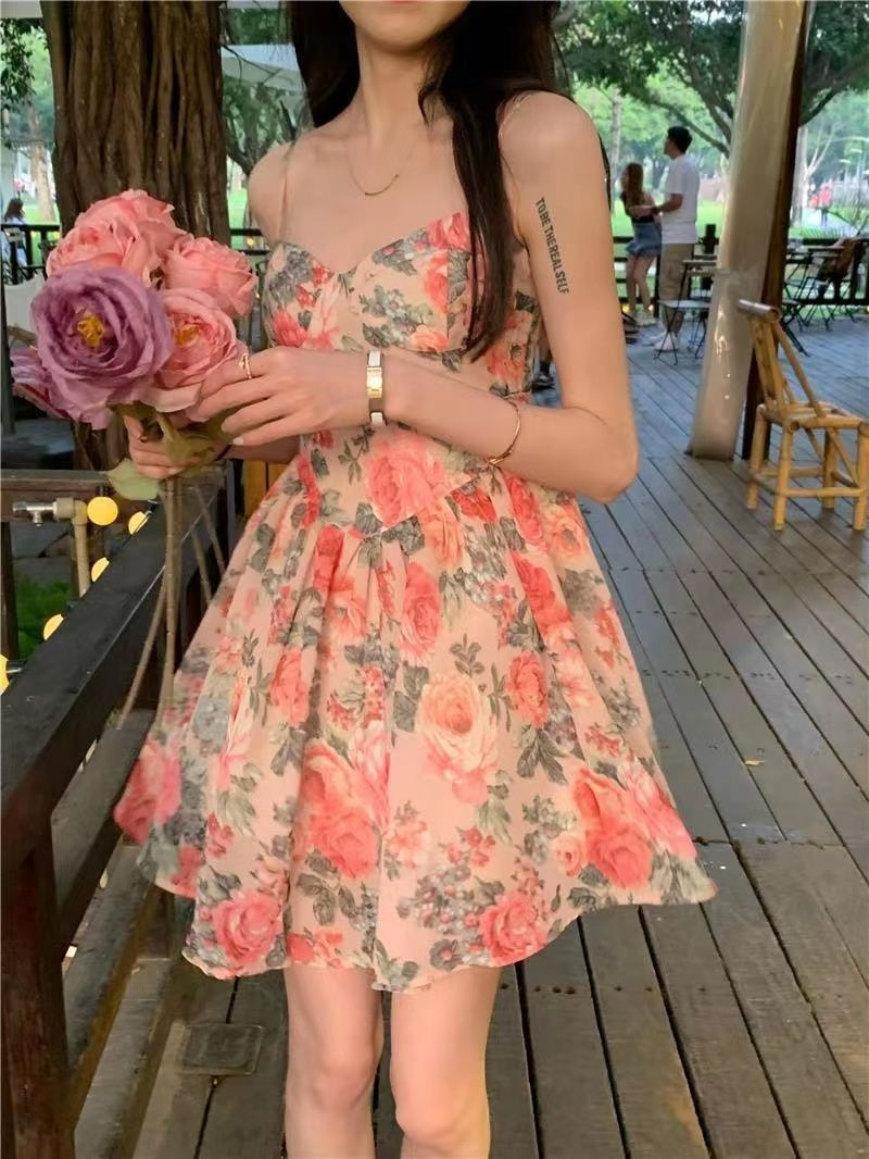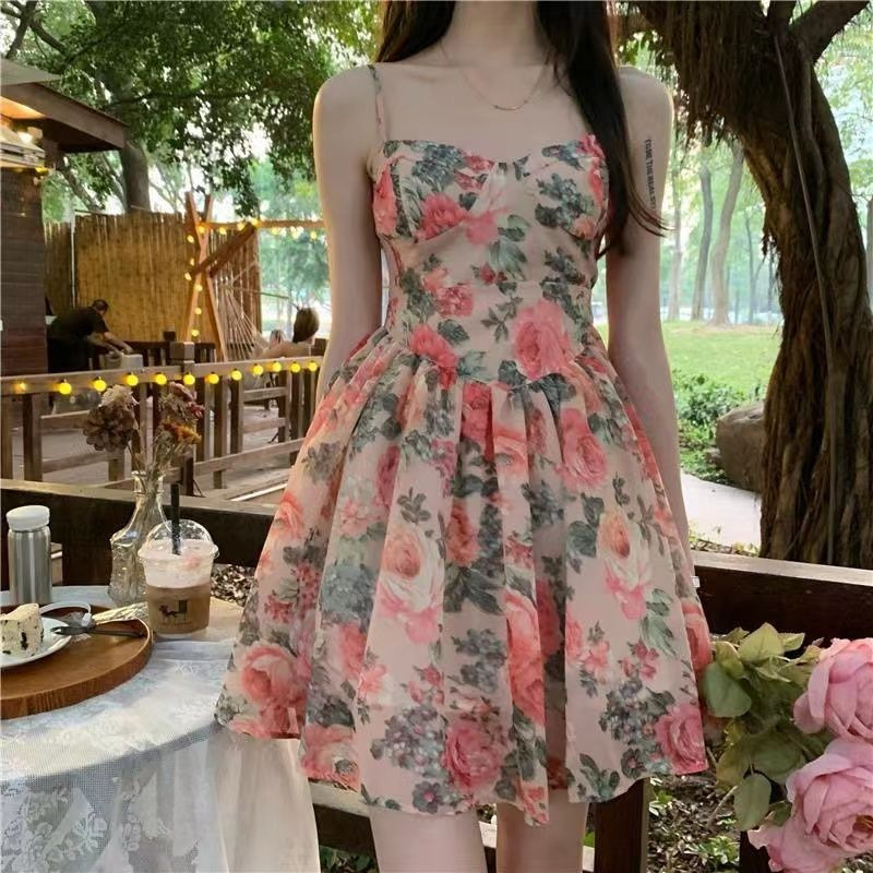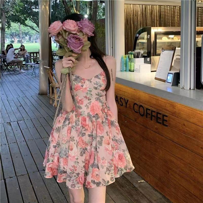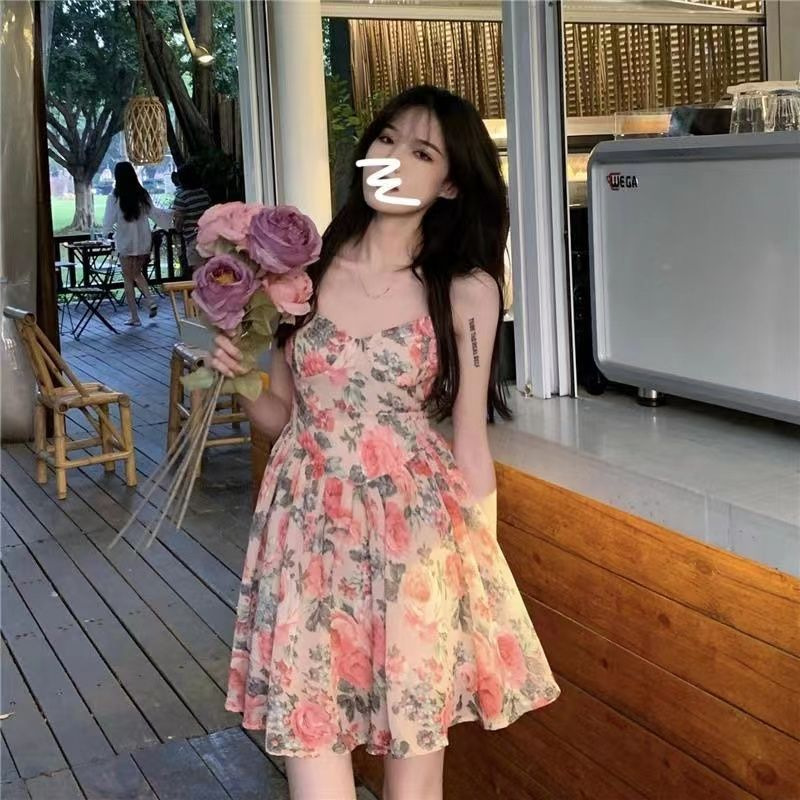 Элегантное утягивающее платье с высокой талией и цветочным принтом на тонких бретельках, весеннее и летнее французское миниатюрное новое короткое платье трапециевидной формы