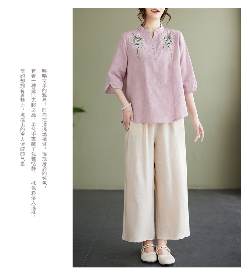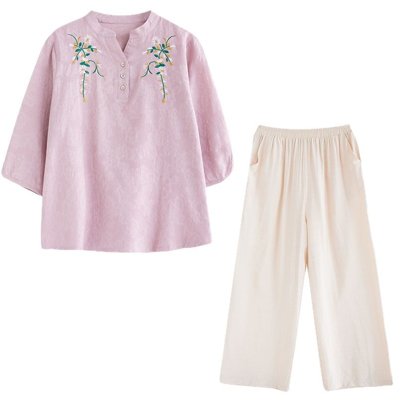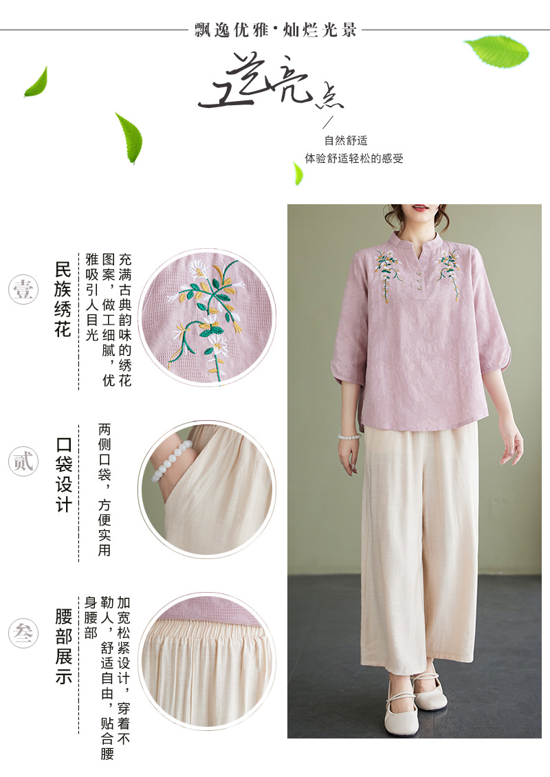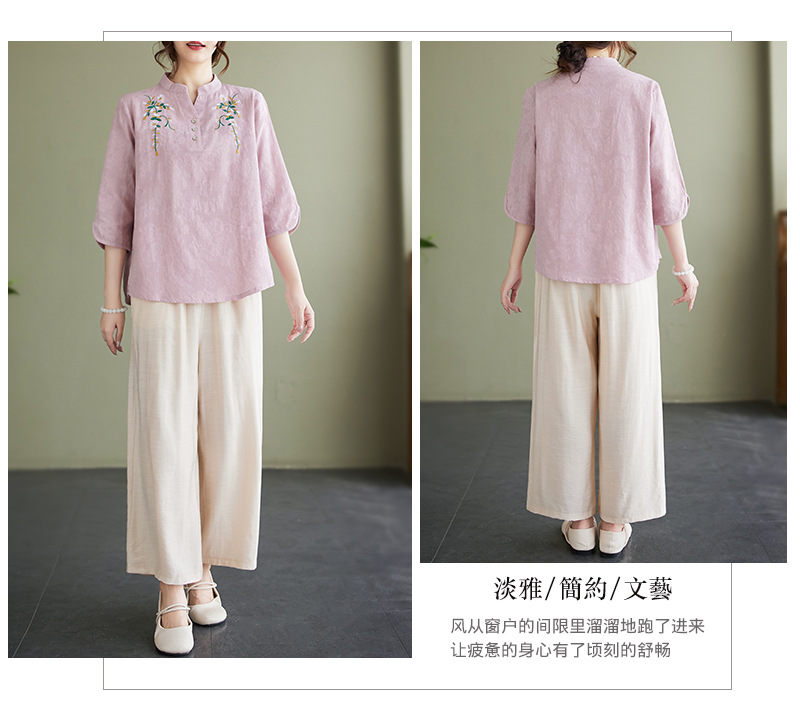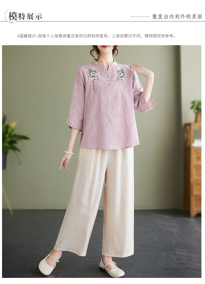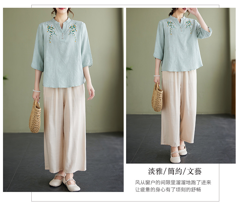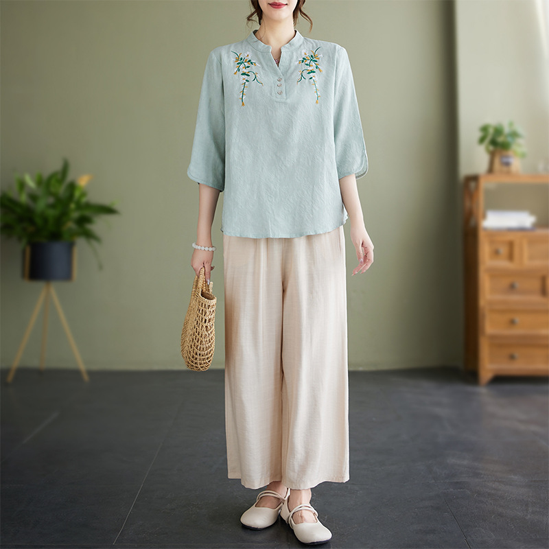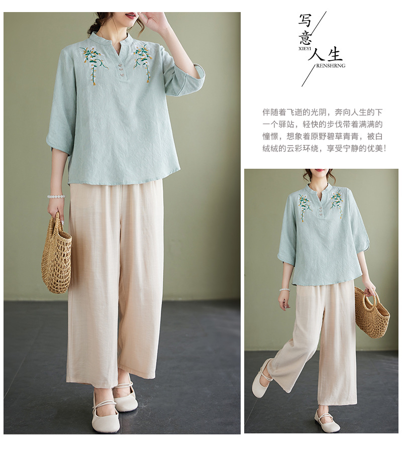 Фактический снимок новой летней хлопчатобумажной и льняной вышитой художественной свободной футболки со средним рукавом и короткими рукавами 2025 года + широкие брюки, комплект из двух предметов для женщин
