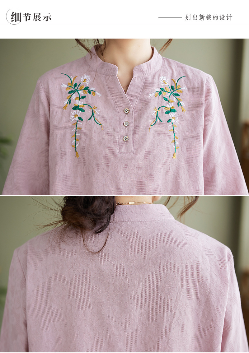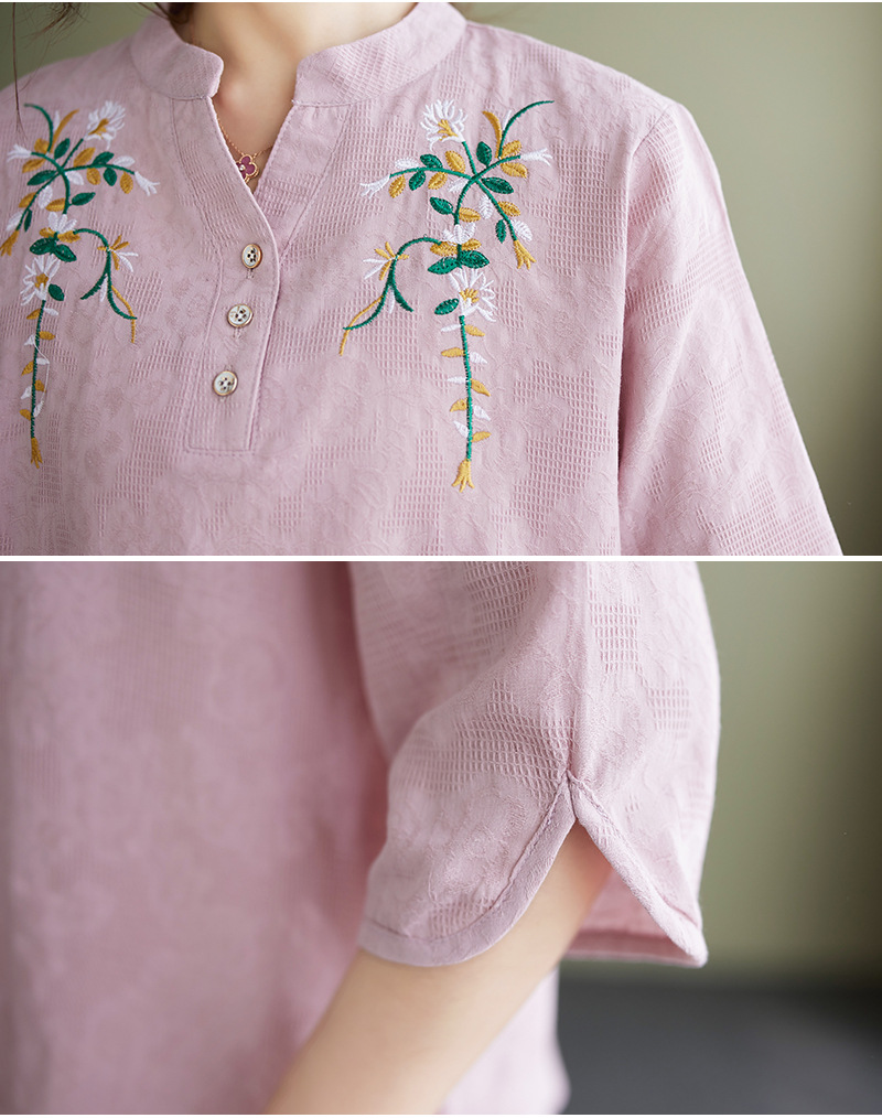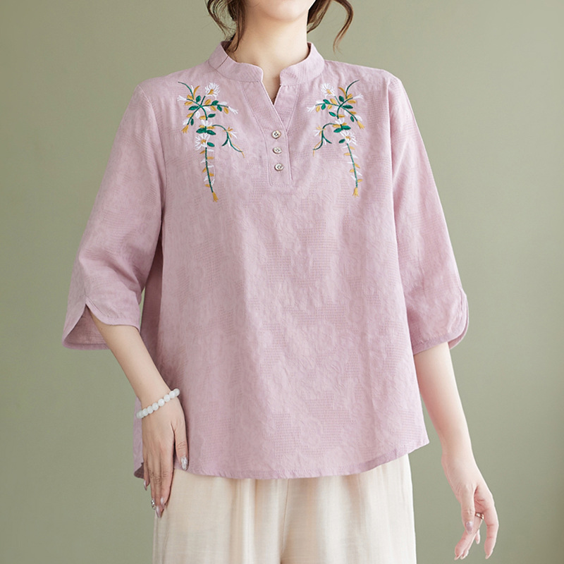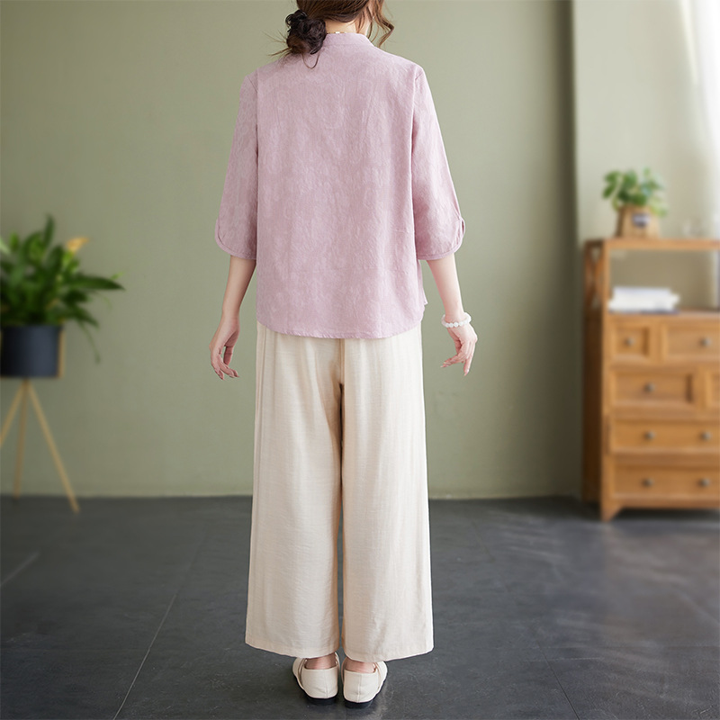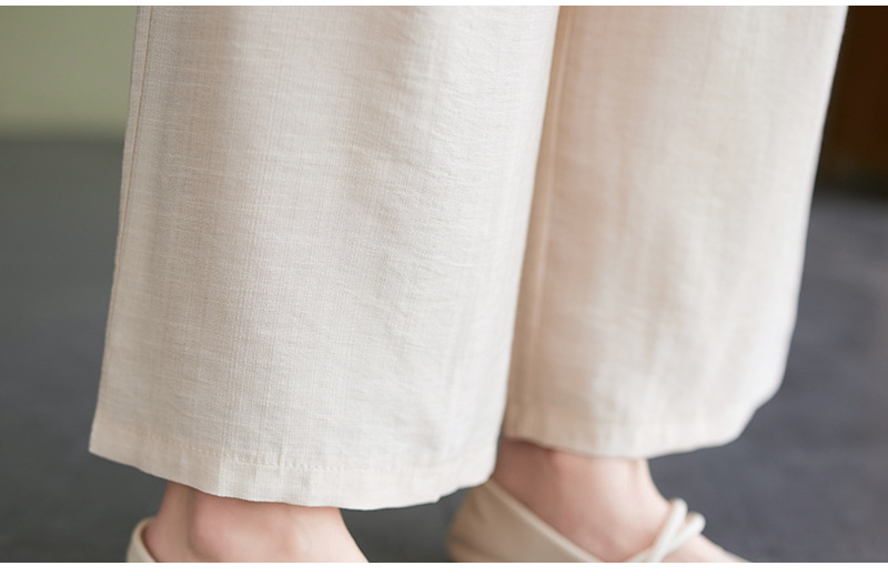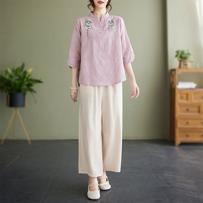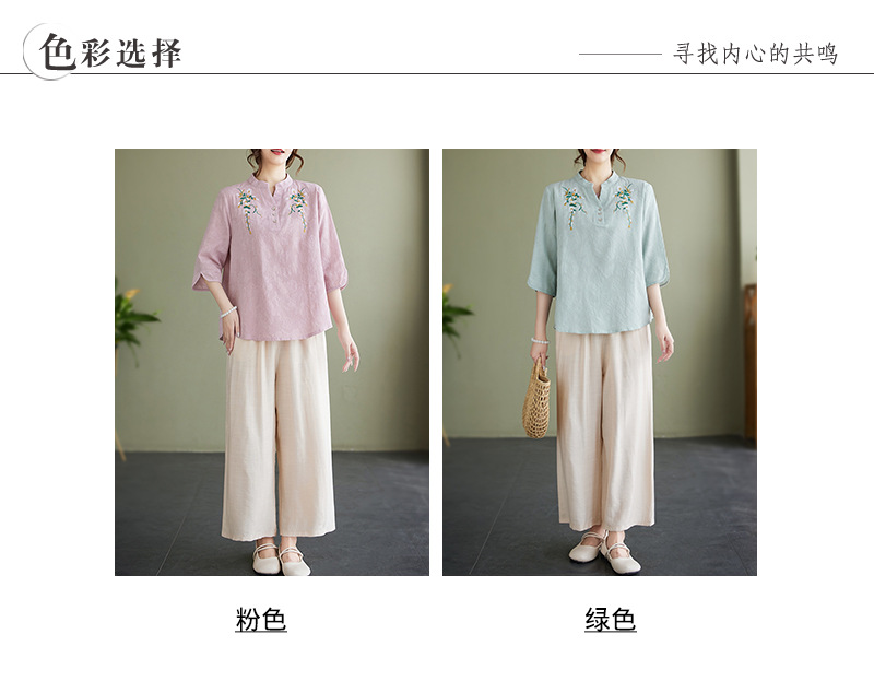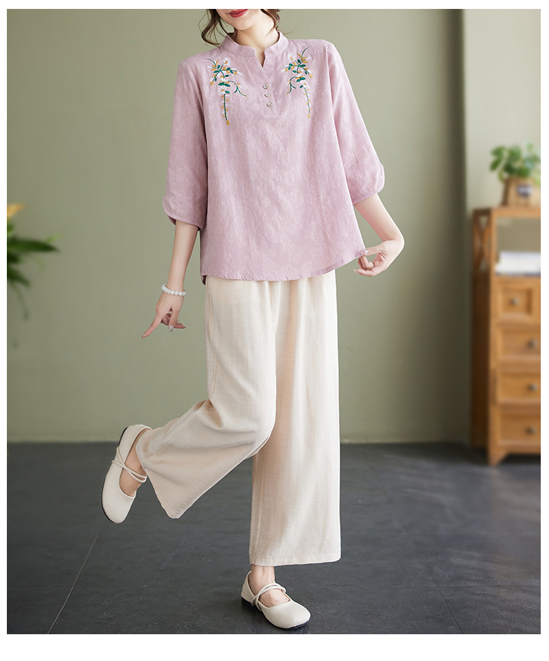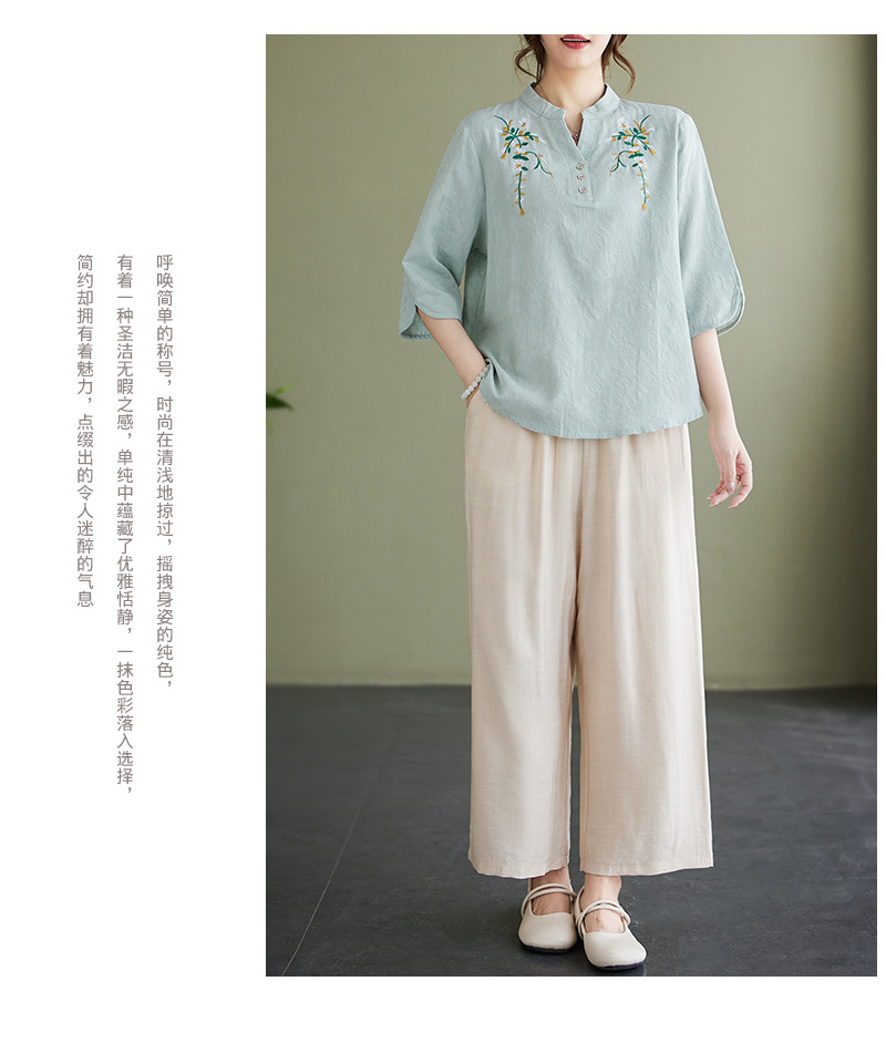 Фактический снимок новой летней хлопчатобумажной и льняной вышитой художественной свободной футболки со средним рукавом и короткими рукавами 2025 года + широкие брюки, комплект из двух предметов для женщин