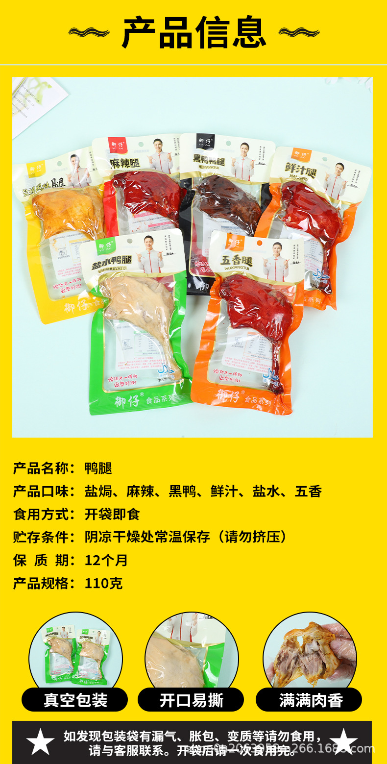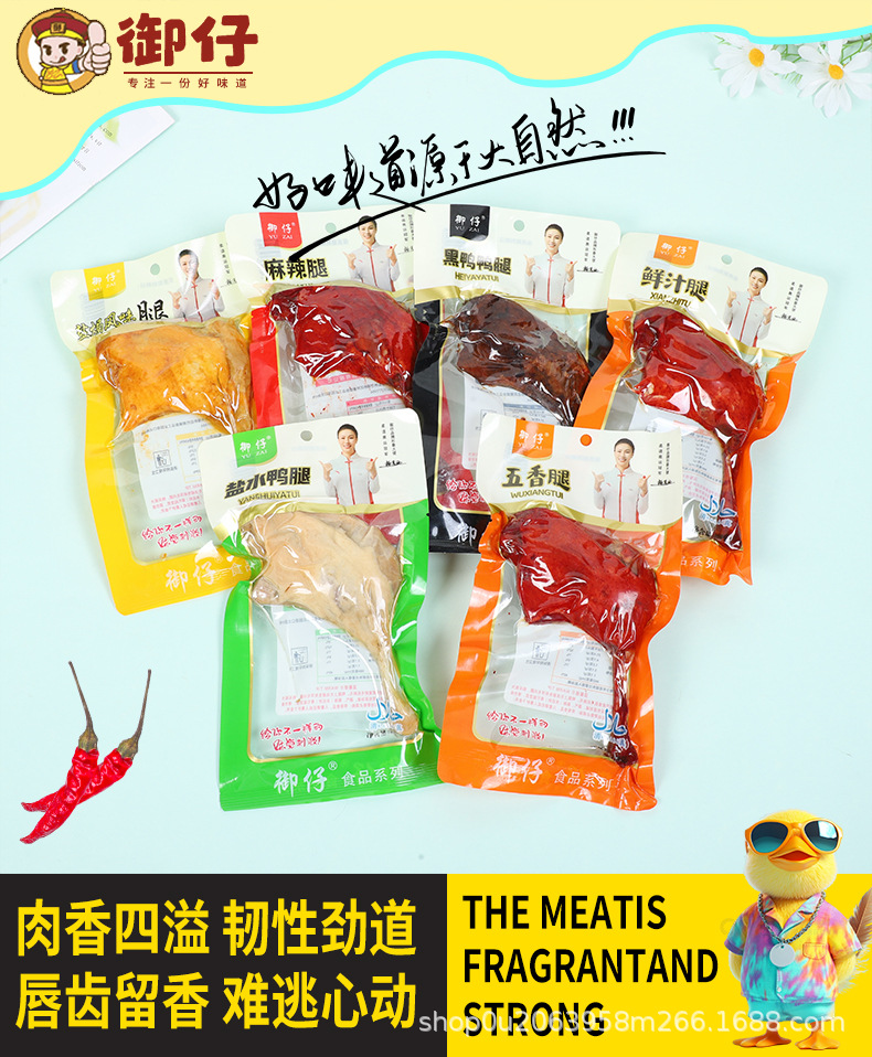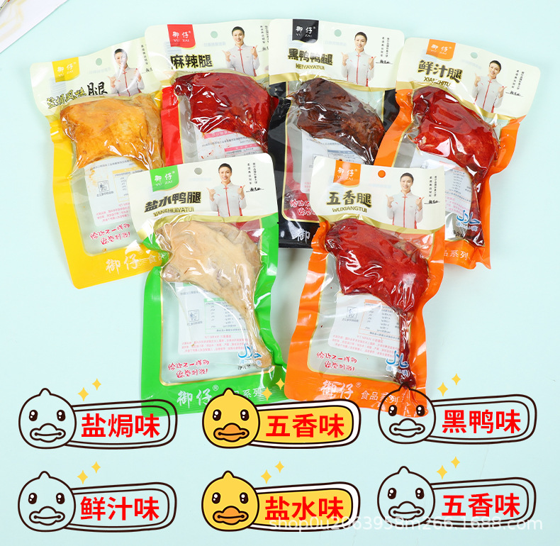 110 г острой утиной ножки; 110 г ножек утки, запеченных в соли; 110 г утиных ножек с пятью вкусами; 110 г ножек утки со вкусом свежего сока; 110 г ножек утки со вкусом черной утки; 110 г утиных ножек в соленой воде