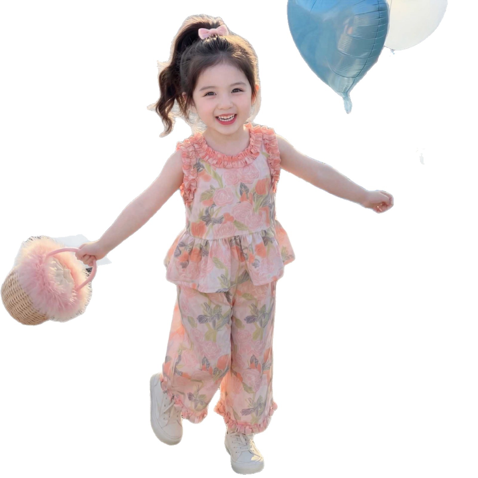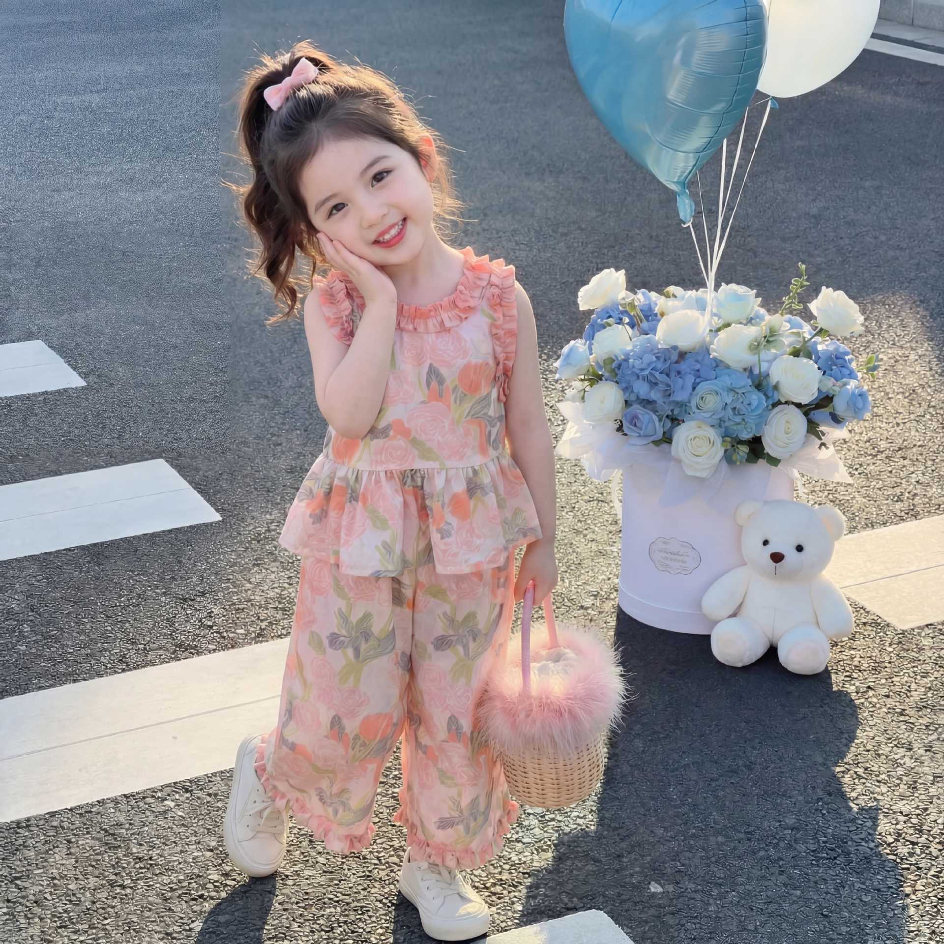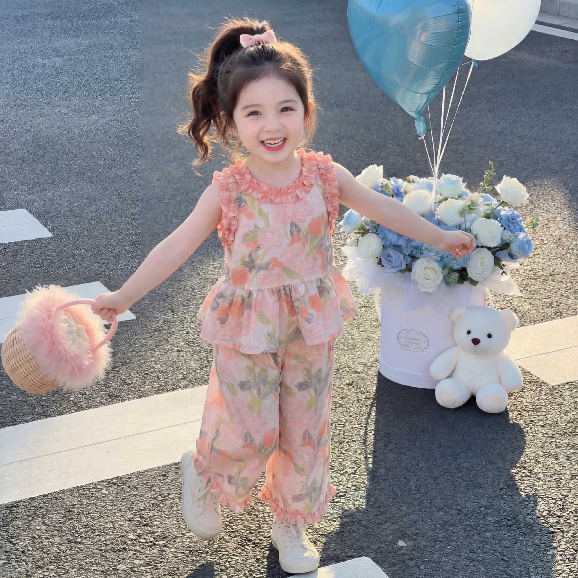 Летний комплект для девочек 2025 года: легкий цветочный топ и широкие брюки, модный детский летний наряд для малышек.