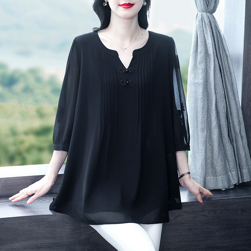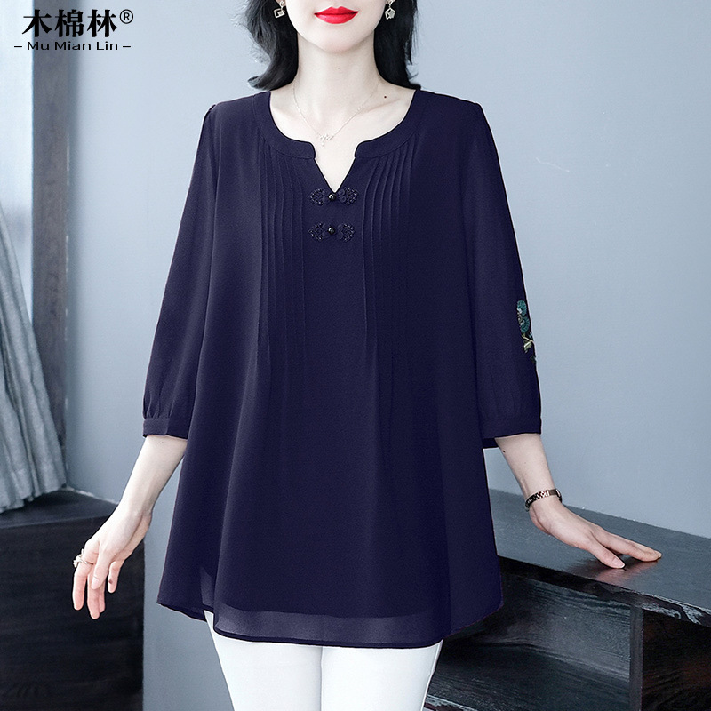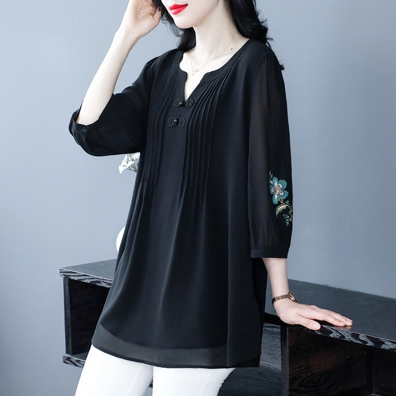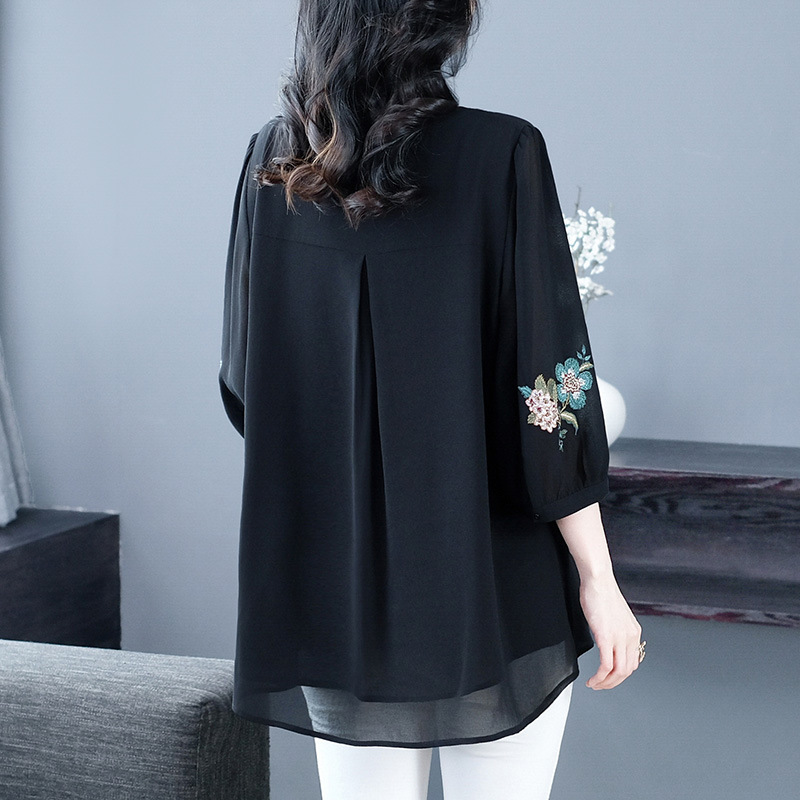 Летний новый высококачественный темперамент простой вышитый код рубашки повседневного покрытия тонкого дикого топ толстая мама девушка