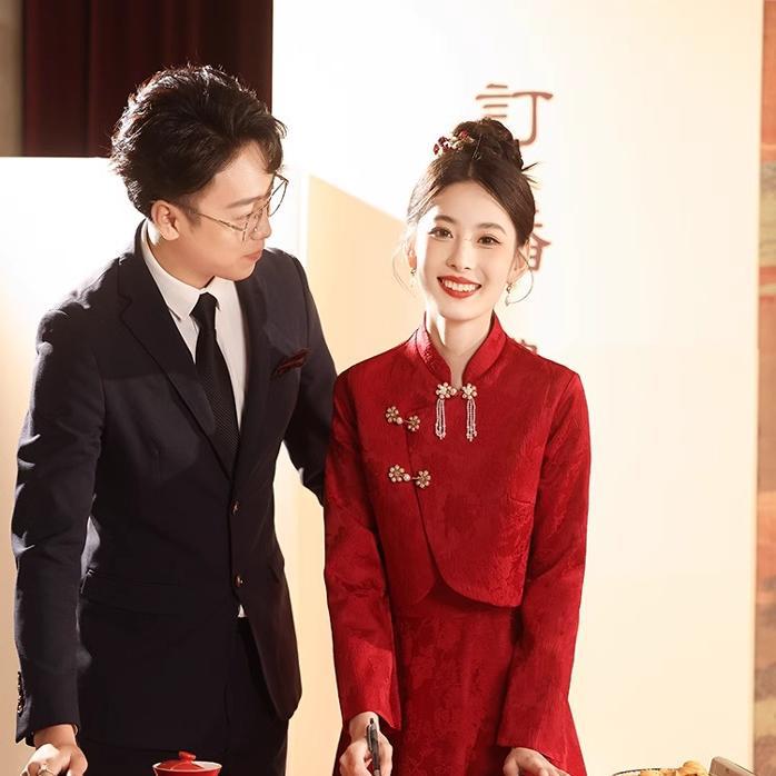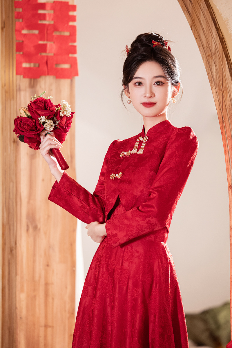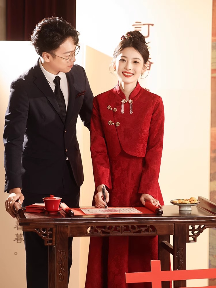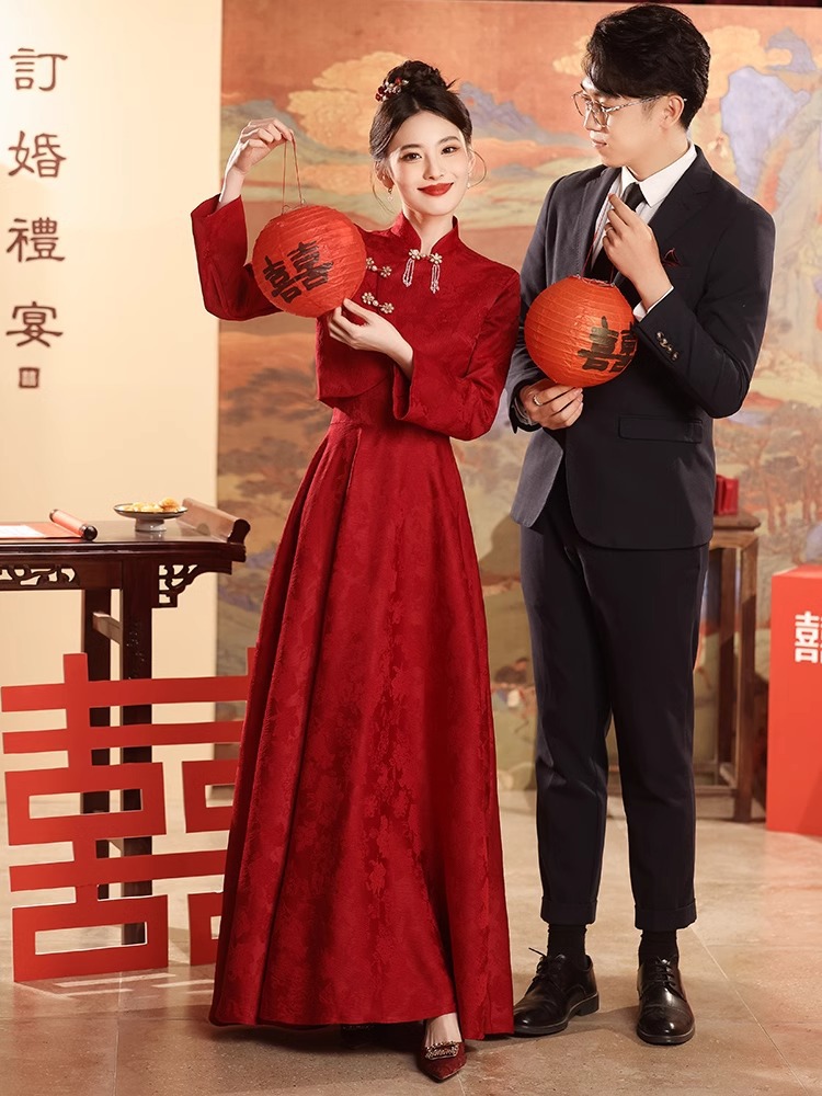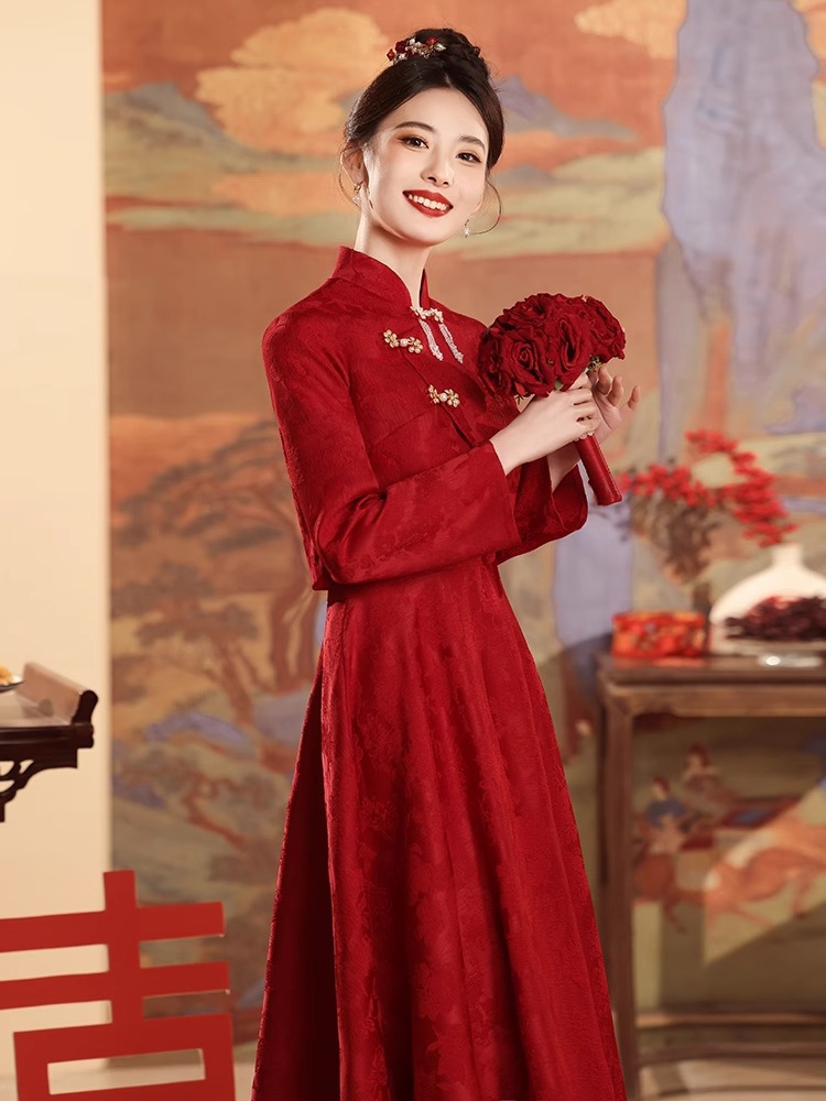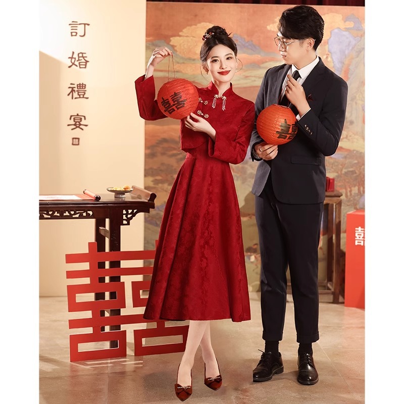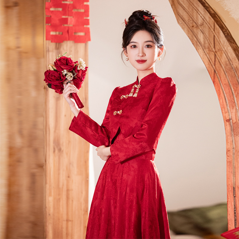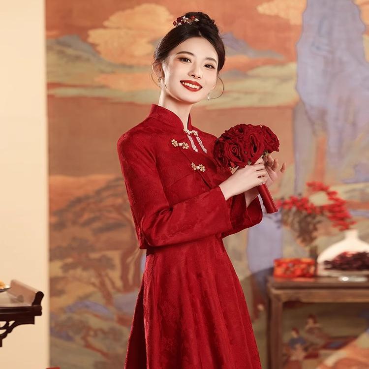 Платье-тост в китайском стиле Cheongsam, невеста обычно может носить красный обручальный костюм, платье с длинными рукавами, юбку, осень и зиму.