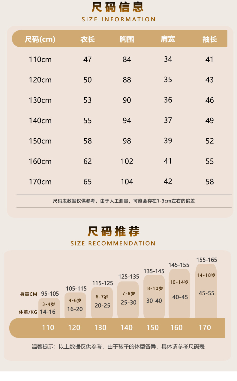 110 (рекомендуемая высота 95-105) 17-21kg; 120 (рекомендуемый рост 105-115) 21-25kg; 130 (рекомендуемая высота 115-125) 25-29kg; 140 (рекомендуемый рост 125-135) 29-33kg; 150 (рекомендуемый рост 135-145) 33-37.5kg; 160 (рекомендуемый рост 145-150) 37.5-45kg; 170 (рекомендуемый рост 160-165) 50-55kg