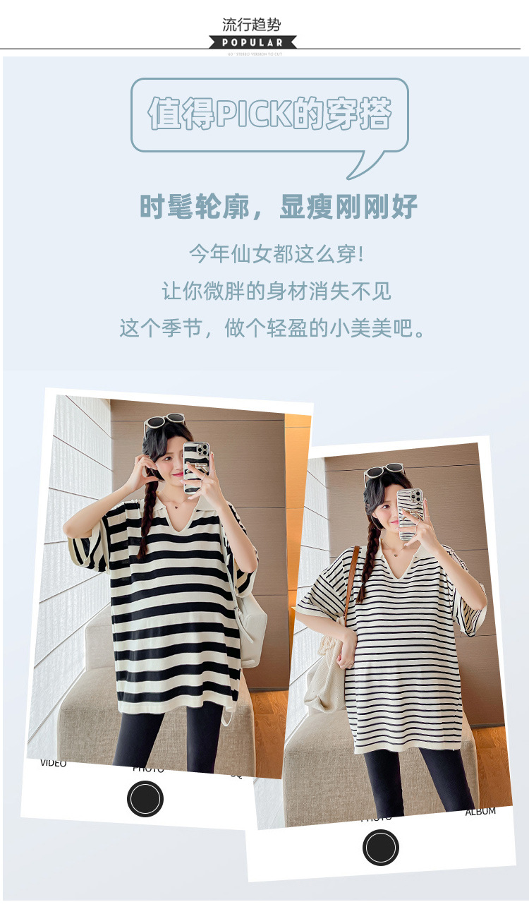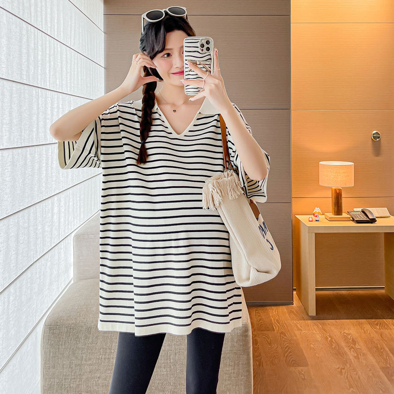 Большая версия новой беременной женщины с короткими рукавами 2025 летняя корейская модная свободная полоска простой повседневный дикий топ