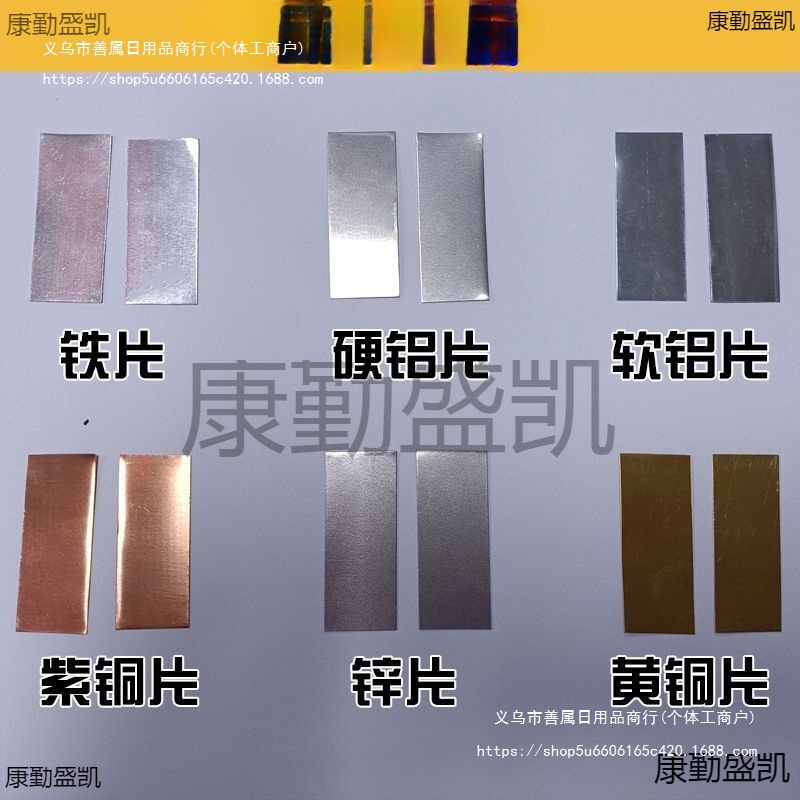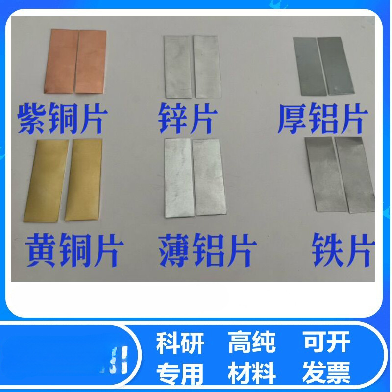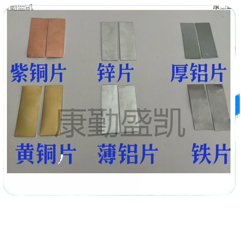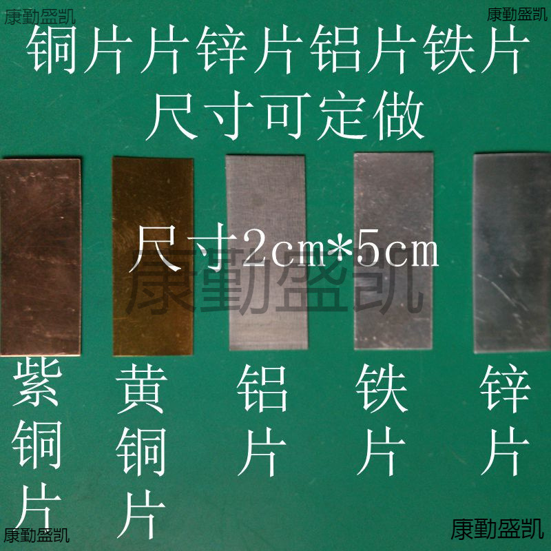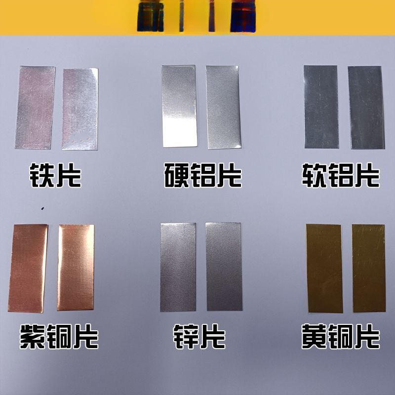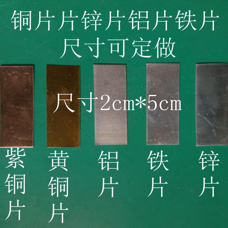 Медный лист [5см*2см]; Латунный лист [5см*2см]; Цинковый лист [5см*2см]; Толстый алюминиевый лист [5см*2см]; Тонкий алюминиевый лист [5см*2см]; Железный лист [5см*2см]; Магниевый лист [5см*2см]; Железный лист 1,5*5см.; Медный лист 20см×5см
