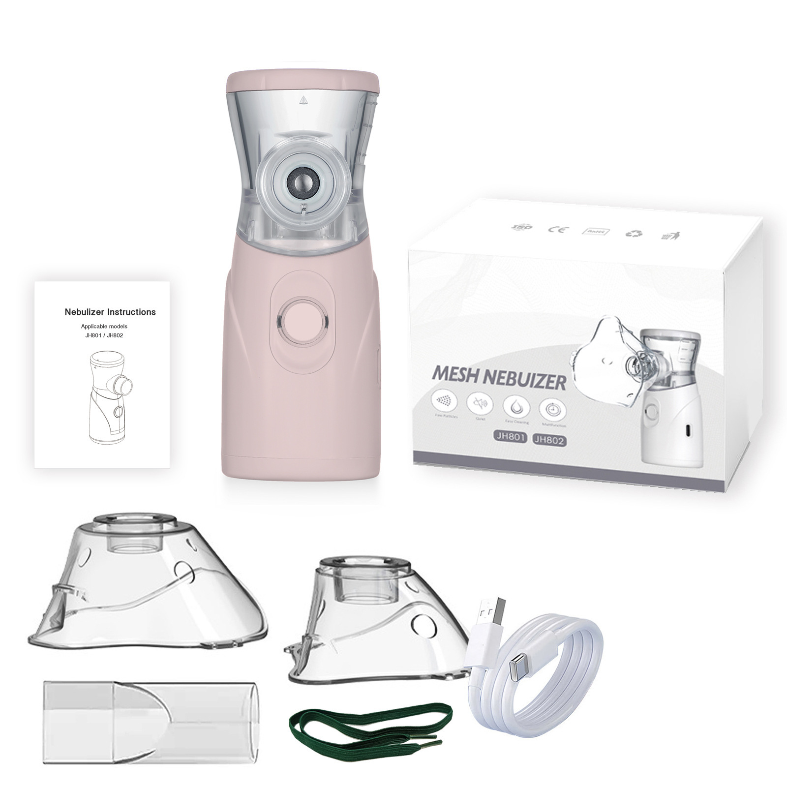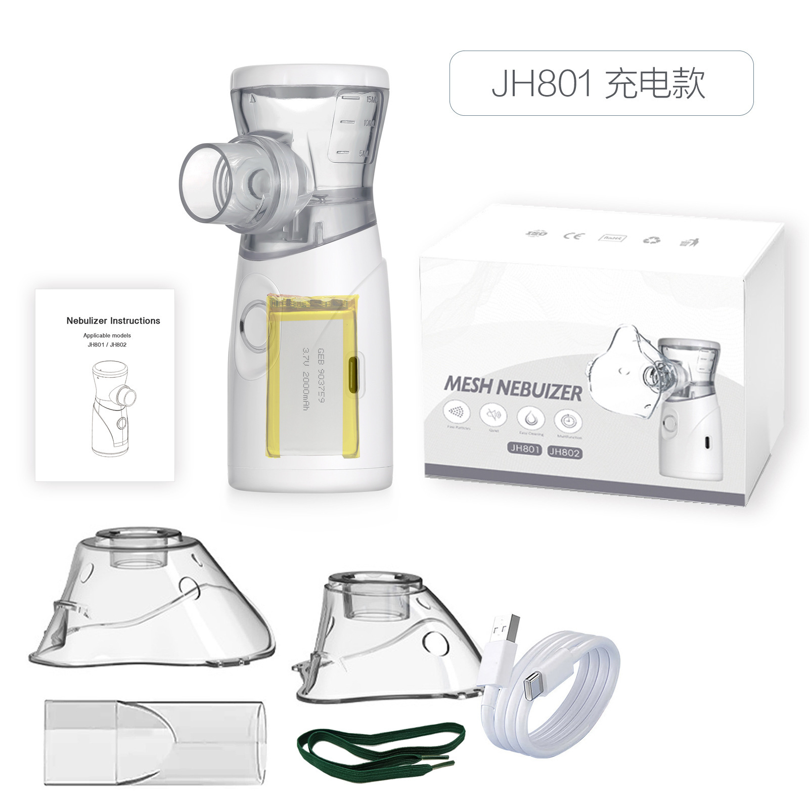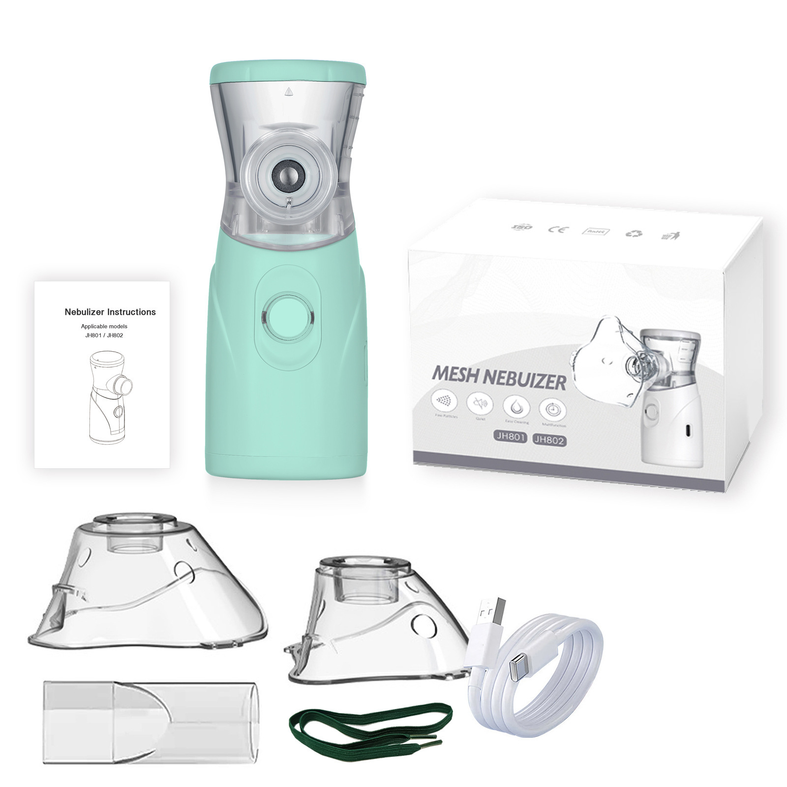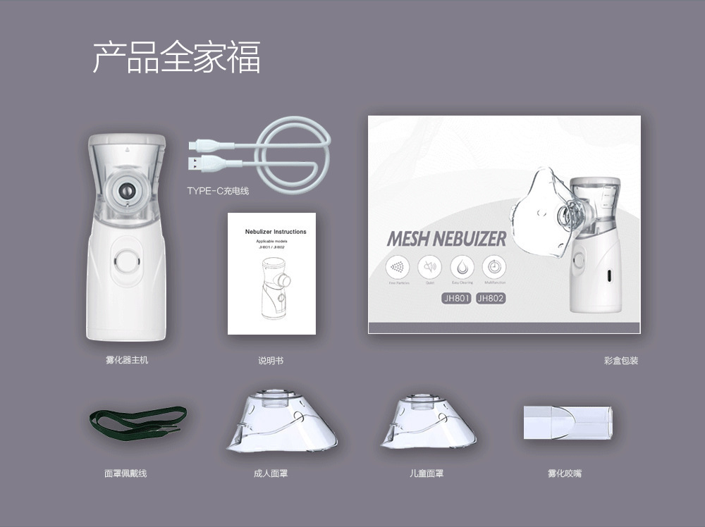 雾化器*1,大面罩*1,小面罩*1, type-c一米线*1,咬嘴*1,说明书。
