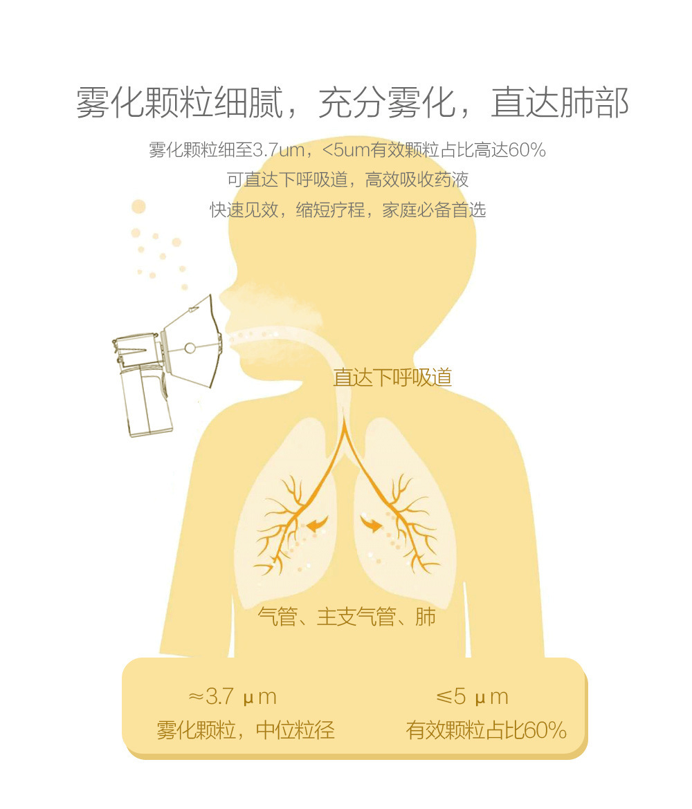 2.颗粒细:出雾大,雾化颗粒细腻,颗粒约≤3.7μm,药物吸收更充分