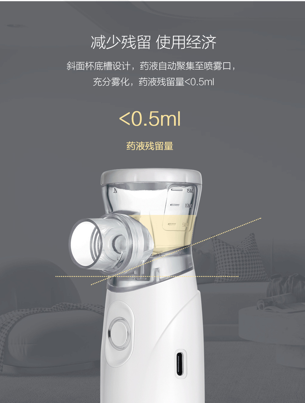 6. 使用雾化面罩时,注意请勿将药液杯组件倾斜45度以上,以免剧烈摇晃;