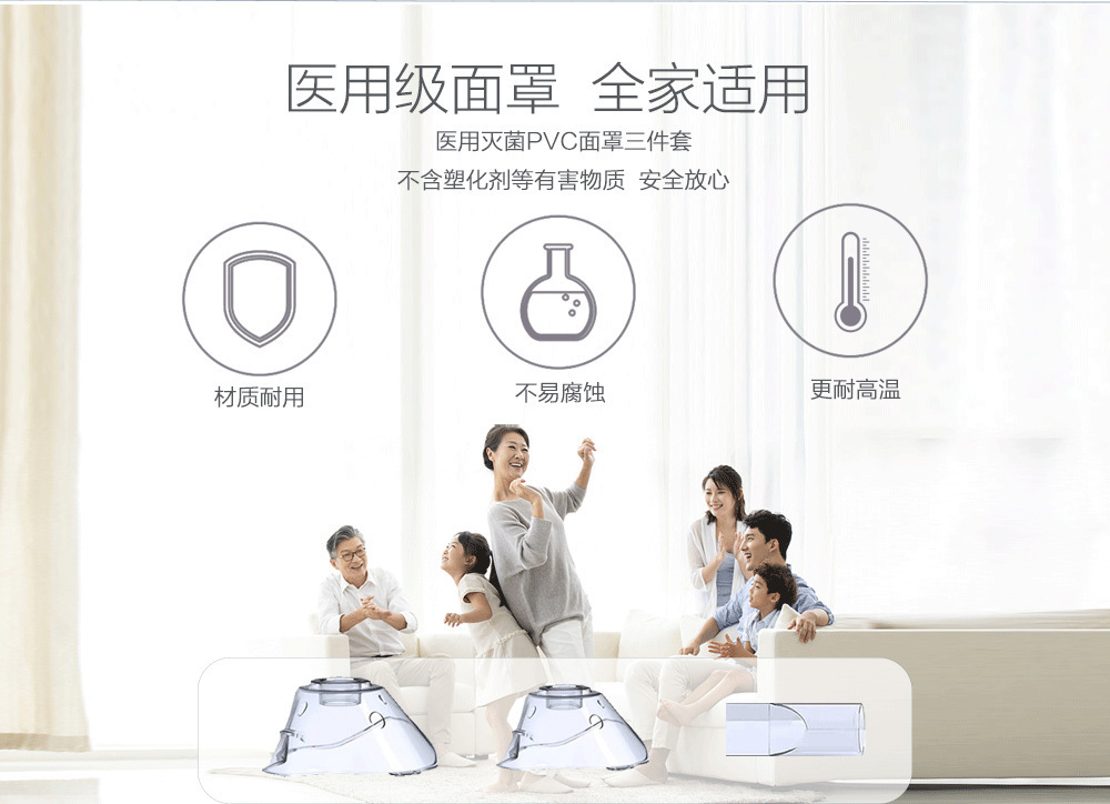 6.雾化模式:根据情况不同可以选择两种雾化方式,即面罩雾化(分成人及儿童面罩)及咬嘴雾化