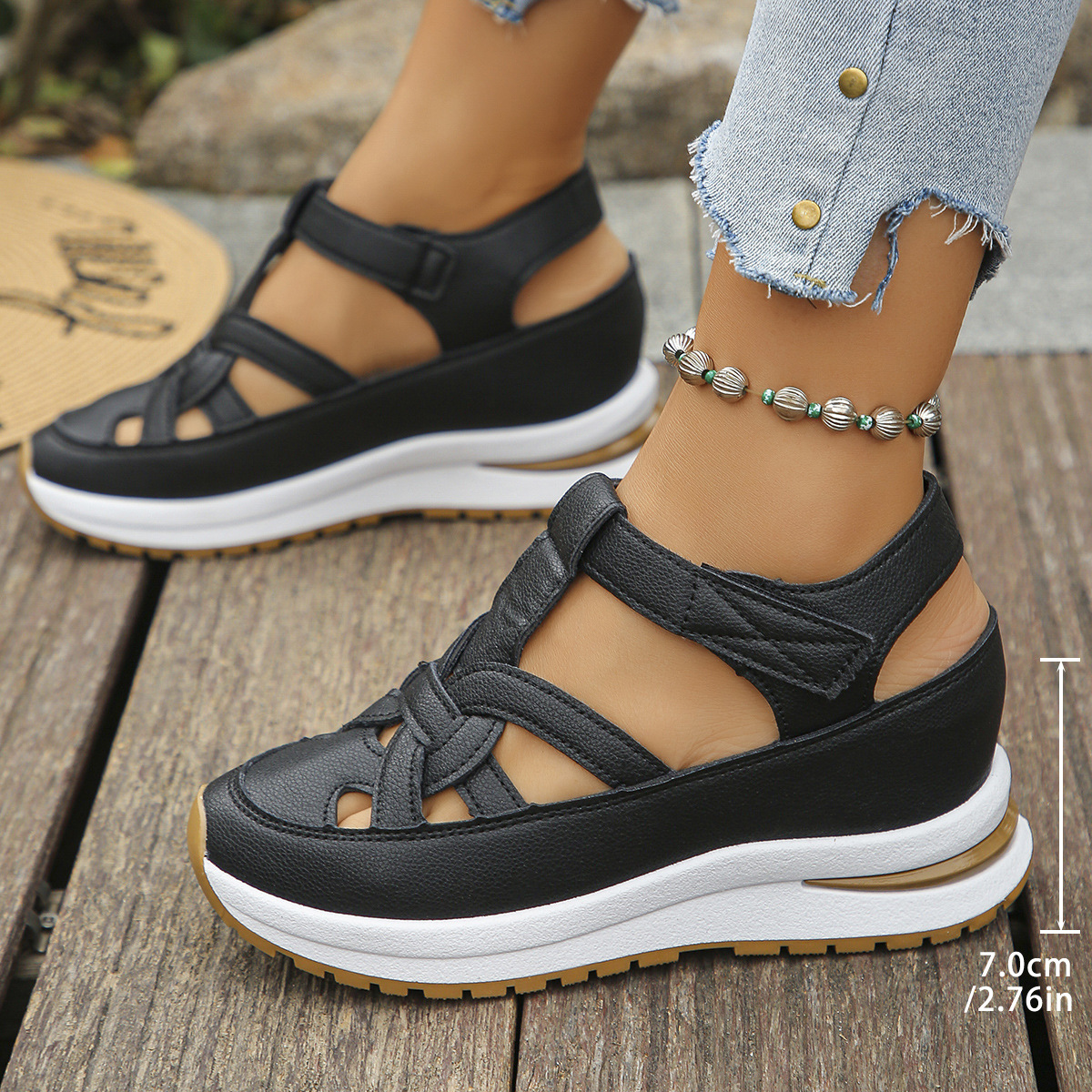 Трансграничный новый стиль большой размер наклон на каблуке сандалии женский баотоу полый дышащий женский внешний оборот большой размер кекс толстая подошва липучка женский