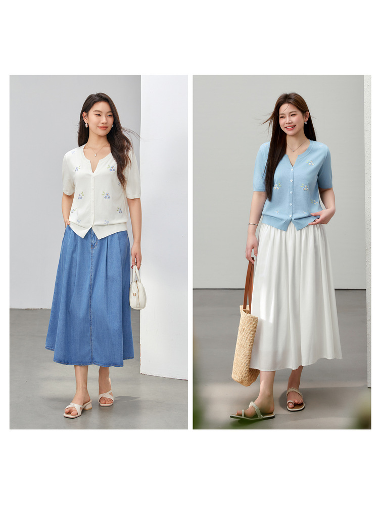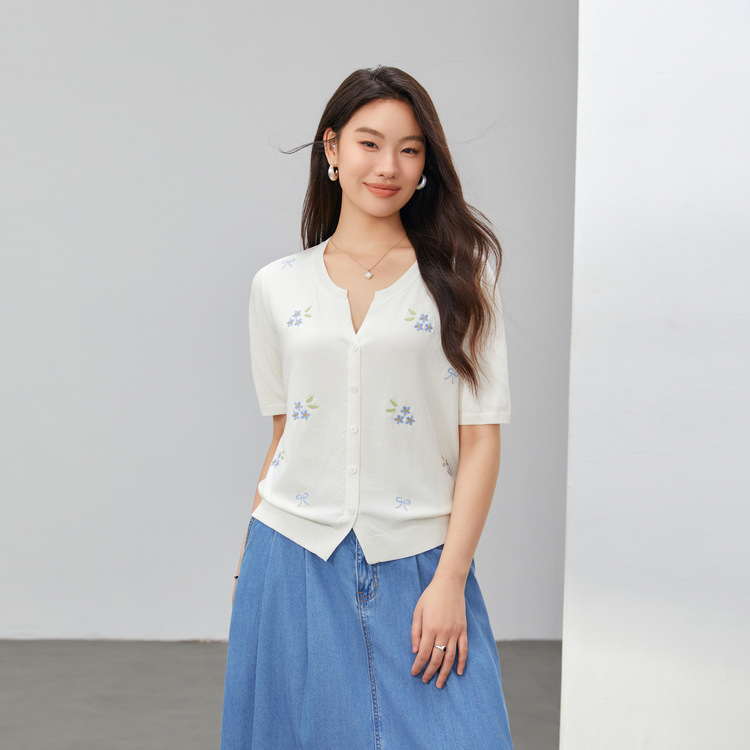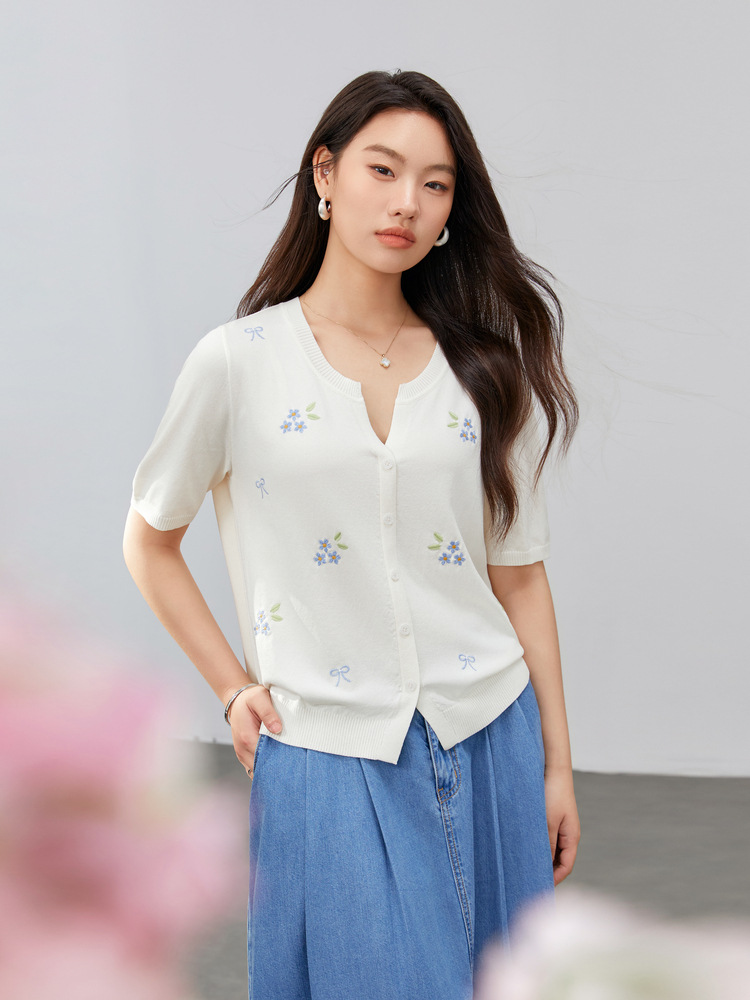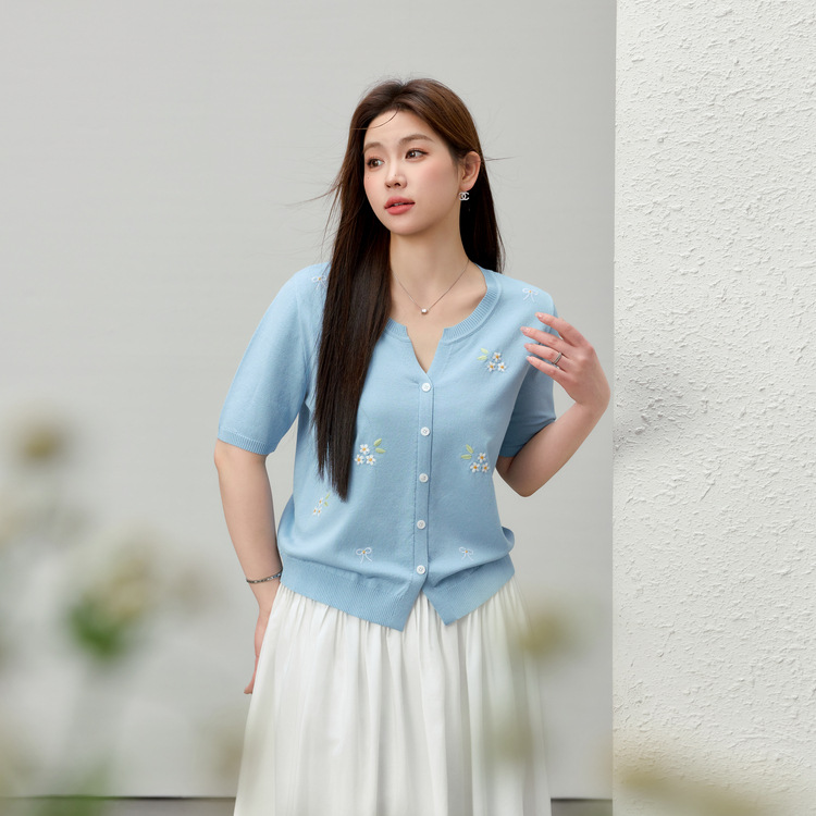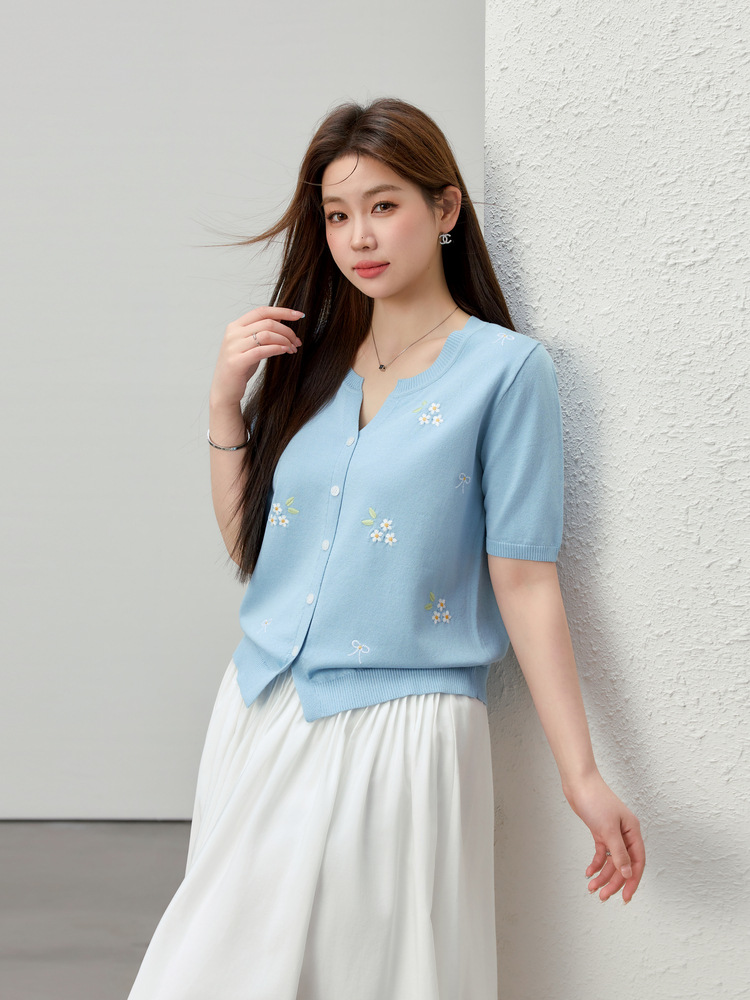 [Маленький свежий вышитый нежный и универсальный трикотаж в корейском стиле] Тонкая и красивая женская одежда больших размеров, толстая мм, лето 2025, новый стиль