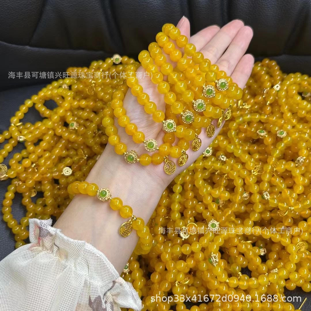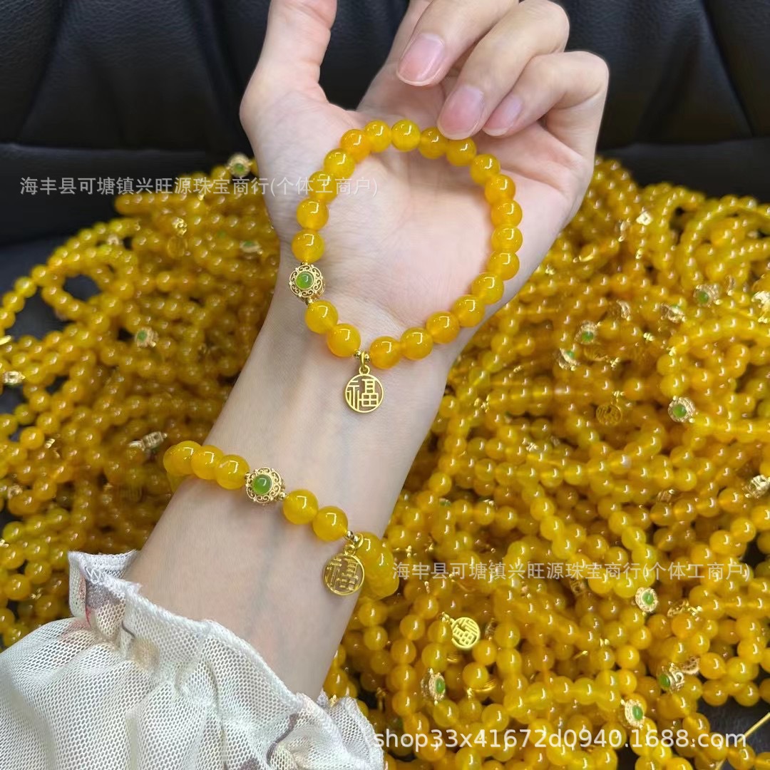 原创黄色玛瑙鸡油黄单圈手串女生配饰复古风文艺款福字吊牌直播款 批发量越大价格越低,可供直播间长期合作,欢迎来电私聊