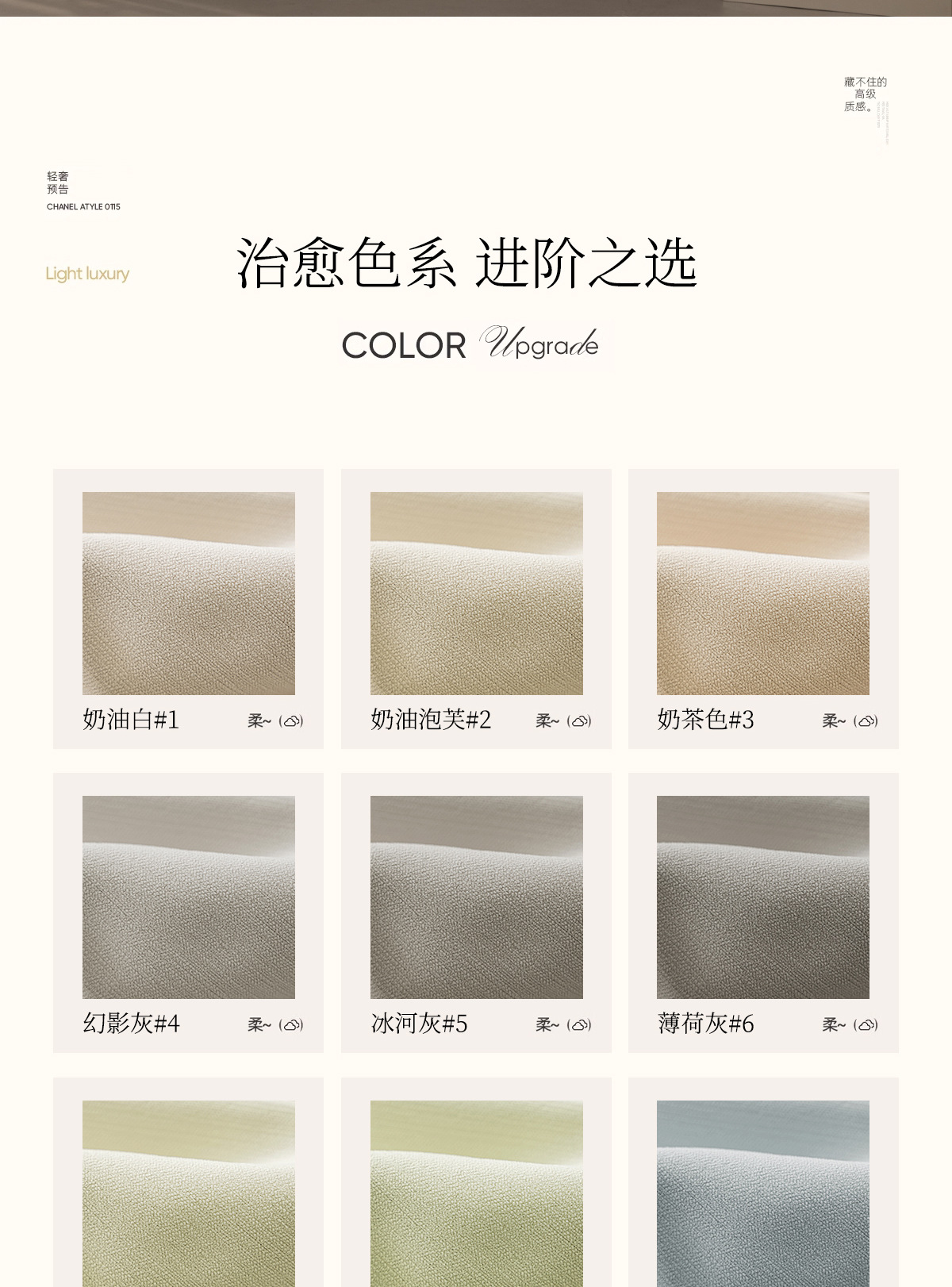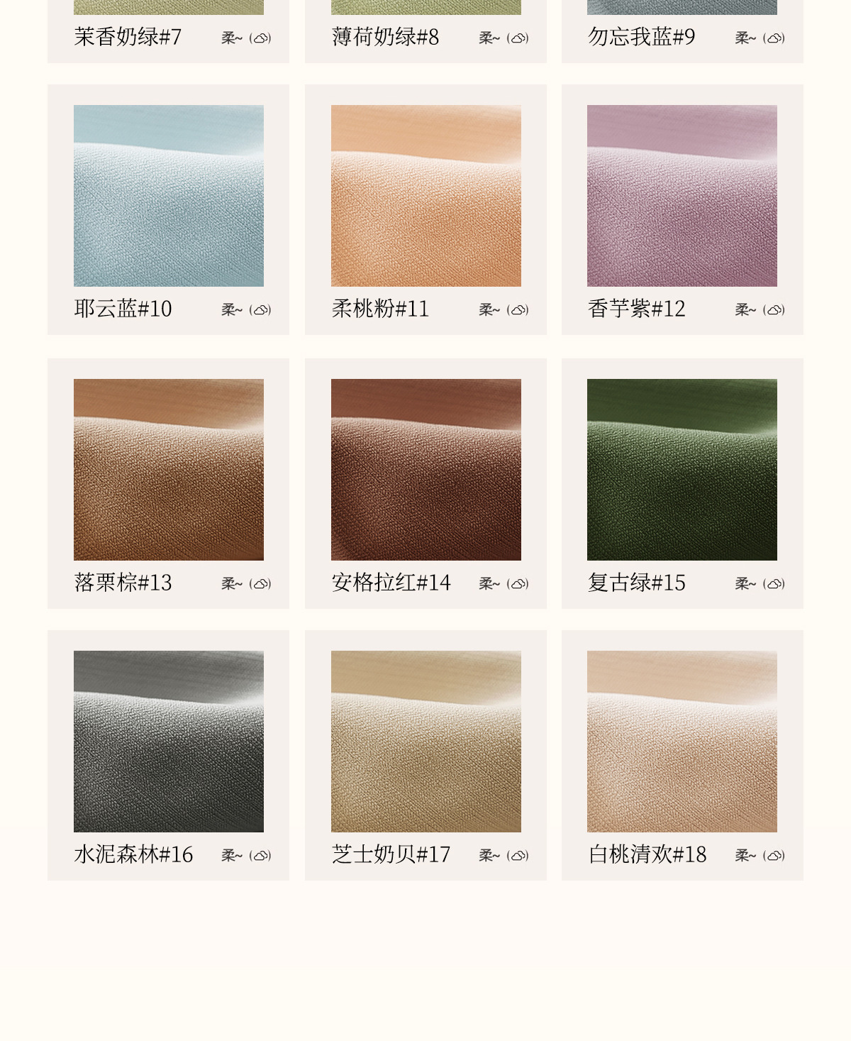 1 # кремово-белый; 2 # сливочные слоеные пирожки; 3 # молочный чай; 4 # Фантомный серый; 5 # ледниковый серый; 6 # сумеречный серый; 7 # Мускусное молоко зеленое; 8 # мятно-молочно-зеленый; 9 # не забывай меня, не синий; 10 # Еюнлан; 11 # Мягкий персиковый порошок; 12 # Таро фиолетовый; 13 # Падающая древесина коричневого цвета; 14 # Ангорский красный; 15 # винтажный зеленый; 16 # цементный лес; 17 # Сырные молочные моллюски; 18 # Белый персик Цинхуань