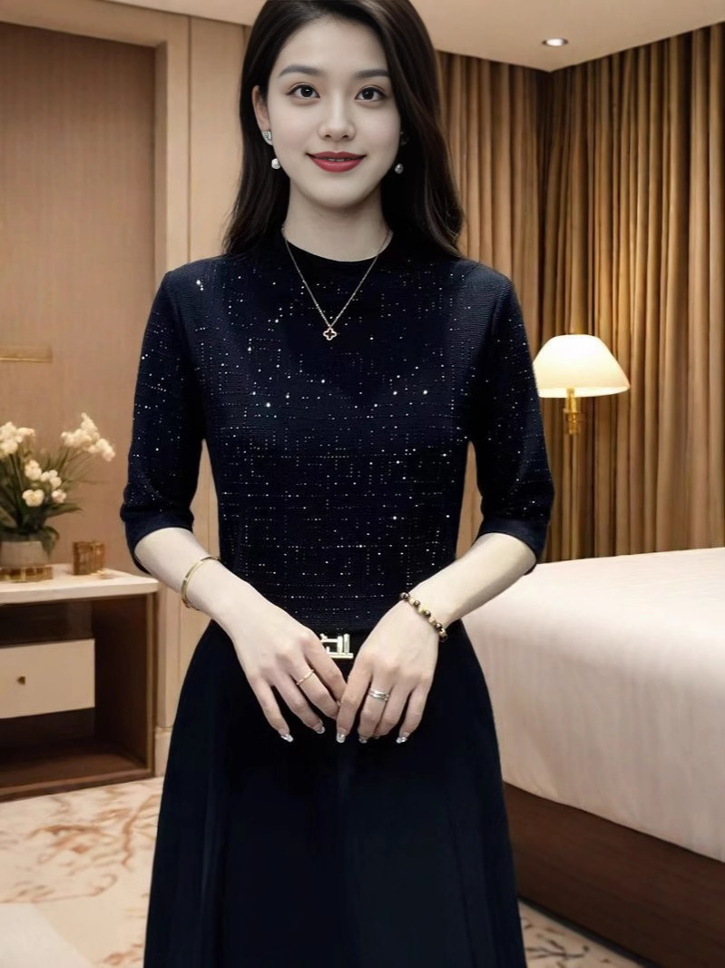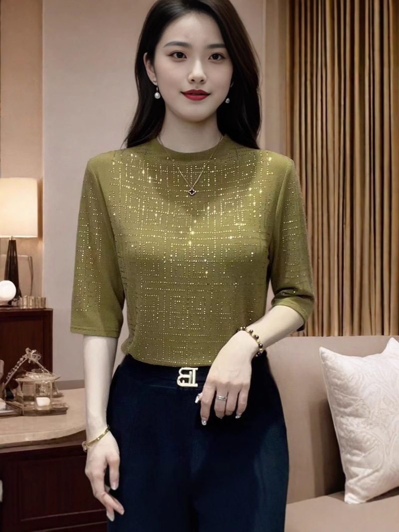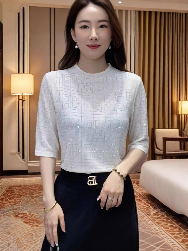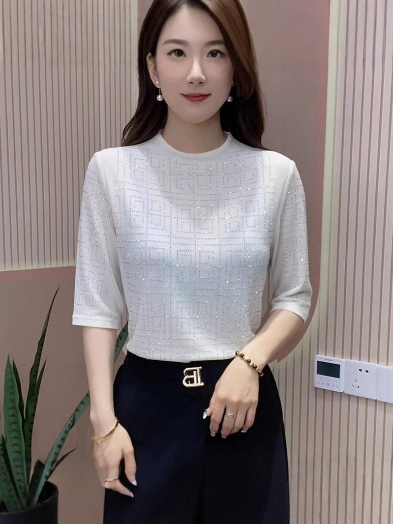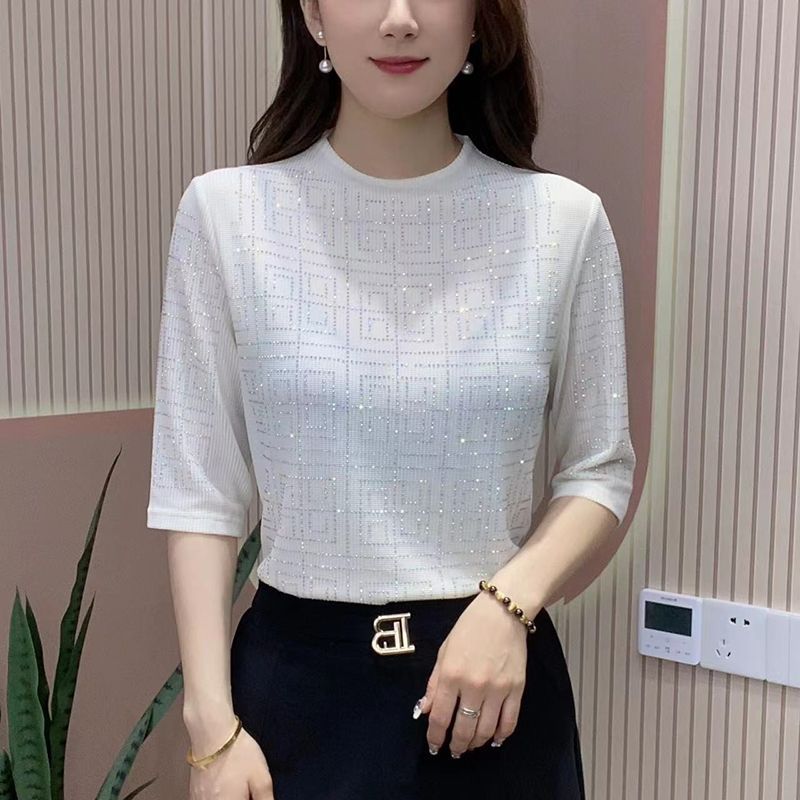 Женский свободный топ со средними рукавами из ледяного шелка и стразами, универсальная утягивающая базовая рубашка в корейском стиле, модная весенне-летняя базовая рубашка