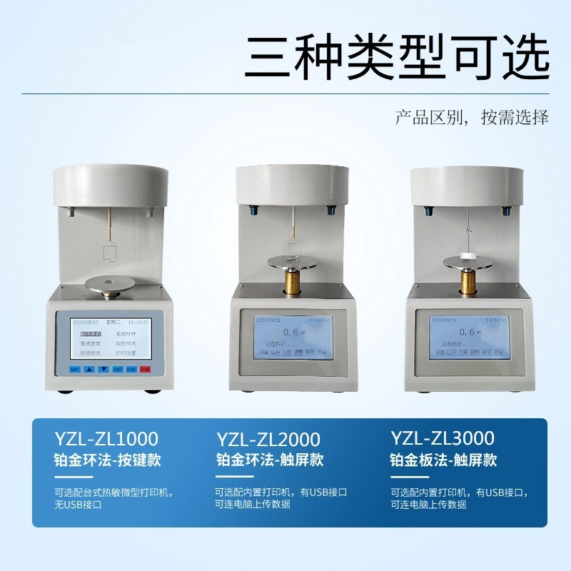 Автоматический измеритель натяжения интерфейса YZL-ZL1000 (кнопочная модель); Автоматический измеритель натяжения интерфейса YZL-ZL2000 (модель с сенсорным экраном, метод платинового кольца); Автоматический измеритель натяжения интерфейса YZL-ZL3000 (модель с сенсорным экраном, метод платиновой пластины); Настольный термопринтер (применимо к модели YZL-ZL1000, встроенный принтер с сенсорным экраном)