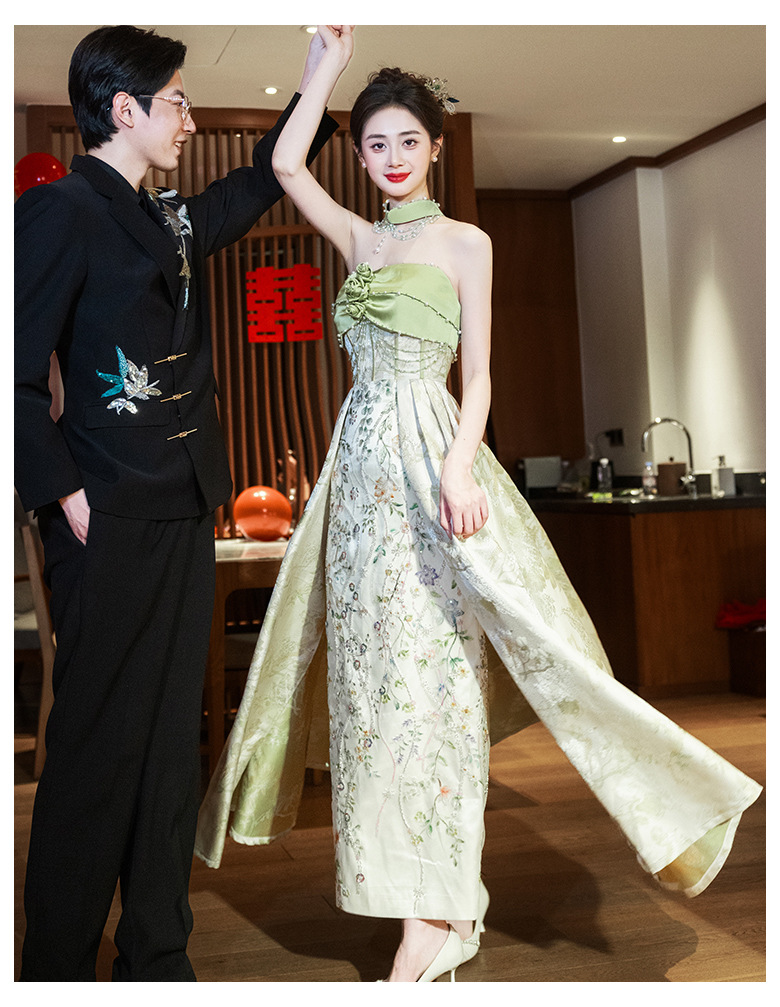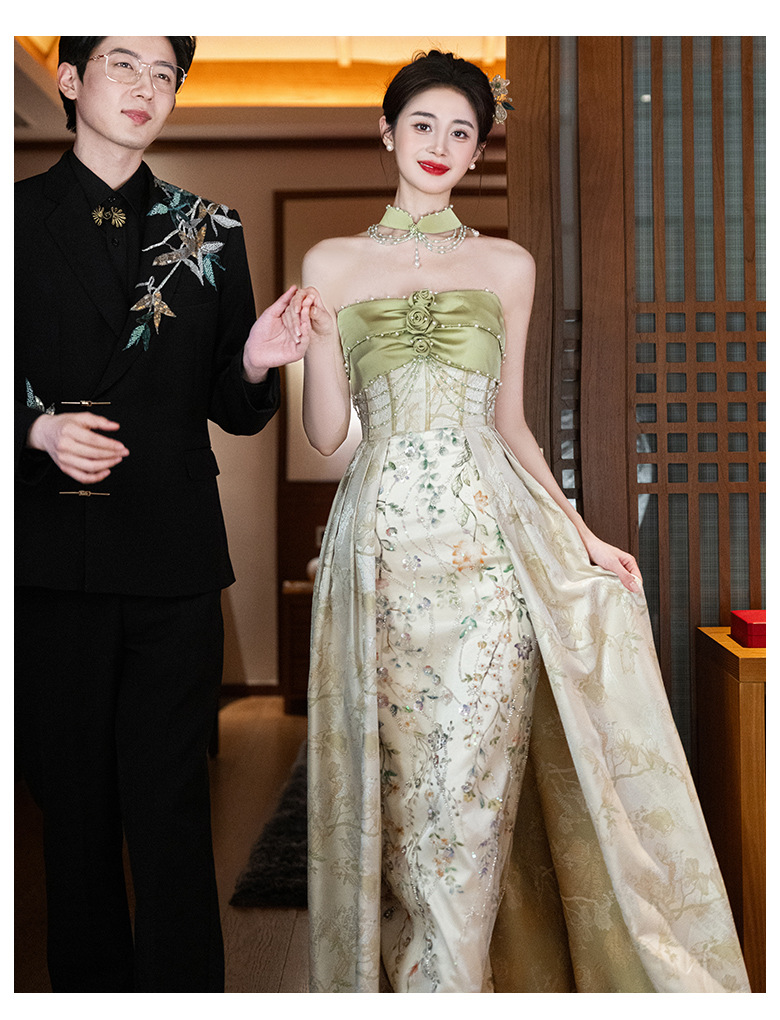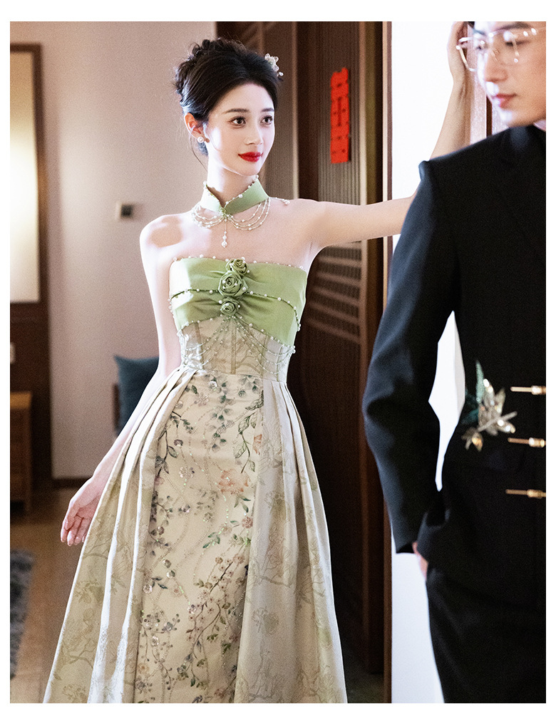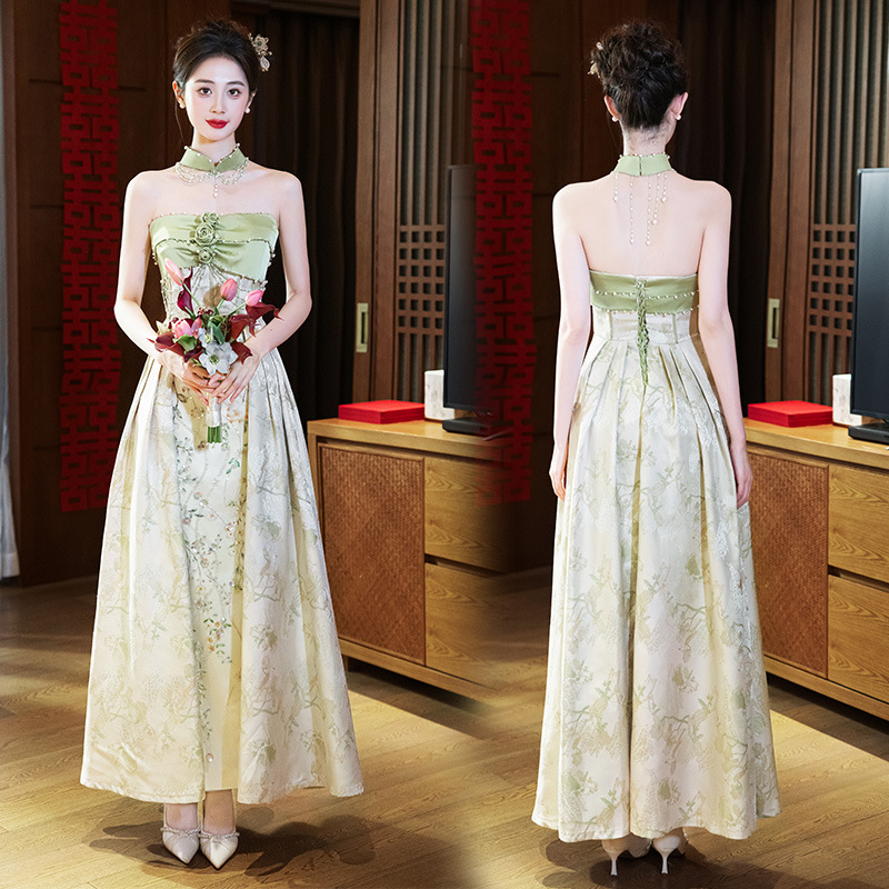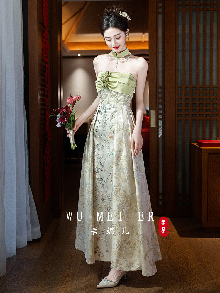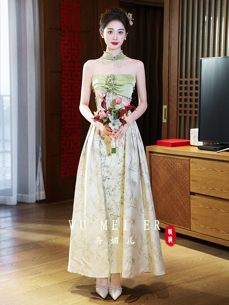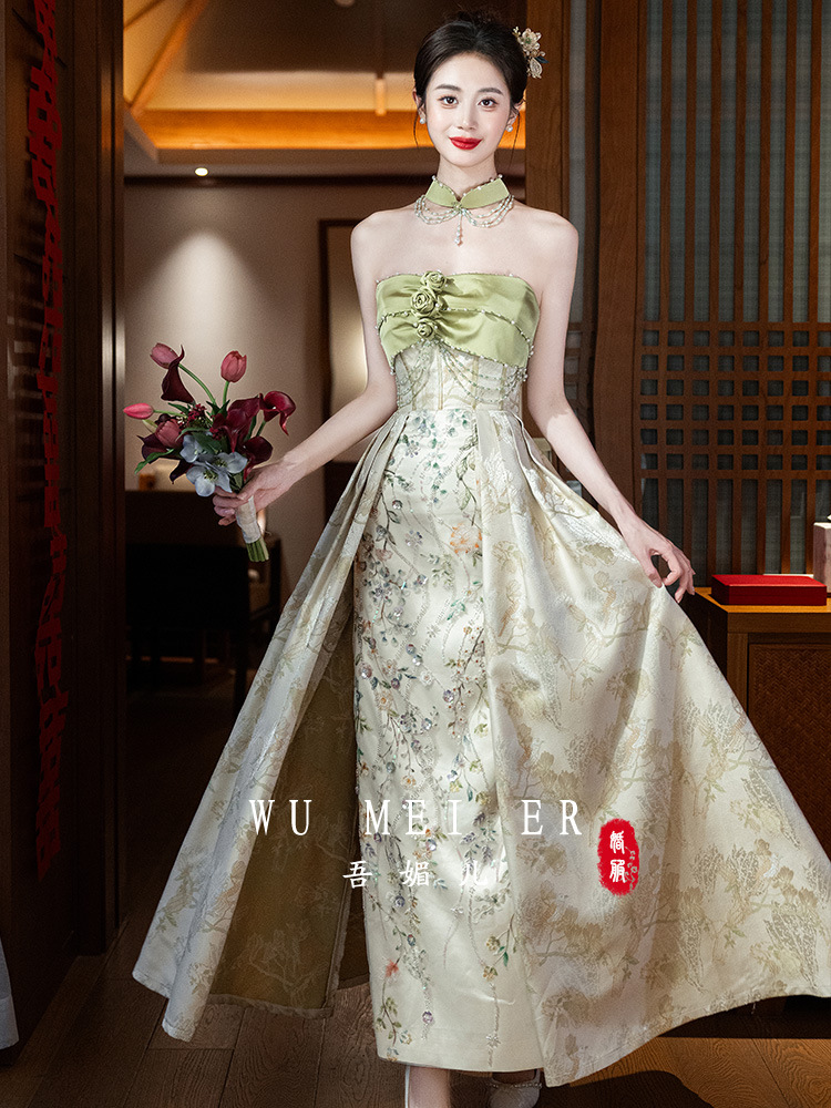 Новые китайские помолвки платья 2025 новые легкие роскошные нишевые невесты тост тонкое платье назад