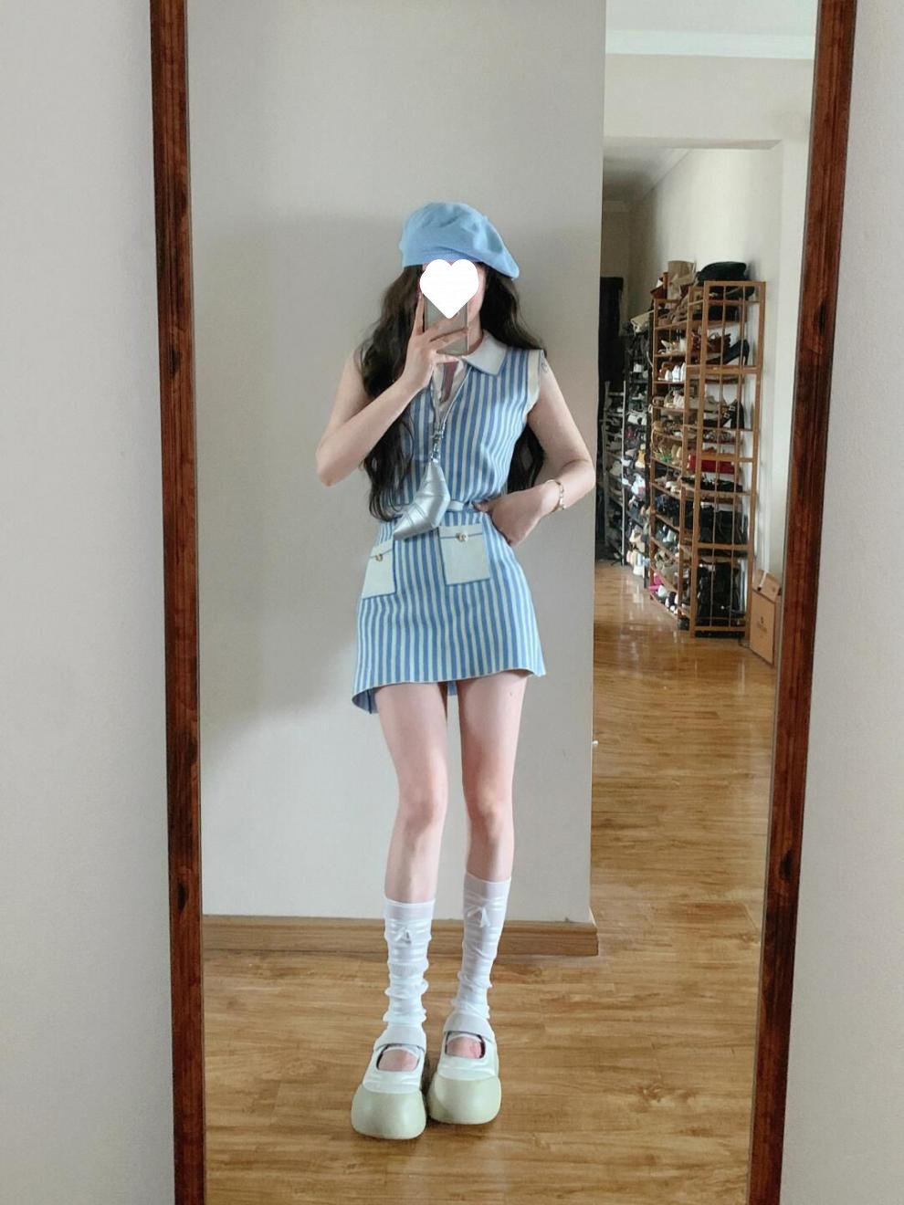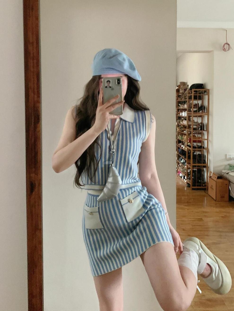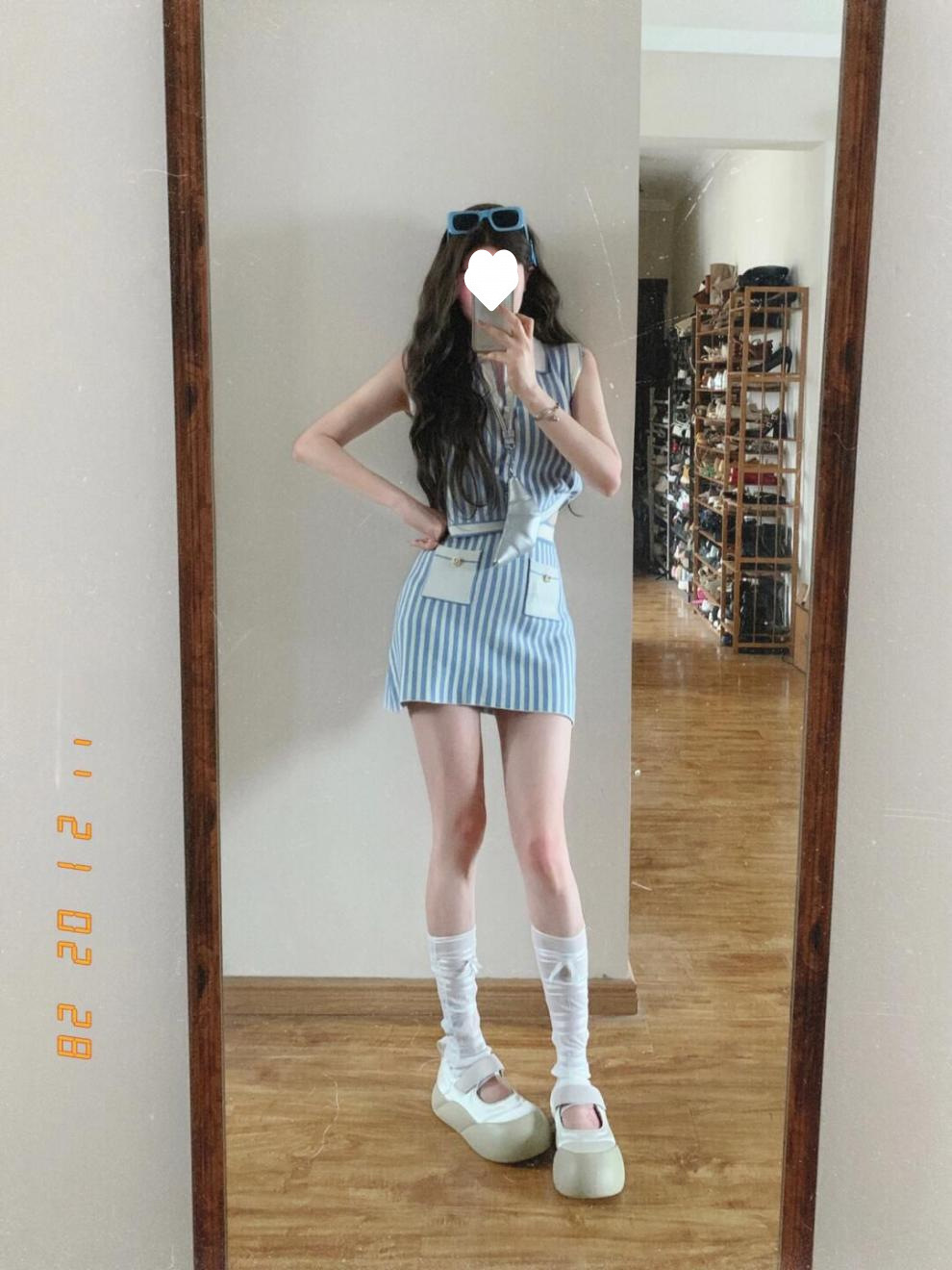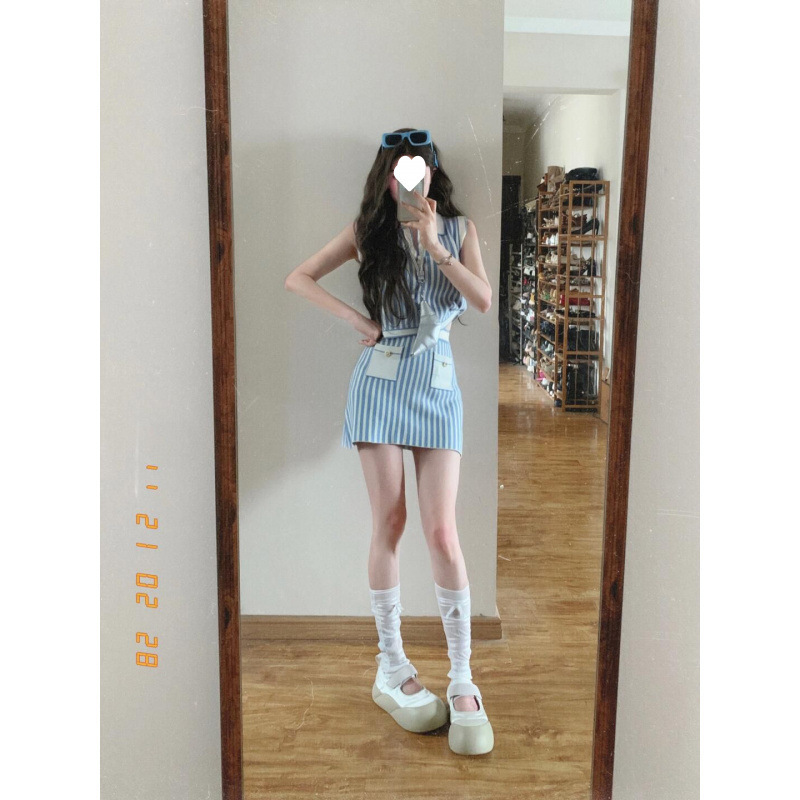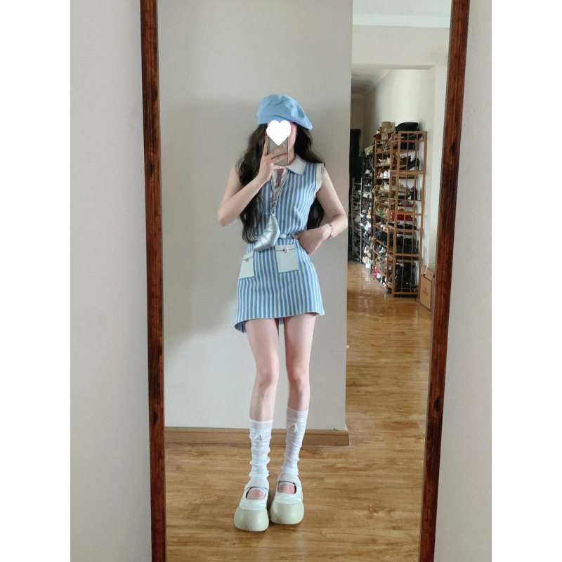 Морская соль мяты синий белый полосатый трикотажный костюм женский поло-воротник без рукавов жилет юбка