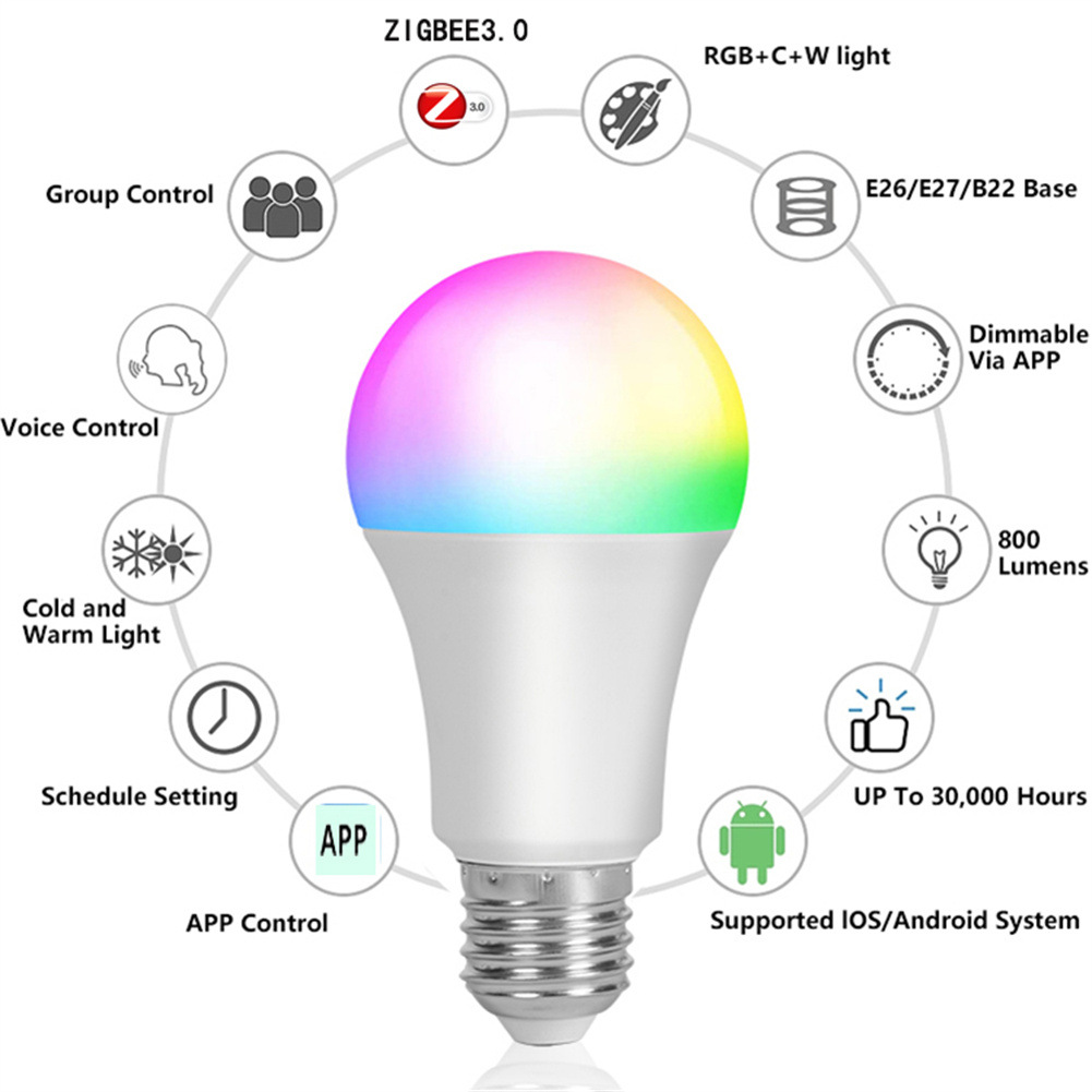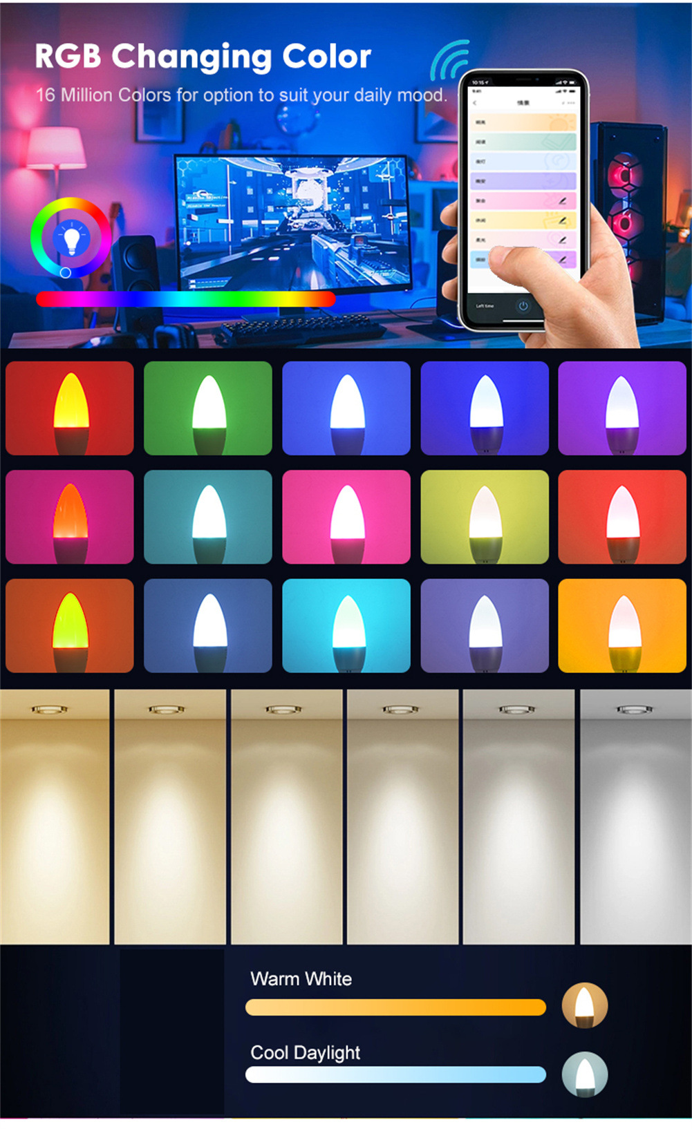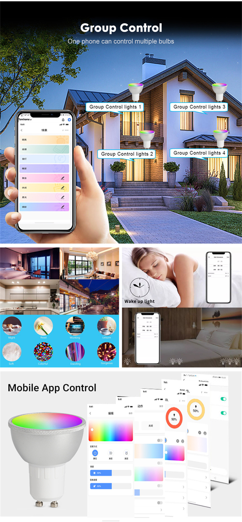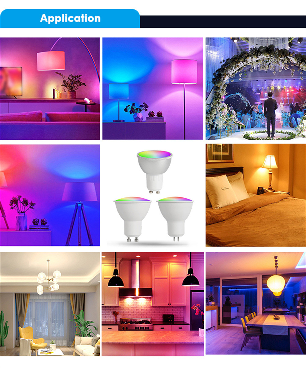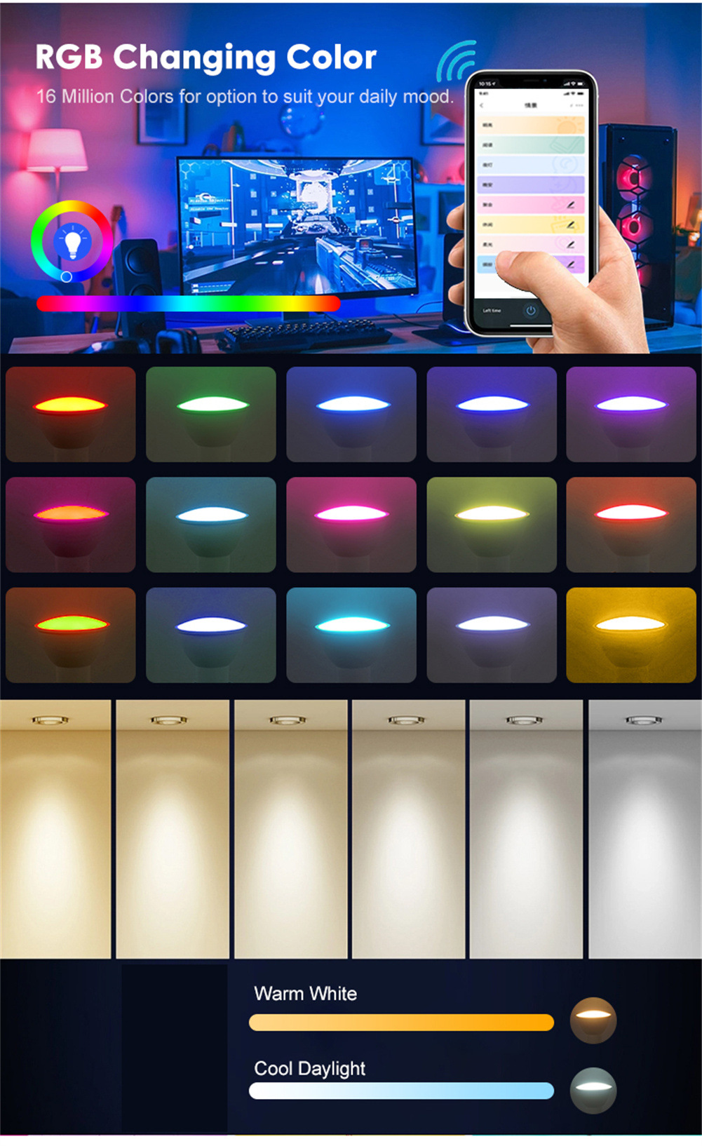可调光RGB:智能灯具有RGB色彩调节功能,可以呈现丰富多彩的色彩效果。同时,它还支持ww和CW调光,让您可以根据需要将照明调整到最舒适的状态。