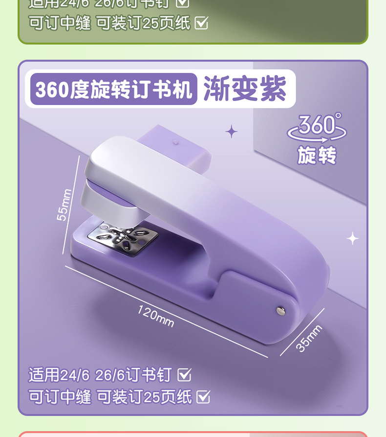 Поворотный степлер-градиентный порошок 560; Поворотный степлер-градиент фиолетовый 560; Поворотный степлер-градиент зеленый 560; Скобы 24/6 (1000 шт.)