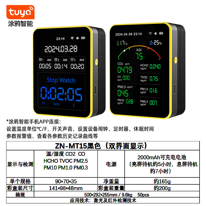 Окись углерода (CO), углекислый газ (CO2), частицы дымки, летучие органические соединения, HCHO, температура и влажность и т. д.