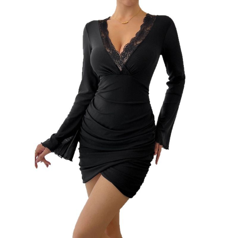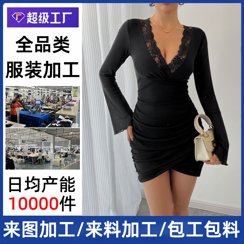 Европейские и американские облегающие короткие юбки, обработанные и изготовленные на заказ сетчатые сексуальные кружевные тонкие платья с колокольчатыми рукавами, брендовая обработка образцов