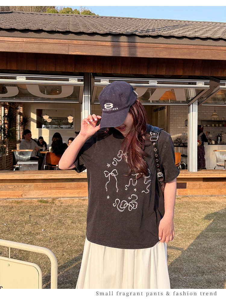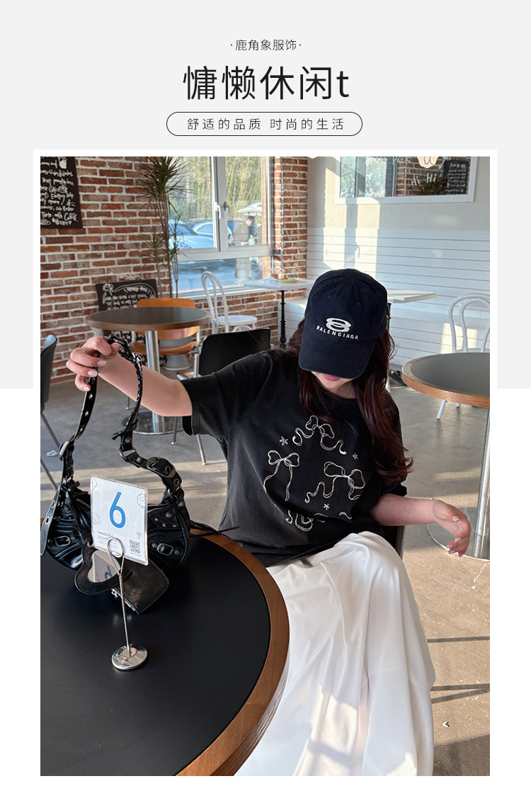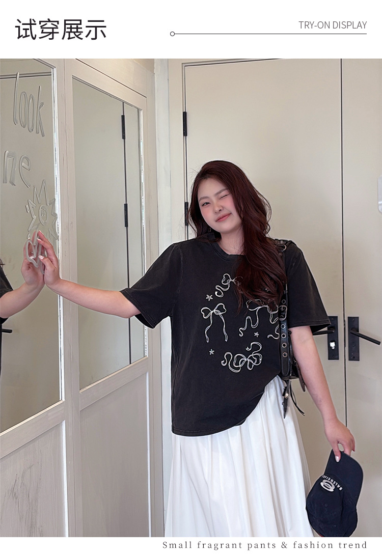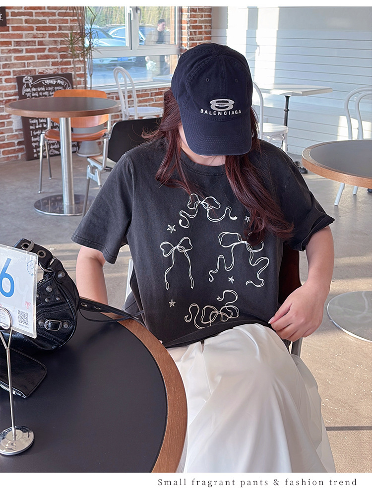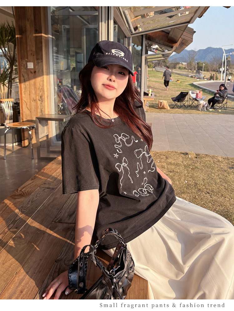 Большой размер женская ленивая повседневная банта с короткими рукавами летняя свободная темпераментная футболка толстый мм пуловер хлопчатобумажная нижняя рубашка