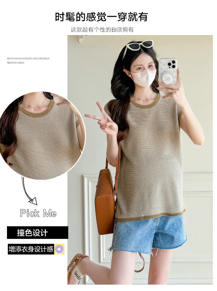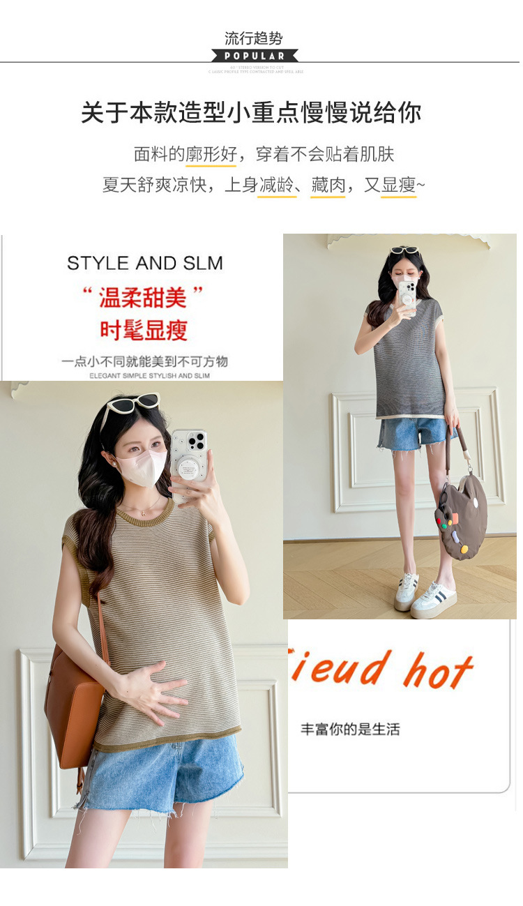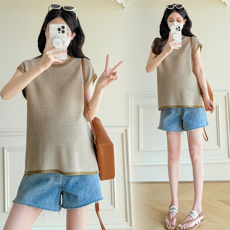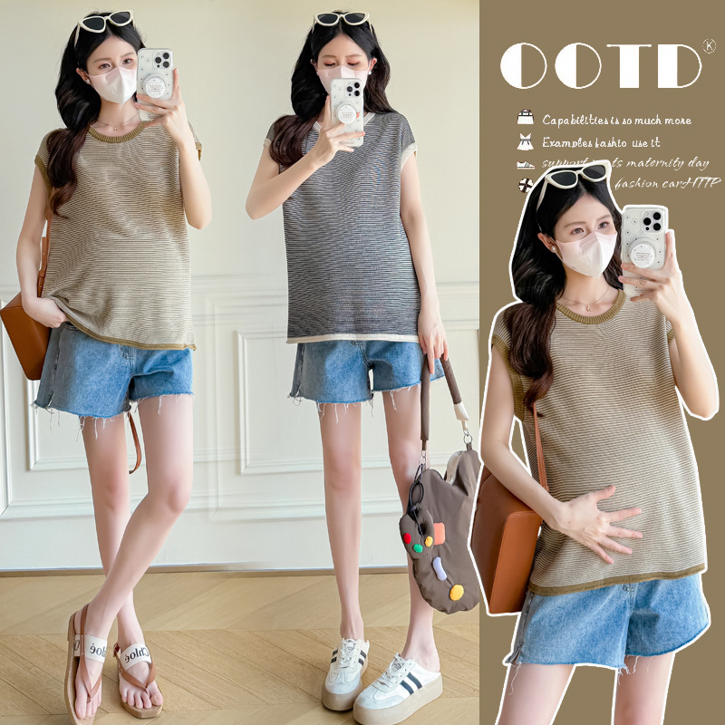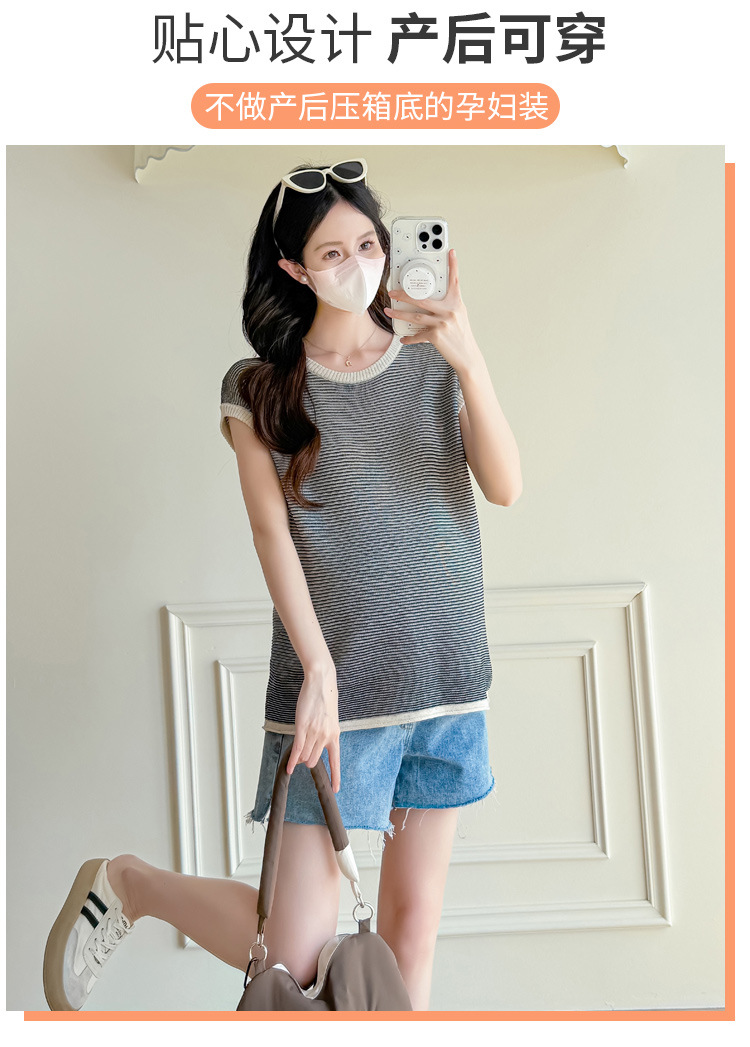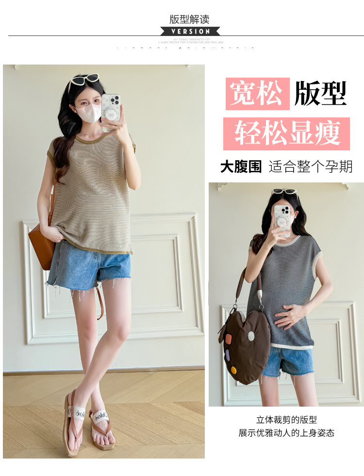 Настоящая фотография летней одежды для беременных 2025 года, модная и элегантная новая льняная рубашка из ледяного шелка, полосатый утягивающий топ и универсальный топ.