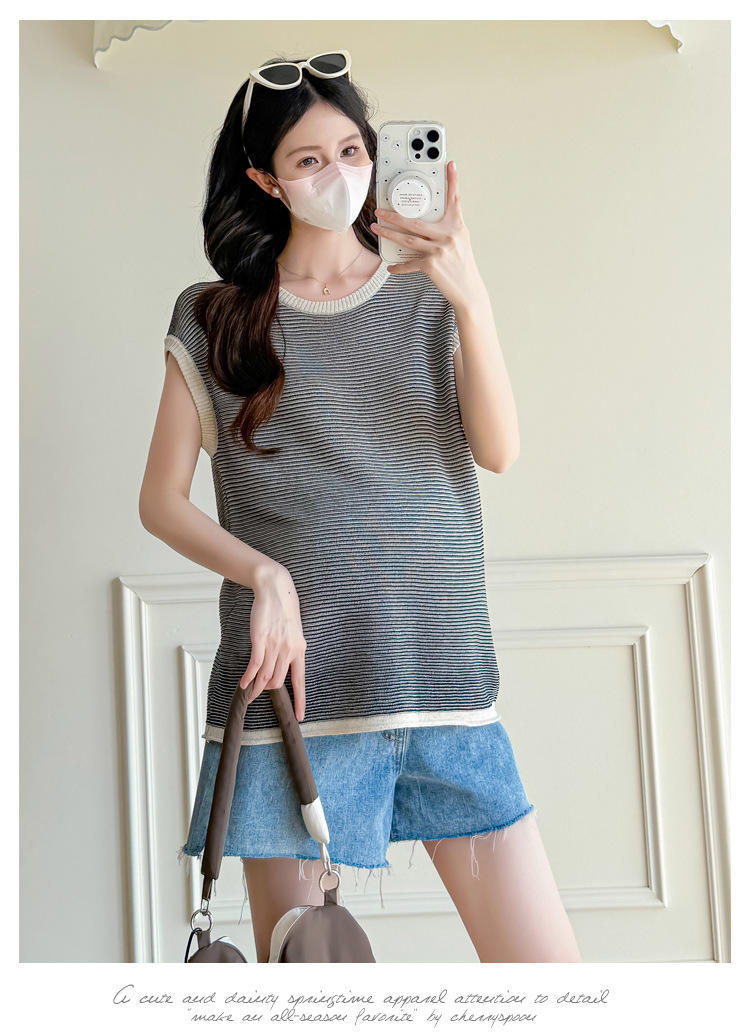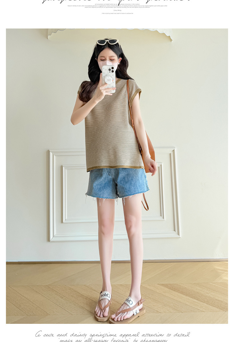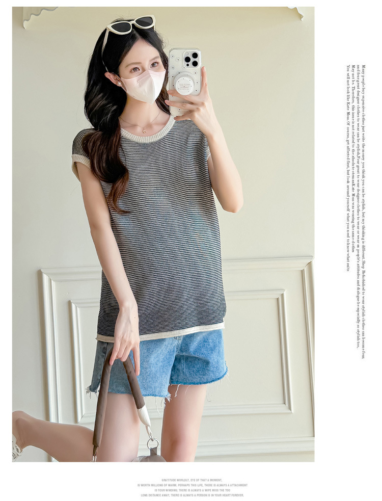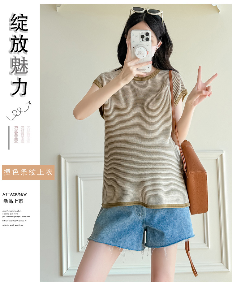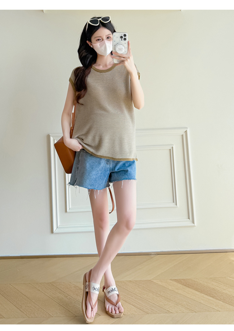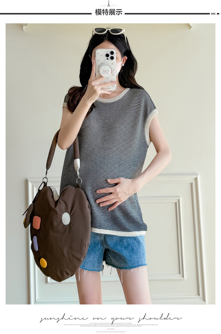 Настоящая фотография летней одежды для беременных 2025 года, модная и элегантная новая льняная рубашка из ледяного шелка, полосатый утягивающий топ и универсальный топ.