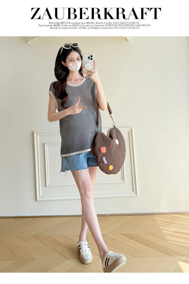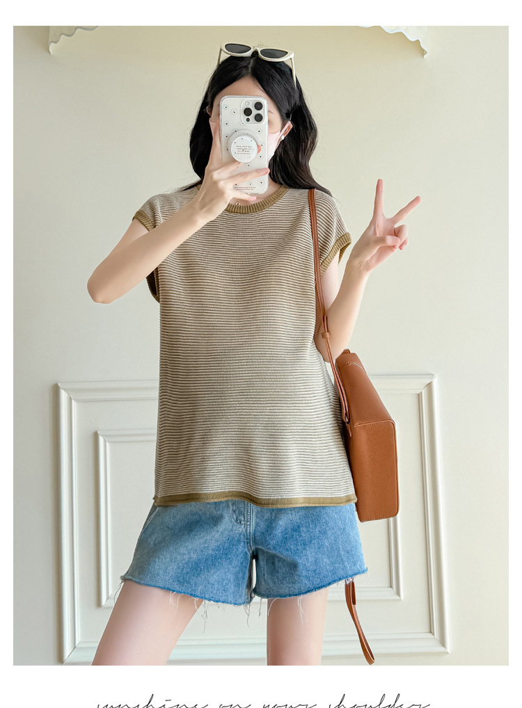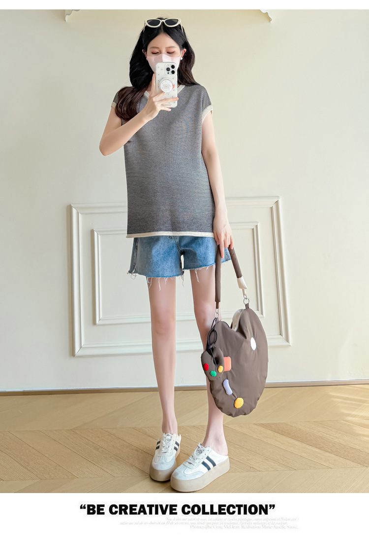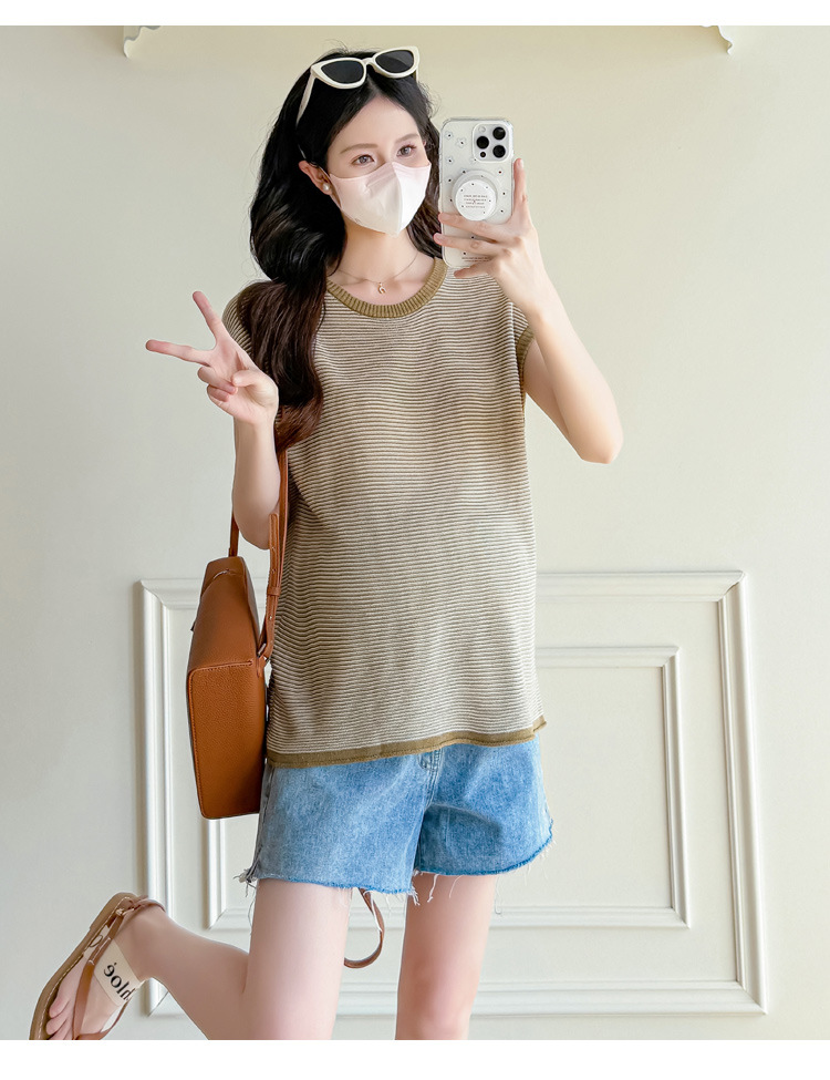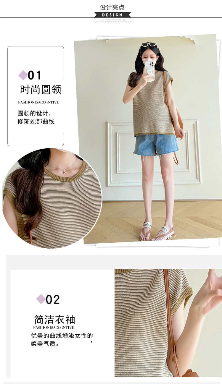 Настоящая фотография летней одежды для беременных 2025 года, модная и элегантная новая льняная рубашка из ледяного шелка, полосатый утягивающий топ и универсальный топ.