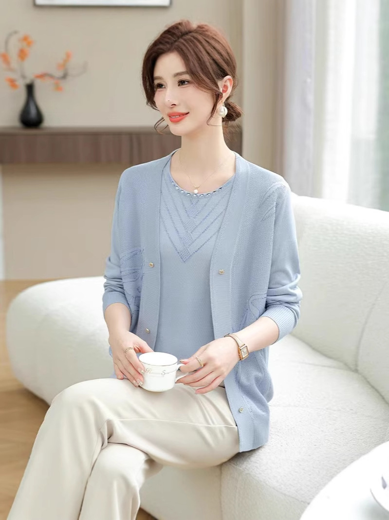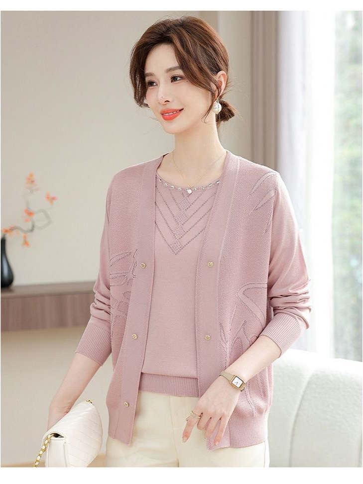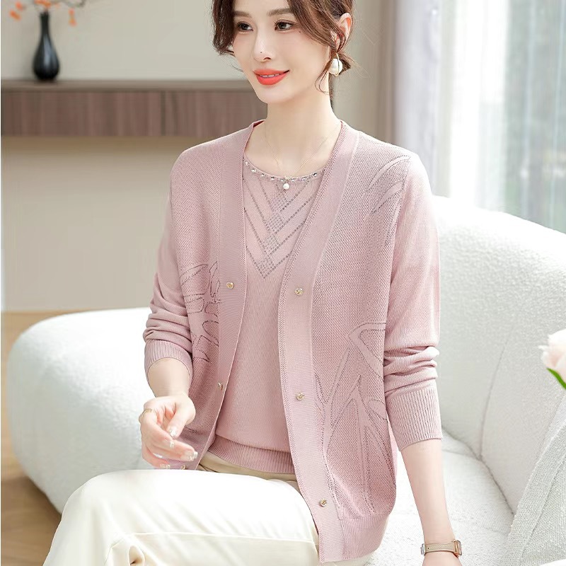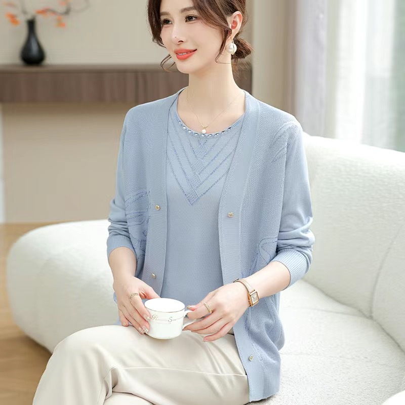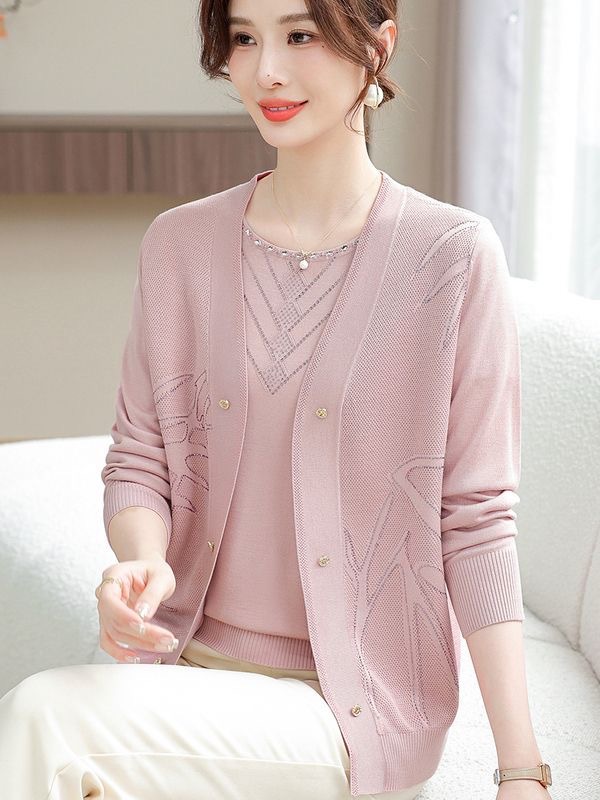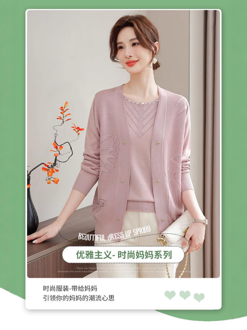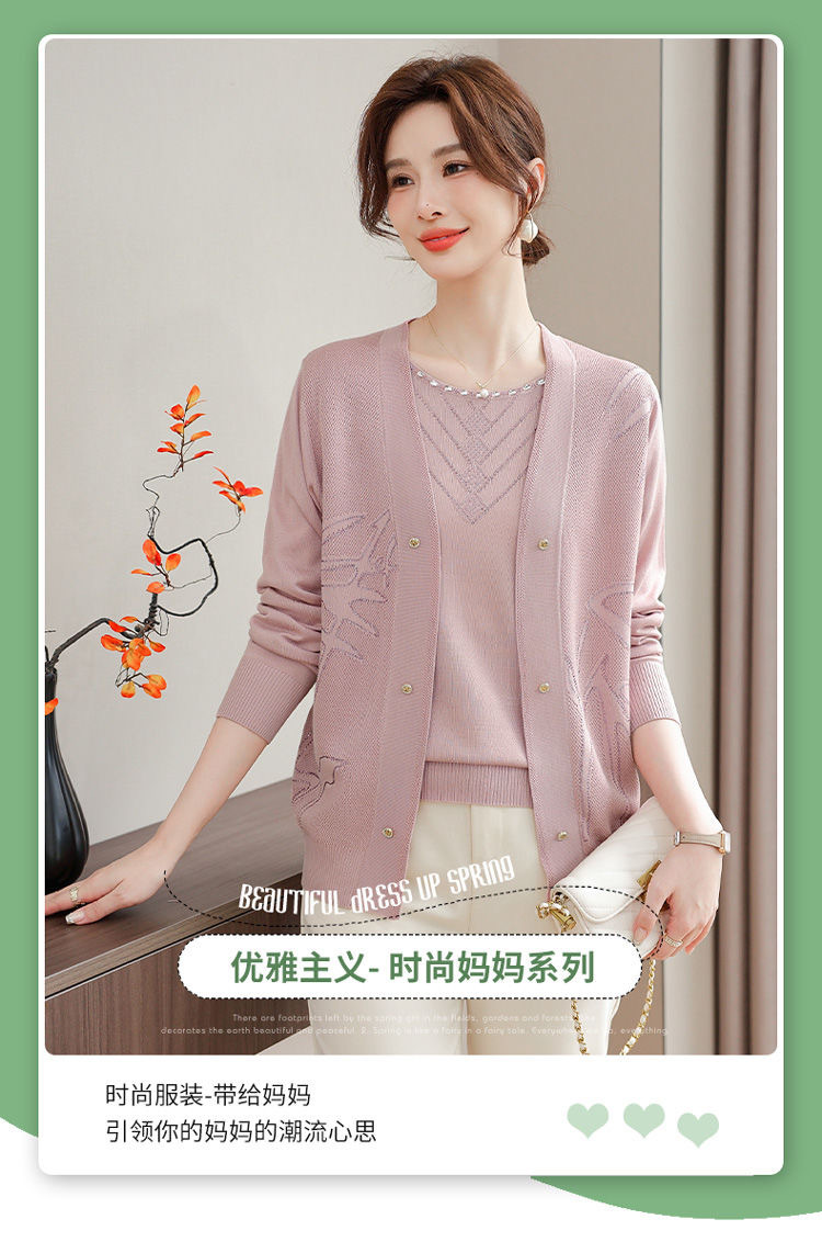 Весенний комплект одежды для новоиспеченной мамы: топ и кардиган для женщин среднего возраста, вязаный костюм в западном стиле, одежда для свекрови.