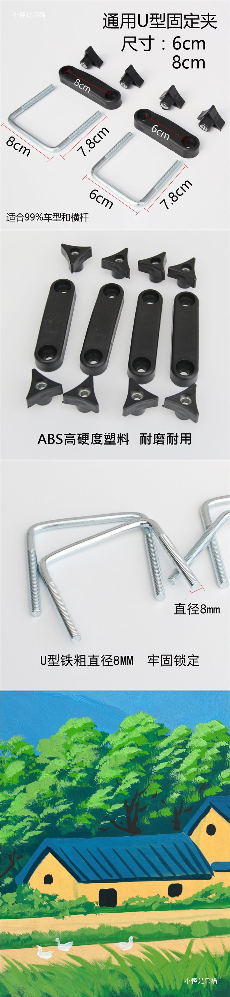 Зажим для крепления багажника, 1 шт., диаметром 6 см.; Зажимы для крепления багажника, 4 шт., диаметр 6 см.; Зажимы для крепления багажника, 4 шт., диаметр 8 см.; Зажим для крепления багажника, 1 шт. диаметром 8 см.