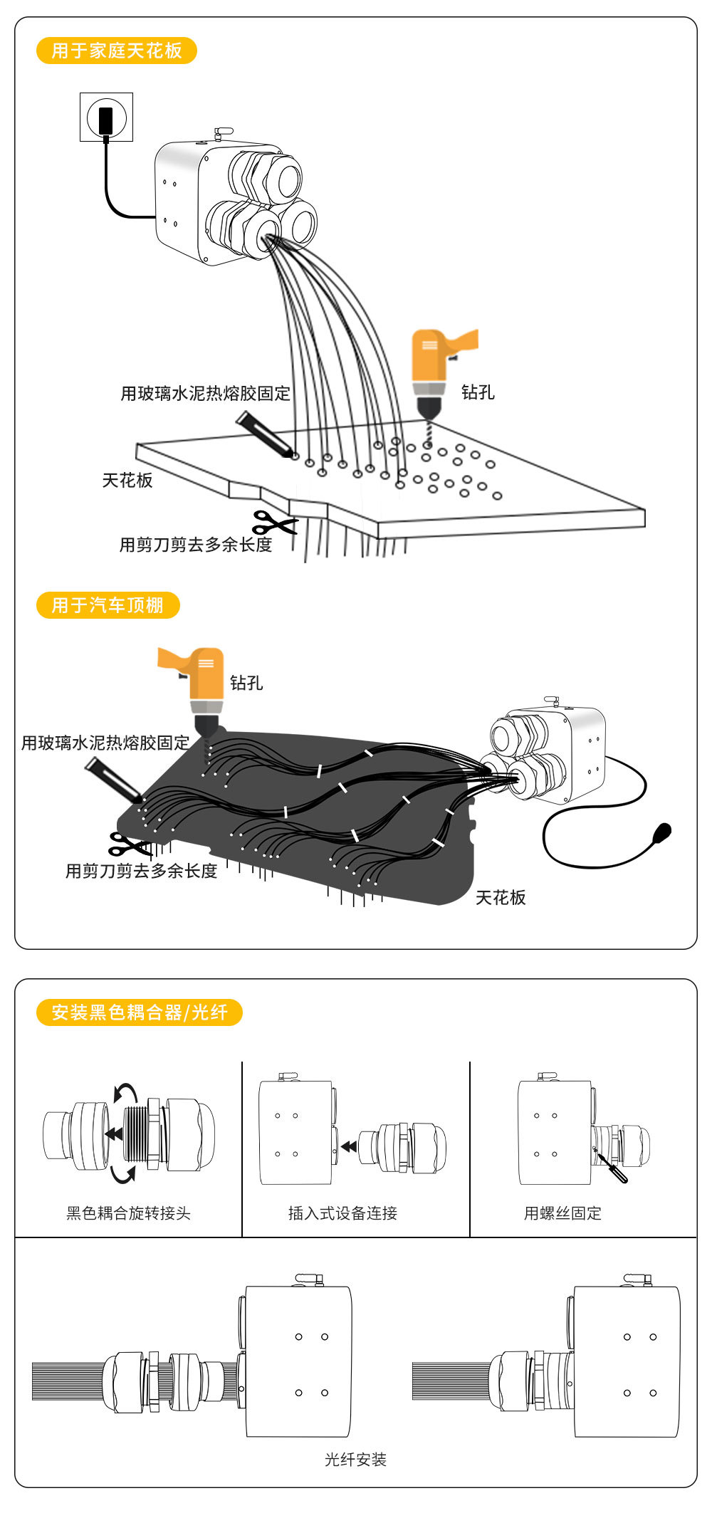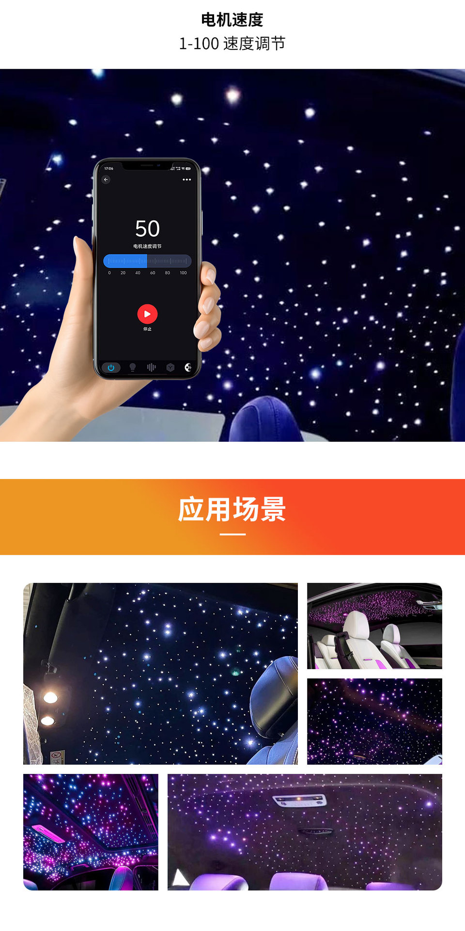 Светодиодный оптоволоконный светильник CCT+RGB для потолка автомобиля, атмосферный, с управлением через Bluetooth и приложение, 50 Вт, трехголовочный, мигающий источник света