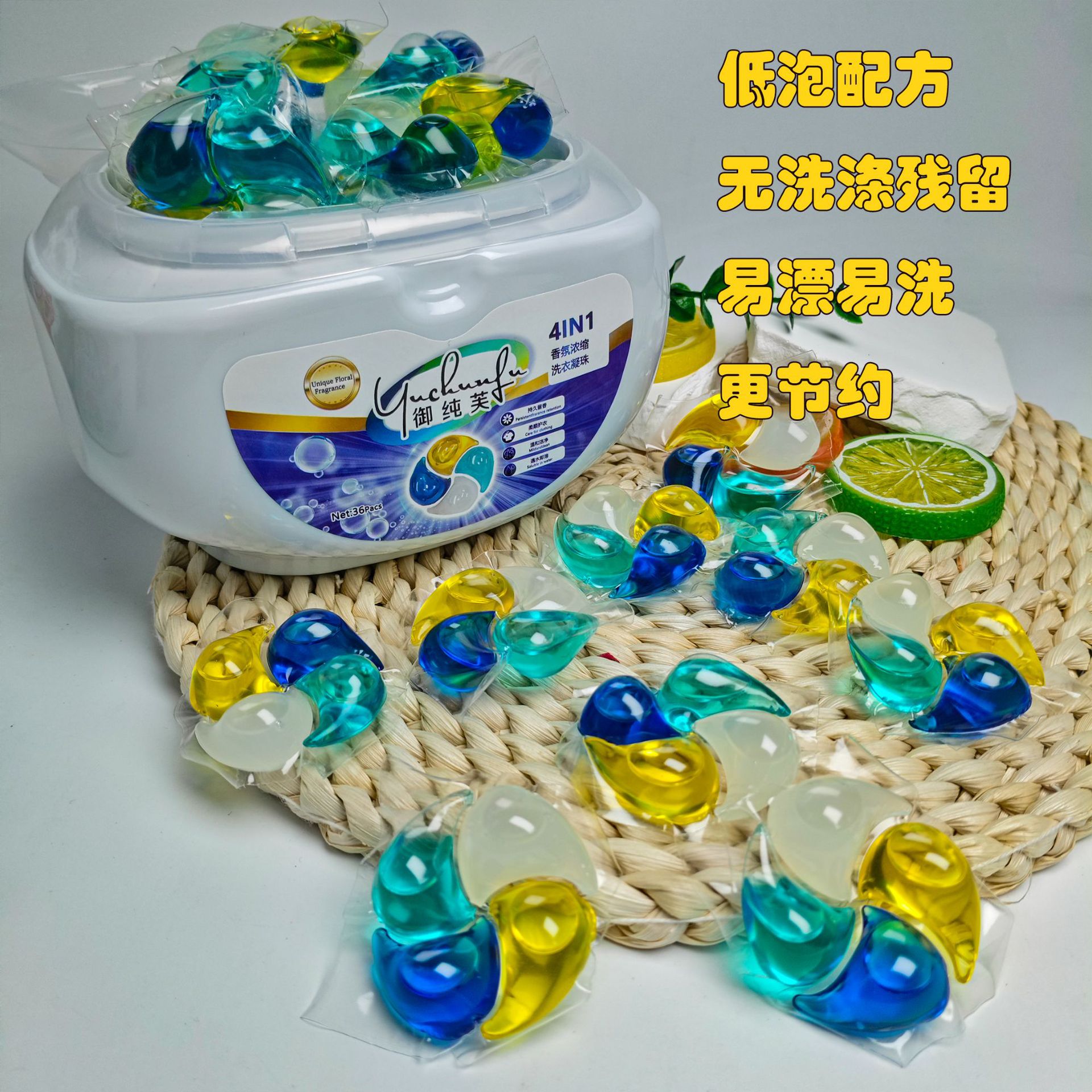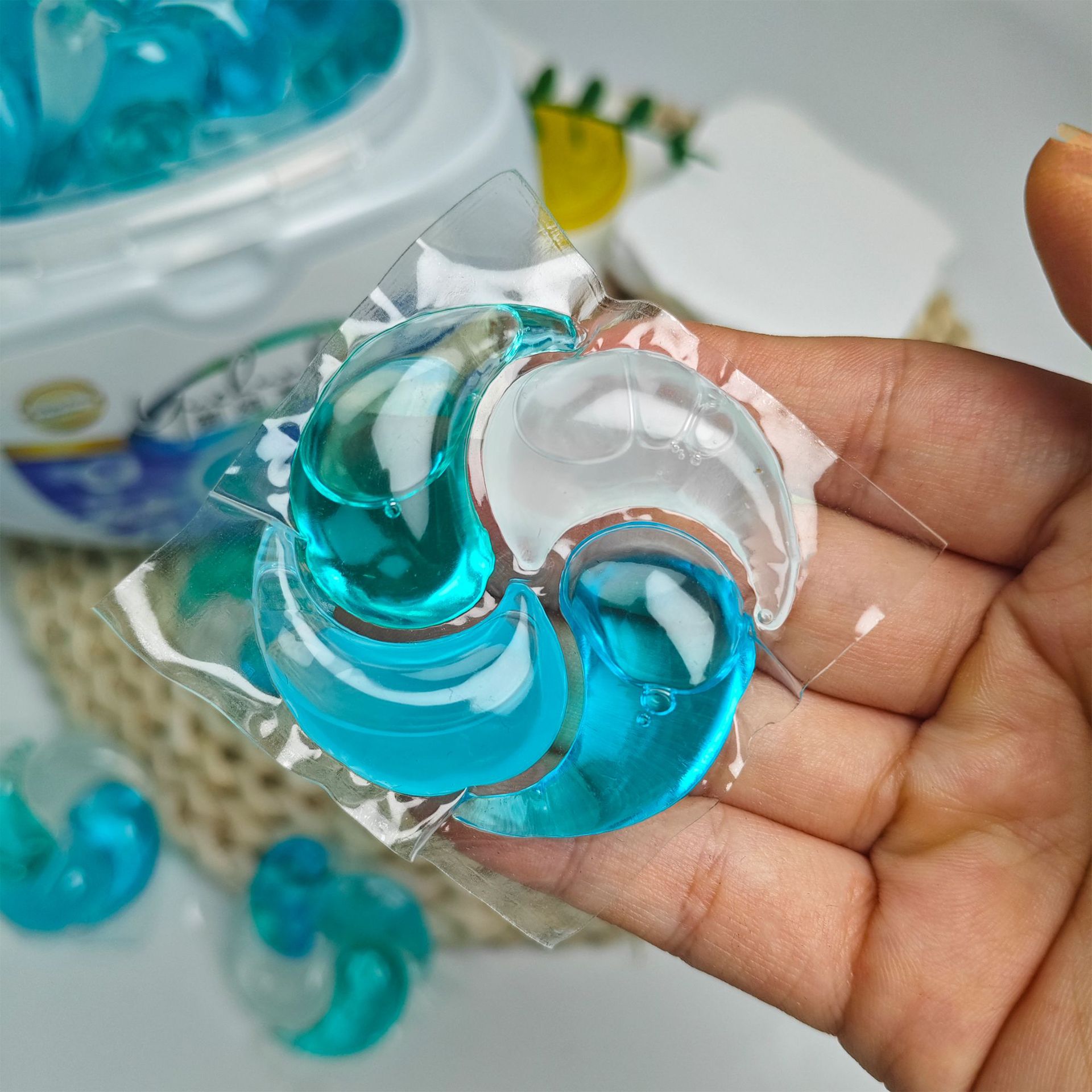 Производитель источника Концентрированные шарики для стирки «четыре в одном» весом 15 г с длительным ароматом, очищающие и обеззараживающие шарики для стирки с четырьмя полостями весом 12 г.