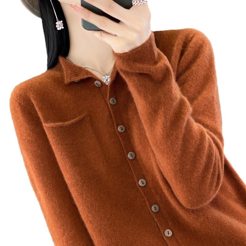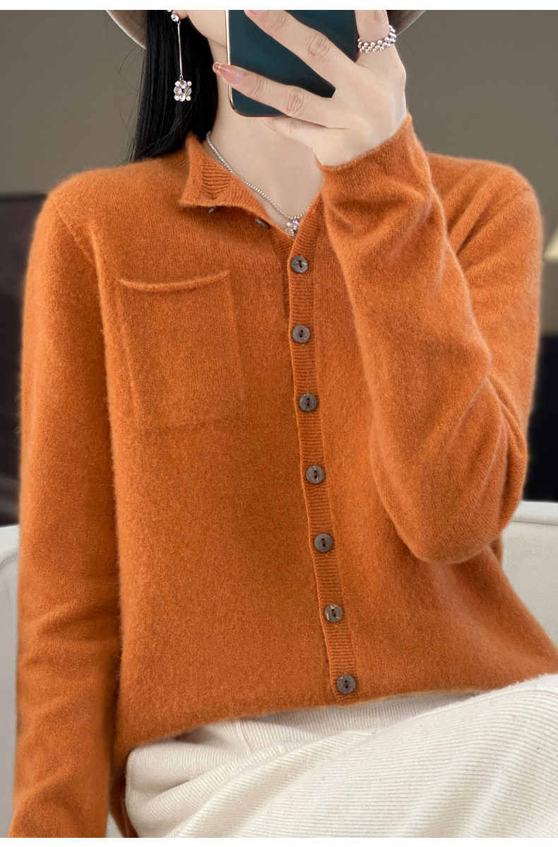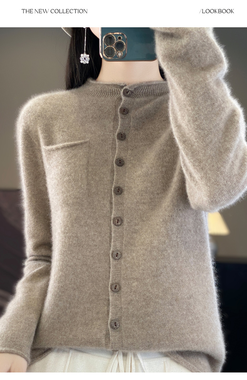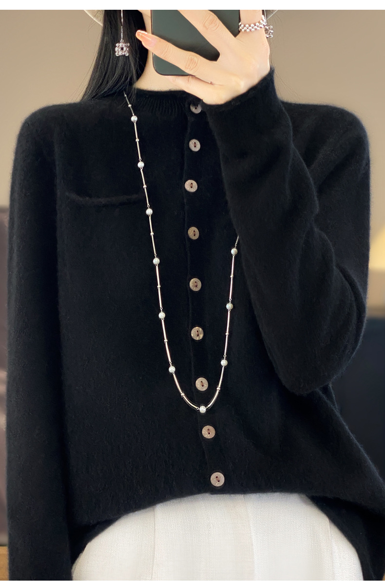 Однотонный готовый к носке шерстяной кардиган для женщин с закругленными краями, круглым вырезом и карманами, верхняя одежда с длинными рукавами, свитер, свободная кашемировая трикотажная верхняя одежда.