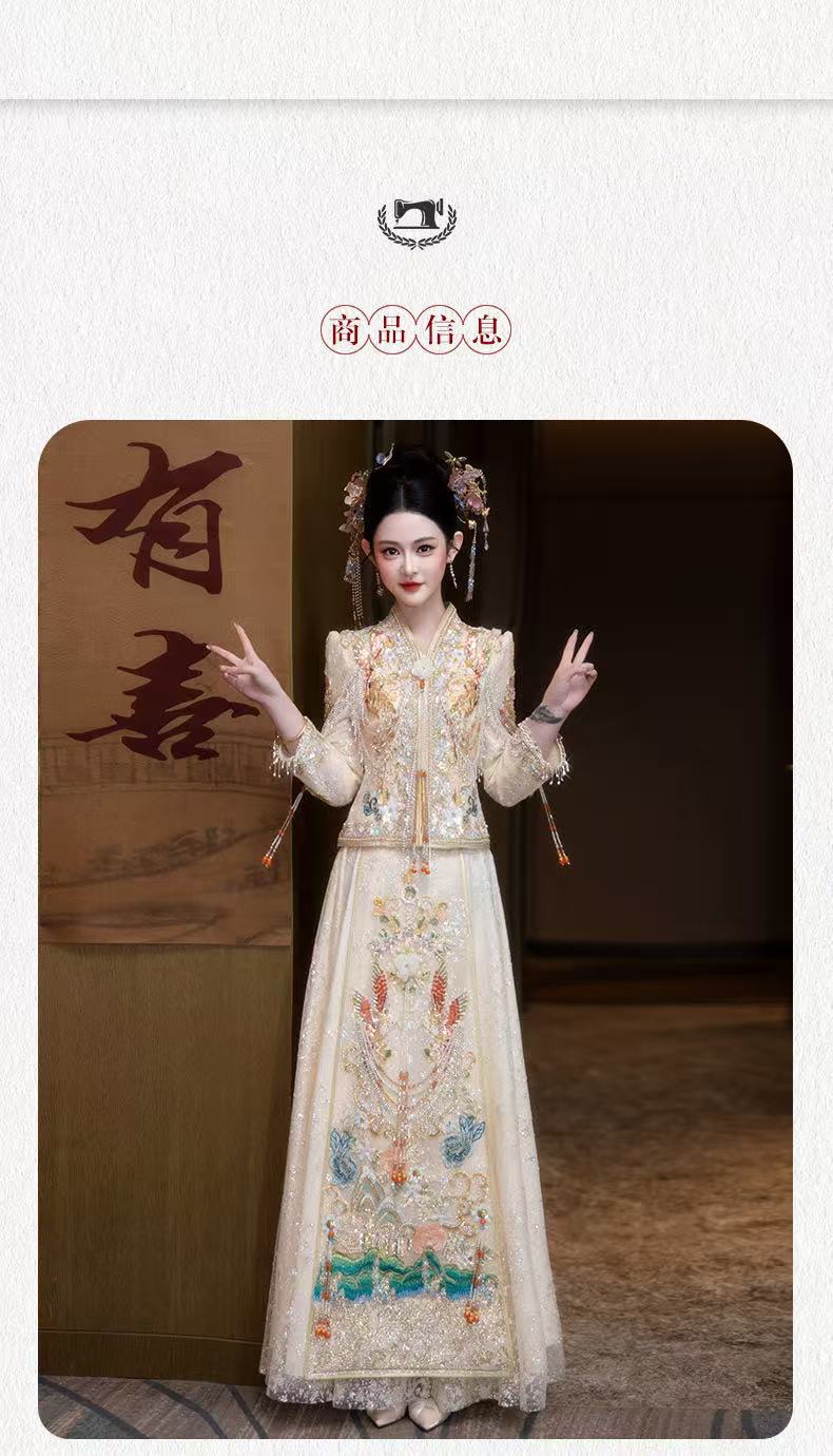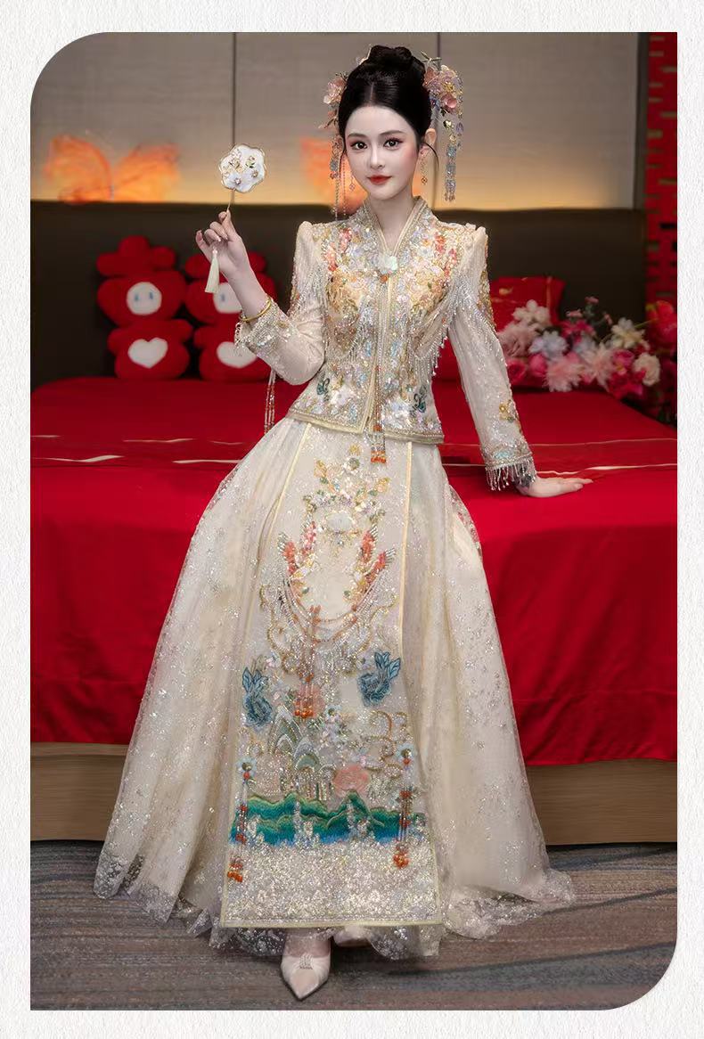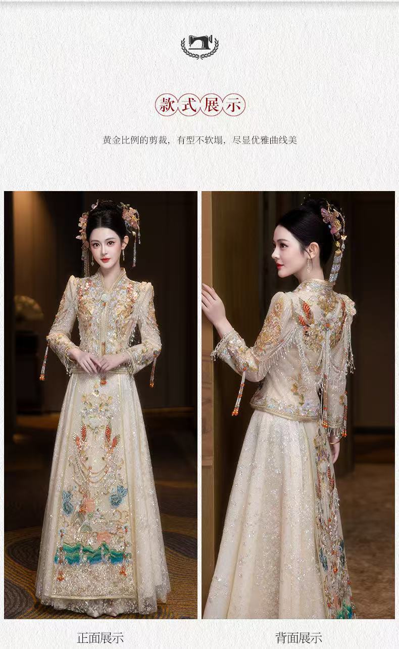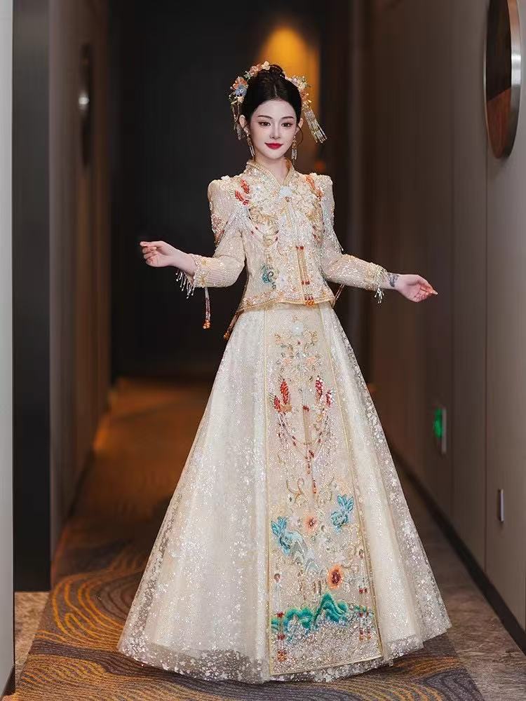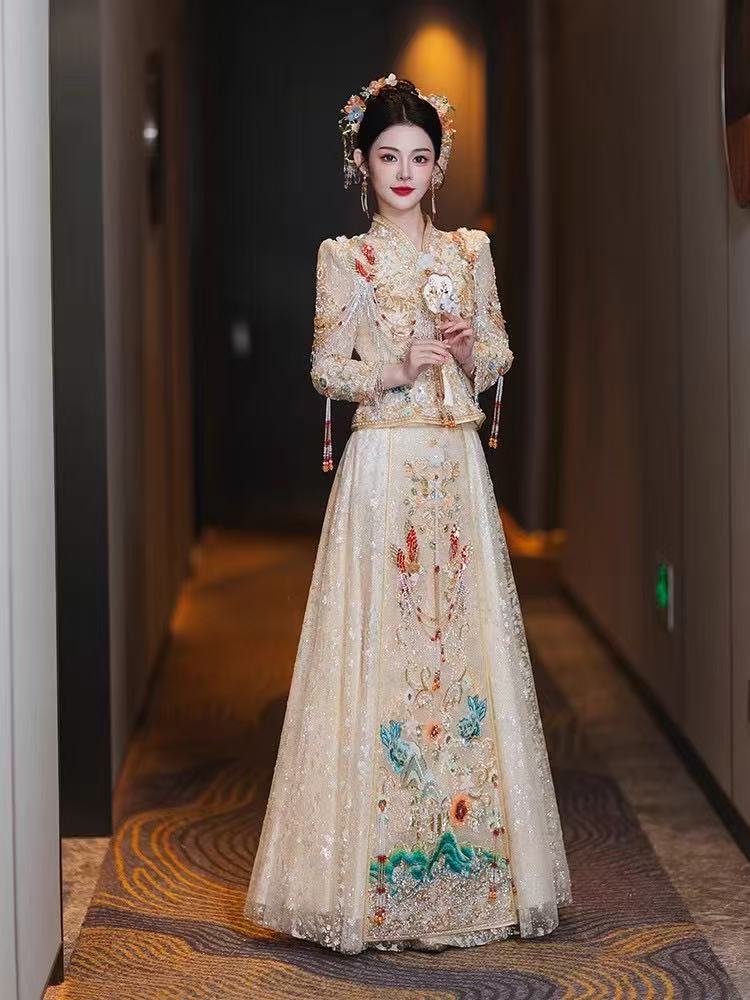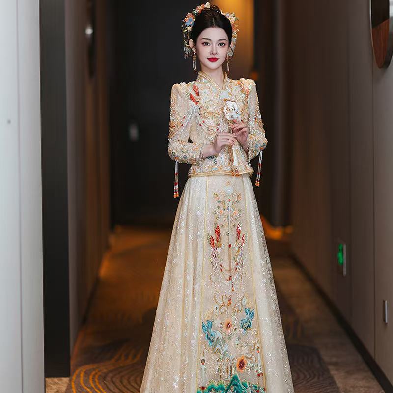 Свадебное платье Xiuhe цвета шампанского для невест, новое золотое свадебное платье в китайском стиле для банкетов, больших размеров для пышных женщин.