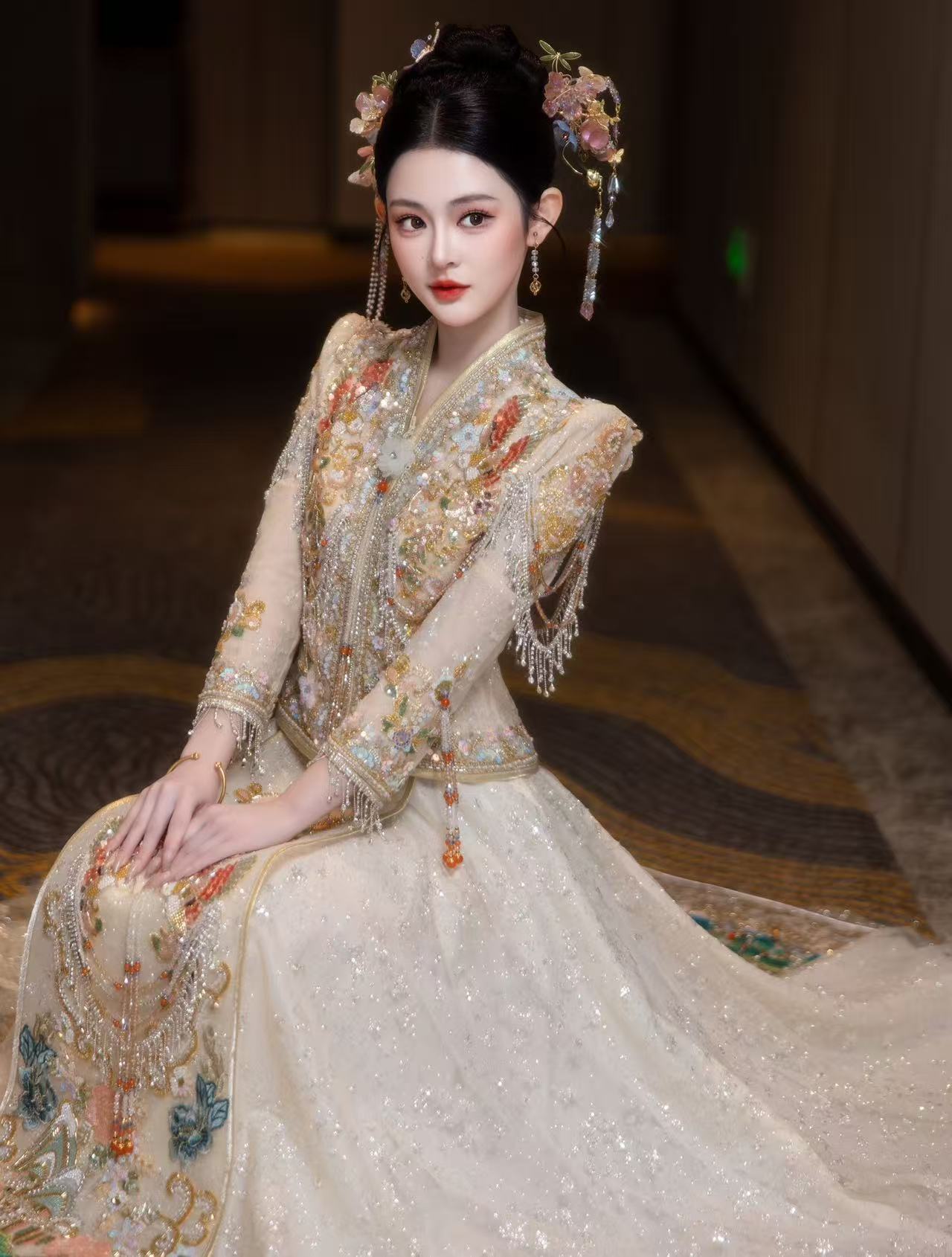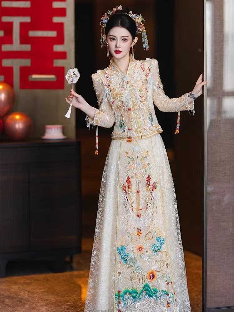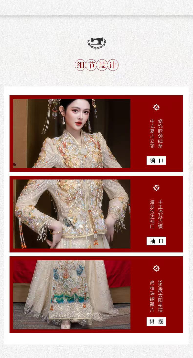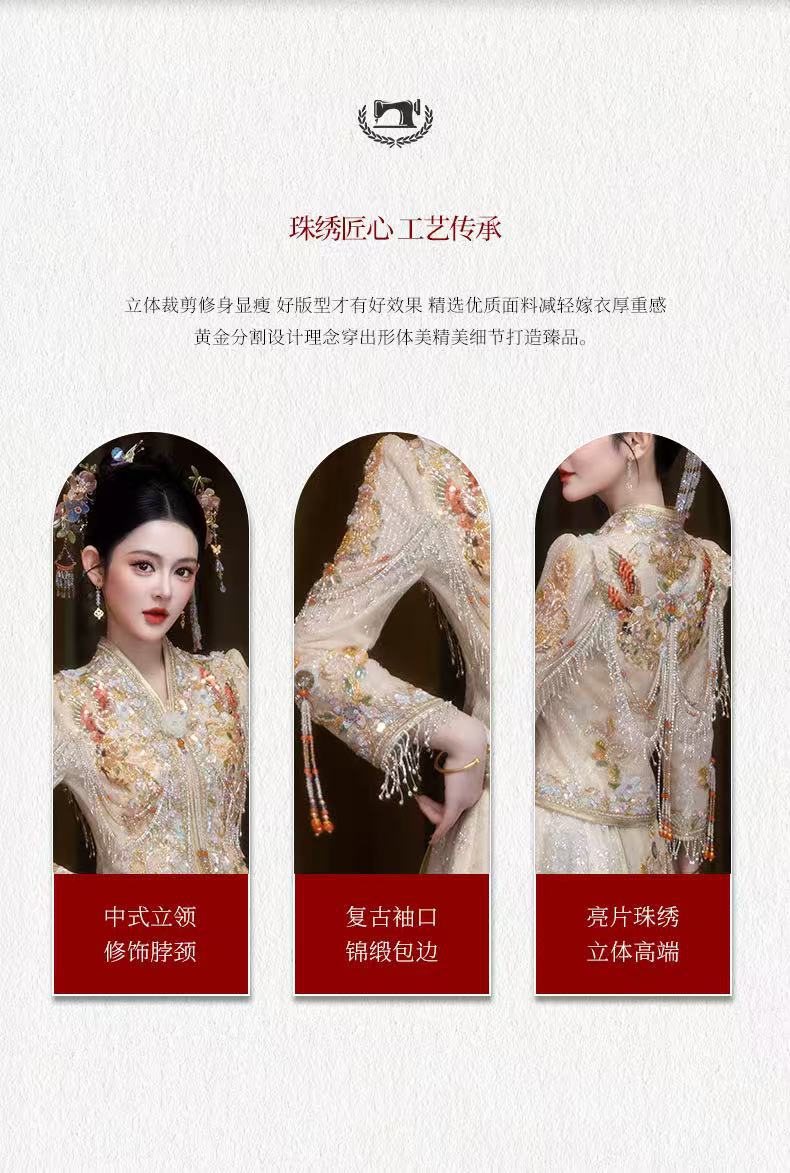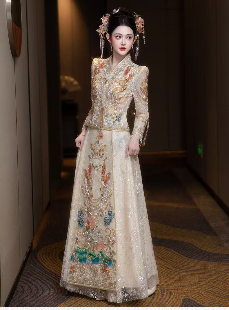 Свадебное платье Xiuhe цвета шампанского для невест, новое золотое свадебное платье в китайском стиле для банкетов, больших размеров для пышных женщин.