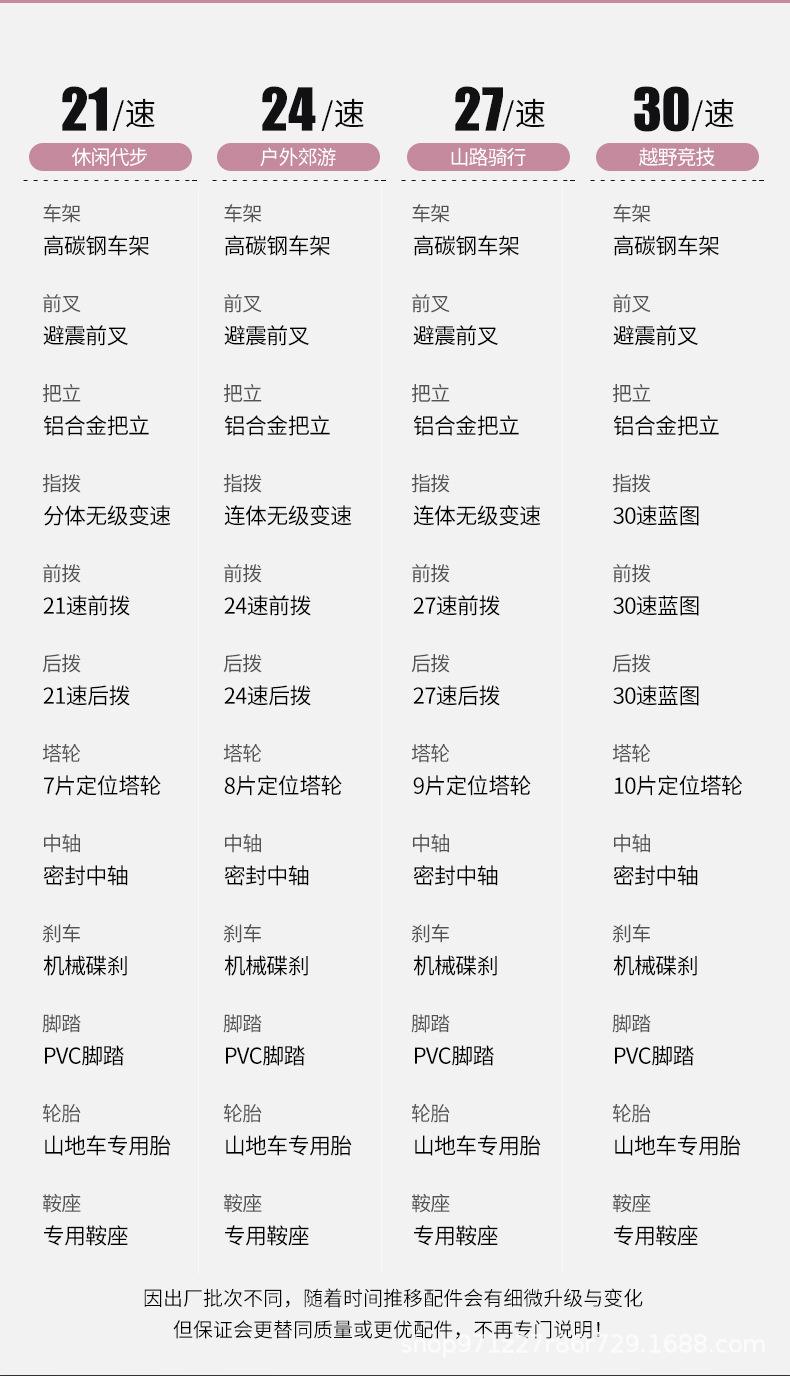 24 дюйма 21 скорость; 24 дюйма 24 скорости; 24 дюйма 27 скоростей; 24 дюйма, 30 скоростей; 26 дюймов 21 скорость; 26 дюймов 24 скорости; 26 дюймов 27 скоростей; 26 дюймов, 30 скоростей; 27,5 дюймов, 21 скорость; 27,5 дюймов, 24 скорости; 27,5 дюймов, 27 скоростей; 27,5 дюймов, 30 скоростей