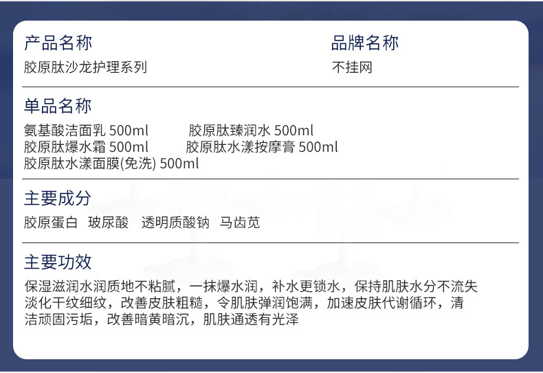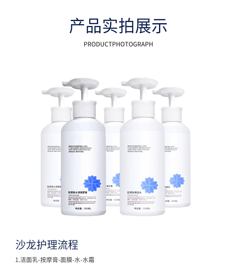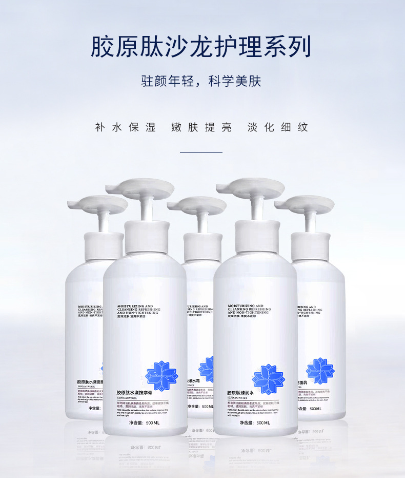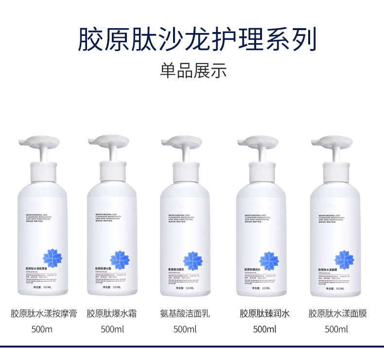 Очищающее средство с аминокислотами (готовый запас) 500 мл; Омолаживающая жидкость с коллагеновым пептидом (готовый запас) 500 мл; Крем с пептидной эссенцией коллагена (в наличии) 500 мл; Увлажняющий массажный крем с коллагеновым пептидом (готовый запас) 500 мл; Увлажняющая маска с коллагеновым пептидом (готовая партия) 500 мл; Комплект для ухода за кожей: 5 бутылочек (в наличии)