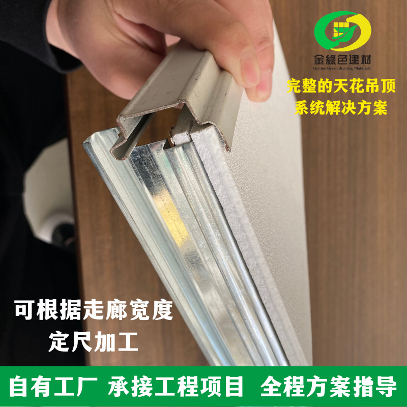 金绿色走廊无吊点可开启暗架龙骨系统,不需要打吊杆,不需要轻钢龙骨承重,搭配开槽矿棉板,可实现每一片板子都可以自由开启,不影响管道结构,方便后期维护检修。