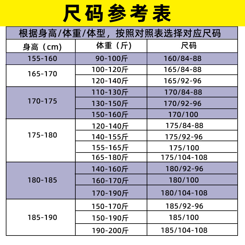 160/84-88; 160/92-96; 165/84-88; 165/92-96; 165/100; 170/88; 170/92-96; 170/100; 175/88; 175/92-96; 175/100; 175/104-108; 180/92-96; 180/100; 180/104-108; 185/92-96; 185/100; 185/104-108; 190/112-116