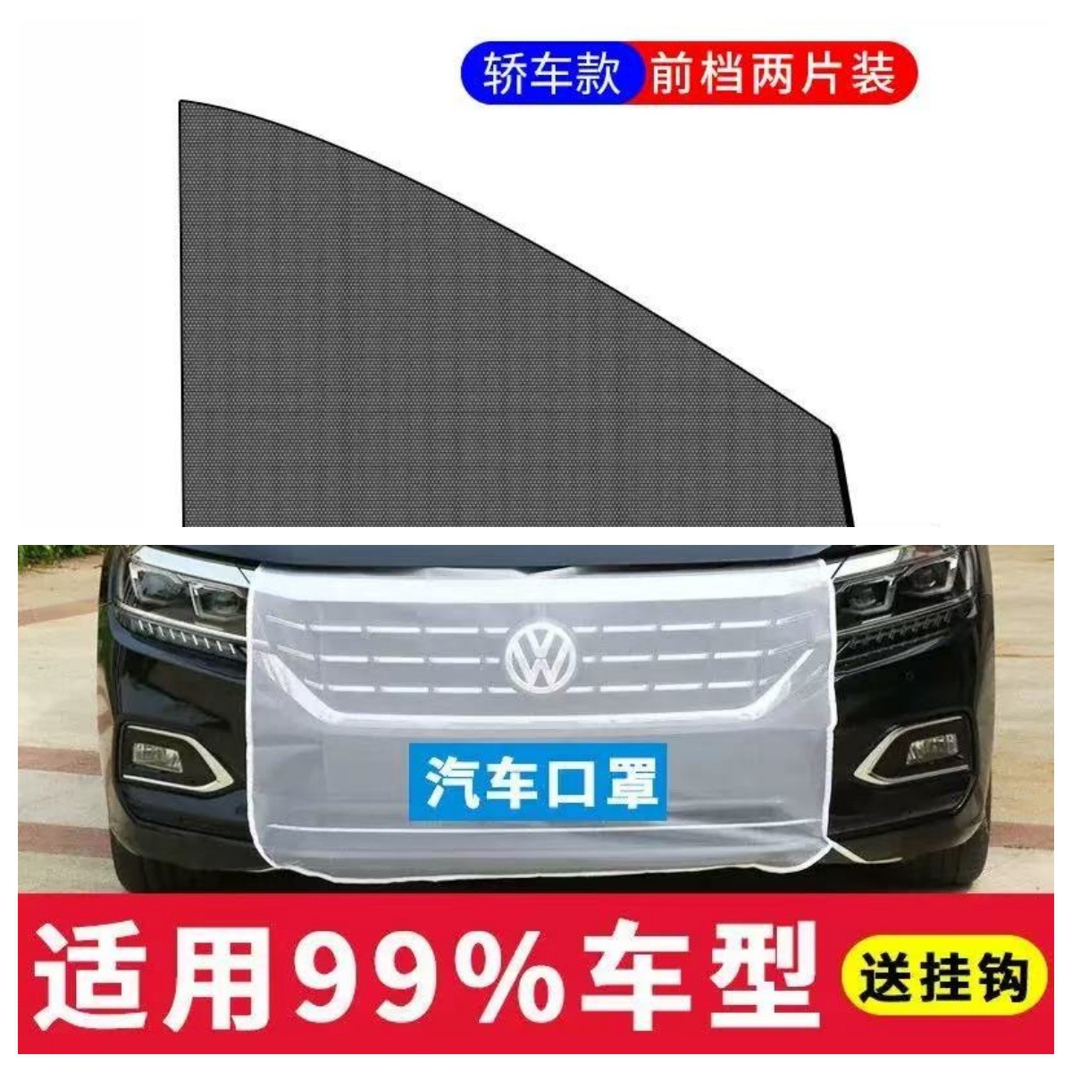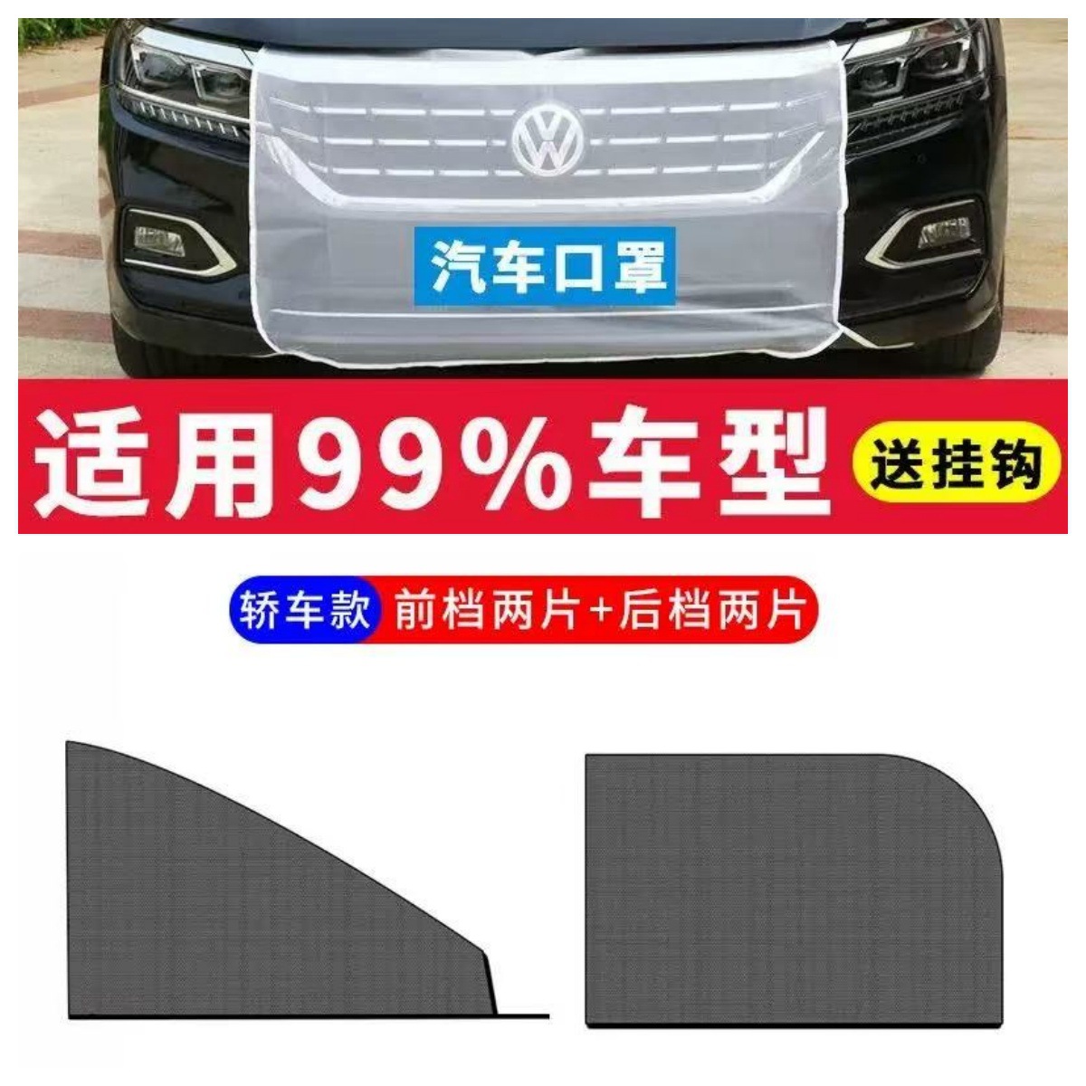 【安装方法】:打开汽车前盖,给产品安装好钩子,用钩子挂好汽车左右侧口,然后把下面的钩子挂入车下方的洞,然后整理一下关好车前盖,用剪刀把车牌前面的产品剪去。