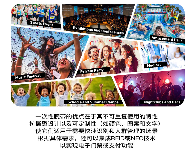 主要适用于各种儿童游乐园,探险乐园,欢乐谷,游泳馆,水上乐园,户外拓展,动漫展,运动比赛,户外活动,团队比赛,演唱会,景区门票,展会门票,校园活动,讲座等。