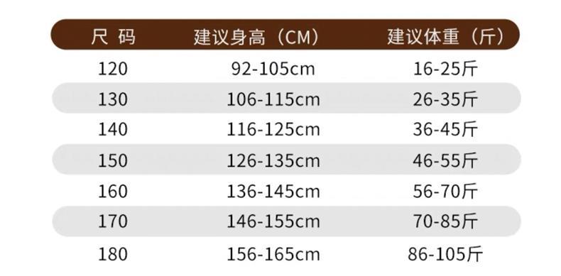 Размер 120 (рекомендуемый рост 90-110); Размер 130 (рекомендуемая высота 120); Размер 140 (рекомендуемая высота 130); 150 ярдов (рекомендуемая высота 140); Размер 160 (рекомендуемая высота 150); Размер 170 (рекомендуемый рост 160); Размер 180 (рекомендуемый рост 170); Размер 190 (рекомендуется на рост 170)