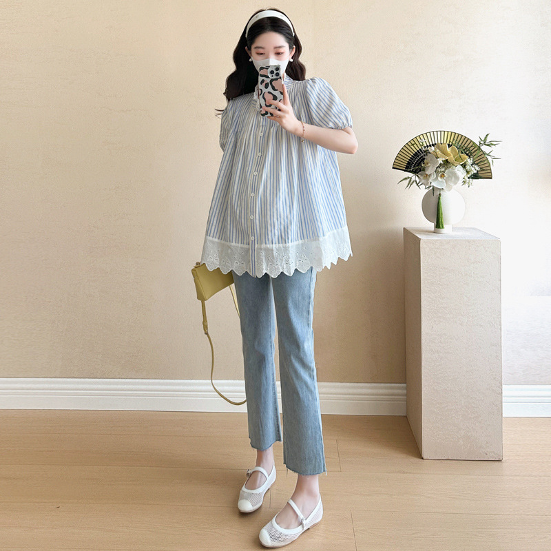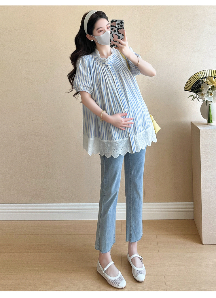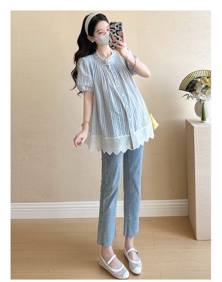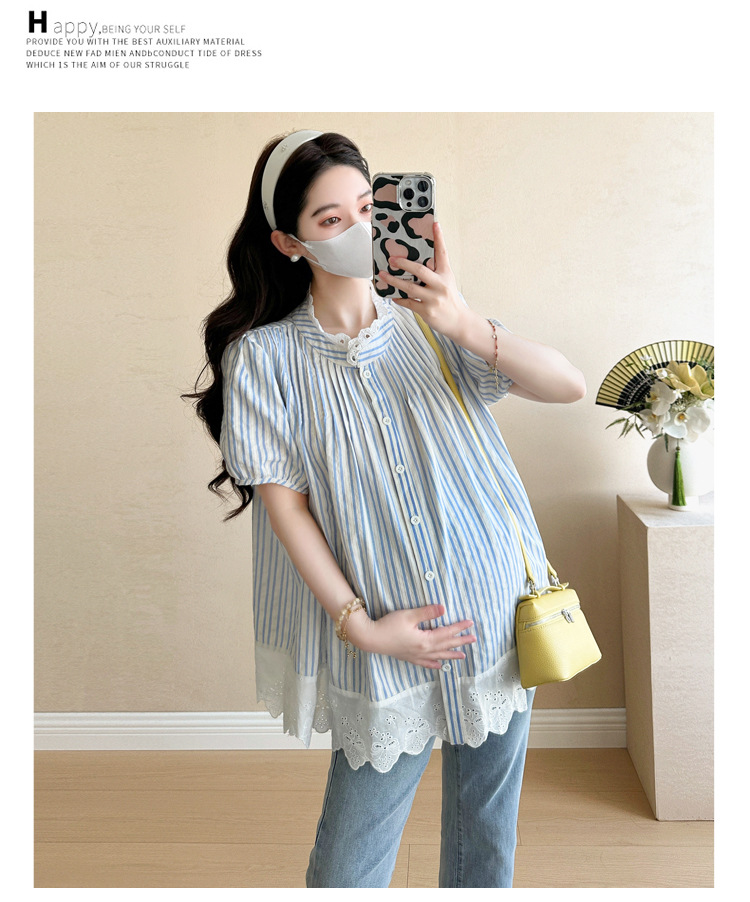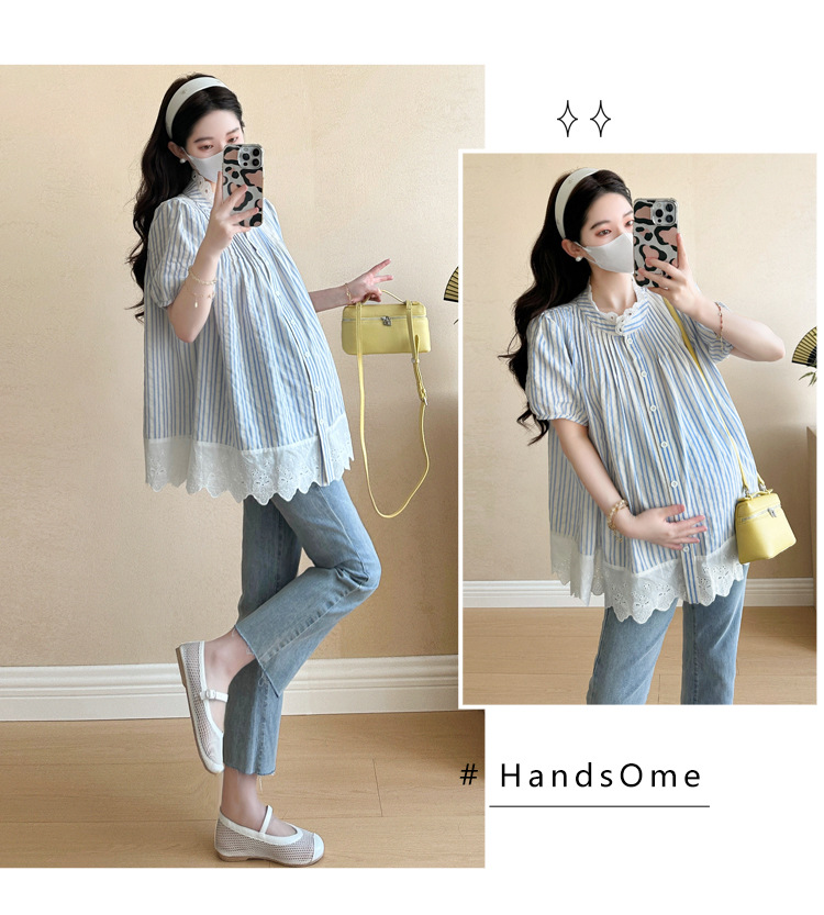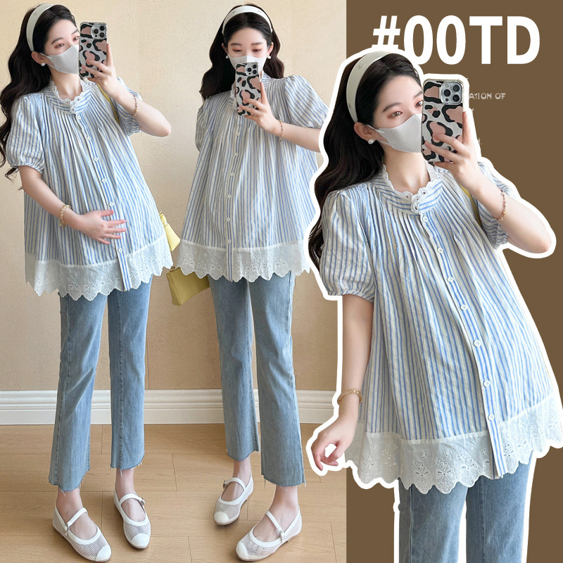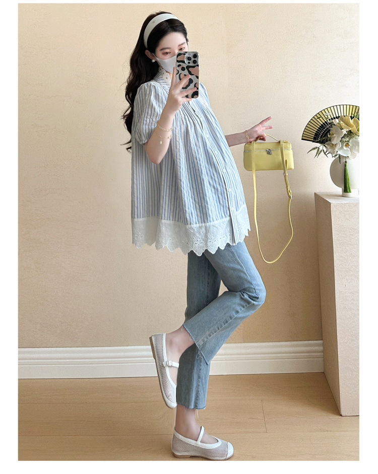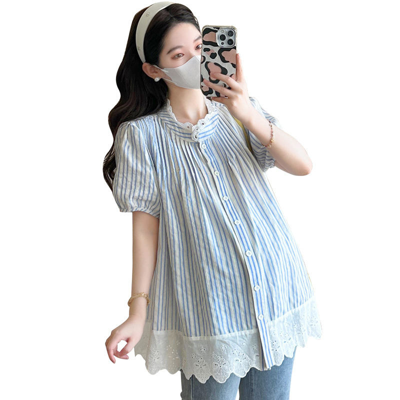 Пятно беременные рубашки летние новые хлопчатобумажные полоски плиссированные жаккардовые сшитые кружева для беременных топы могут открыть для кормления