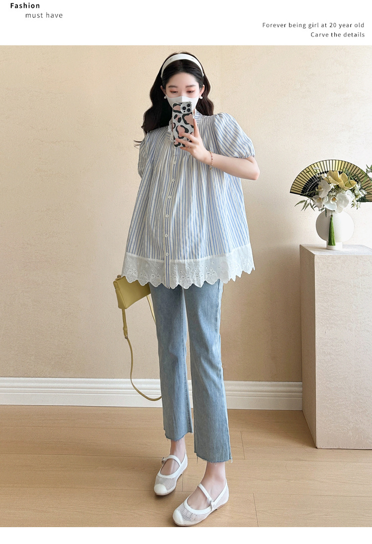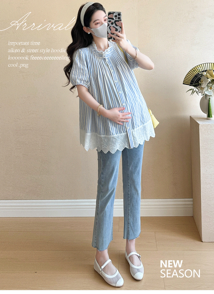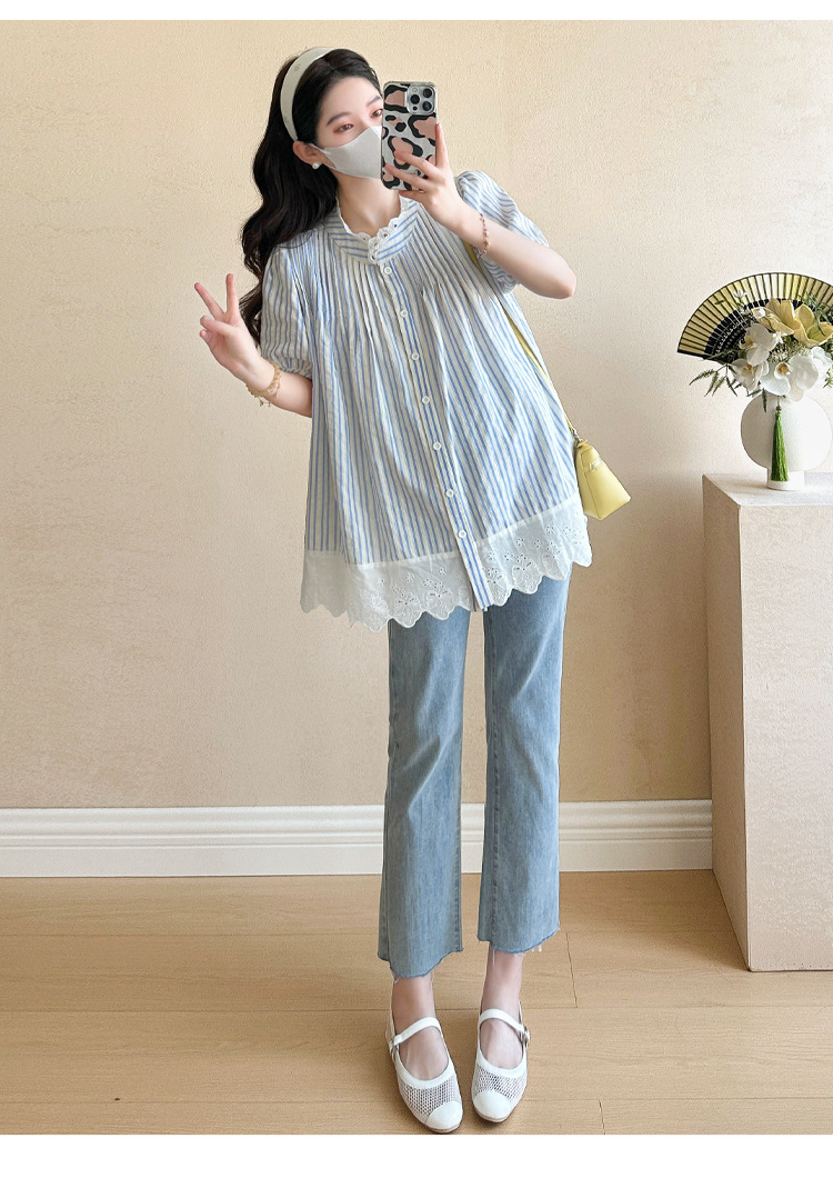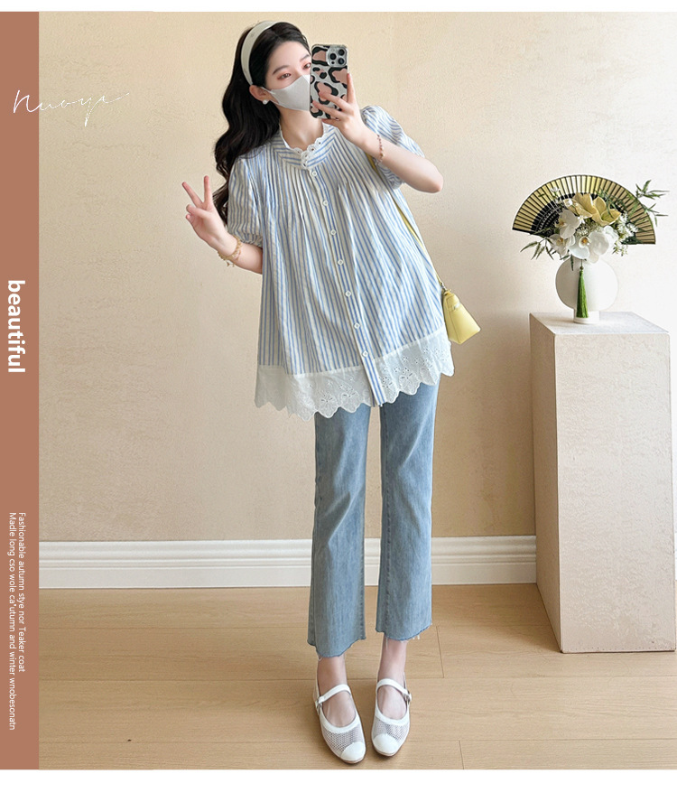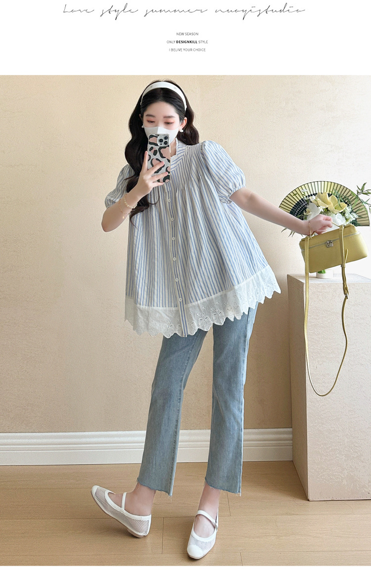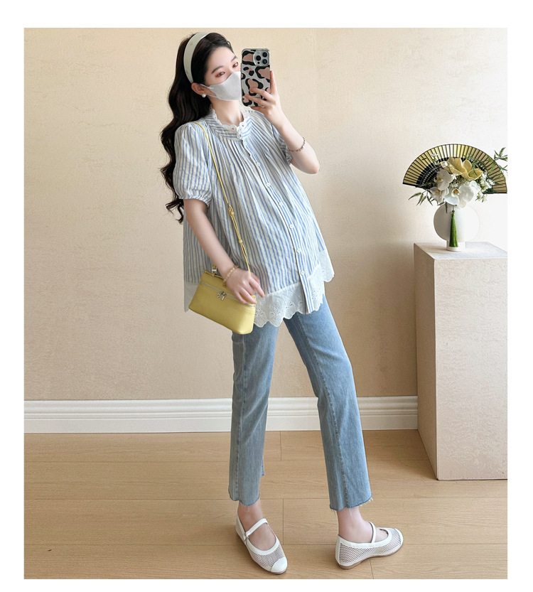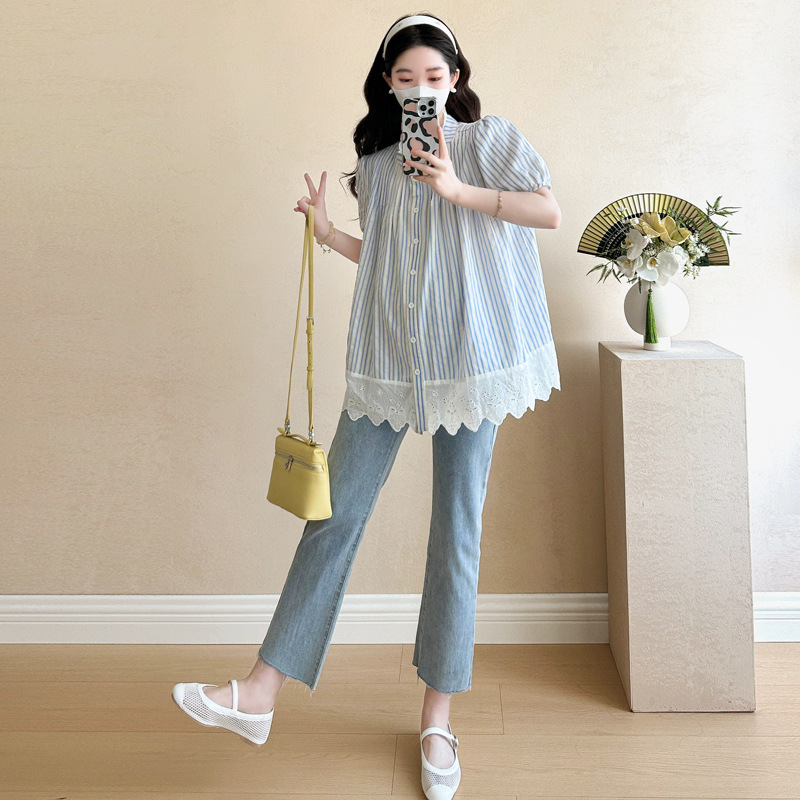 Пятно беременные рубашки летние новые хлопчатобумажные полоски плиссированные жаккардовые сшитые кружева для беременных топы могут открыть для кормления